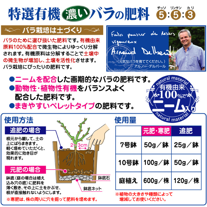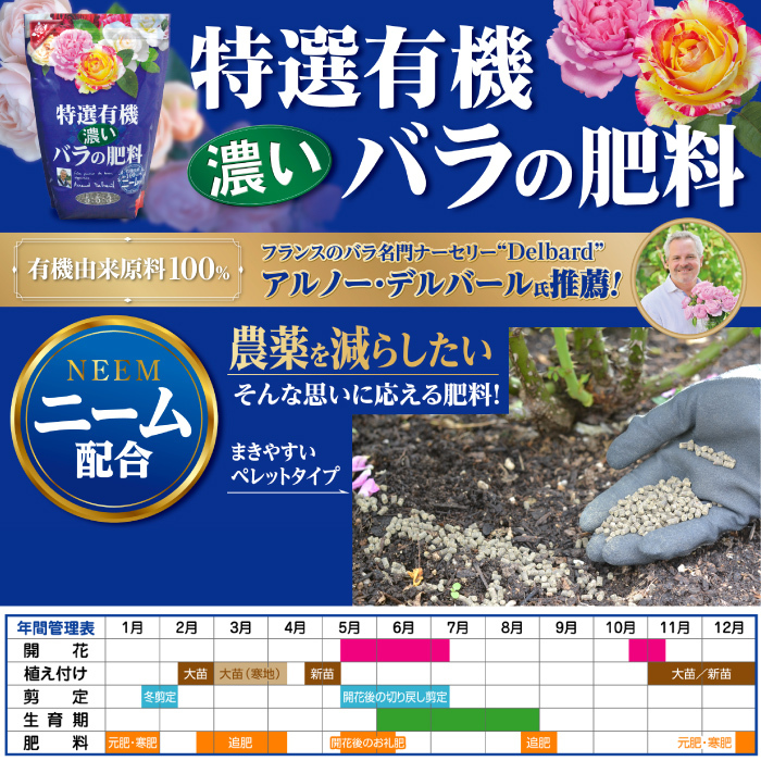 送料無料 特選有機濃いバラの肥料2.5kg  鉢植え バラ 薔薇 有機質 リン酸 デルバール 花ごころ