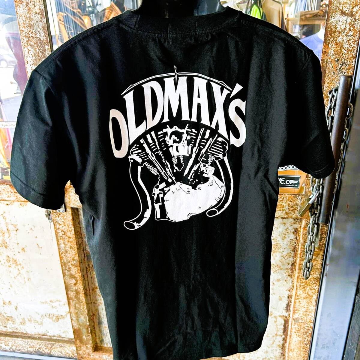 ヴィンテージハーレーダビッドソンカスタムショップOLD MAX'S のTシャツOLD MAX'S ENGINEロゴ、ブラックのボディにホワイトのプリント、前面にロゴ、背面はOLD MAX’S ENGINロゴイラスト。