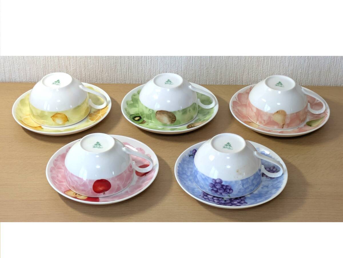 Й★フレッシュモード兼用椀皿★コーヒーカップ★カップ&ソーサー★5客★果物フルーツ柄★陶器★ティーカップ★5柄★茶器★箱入り★1/4★
