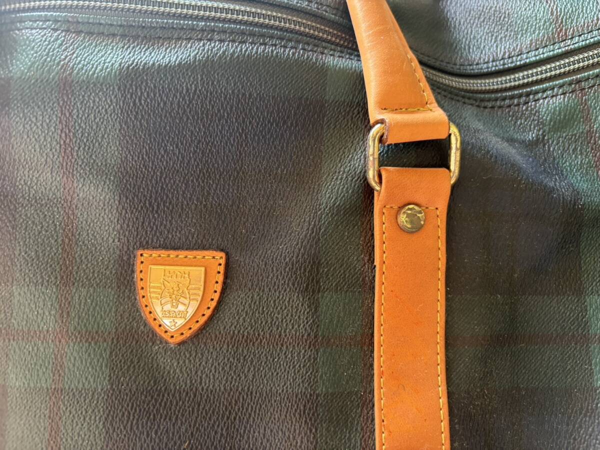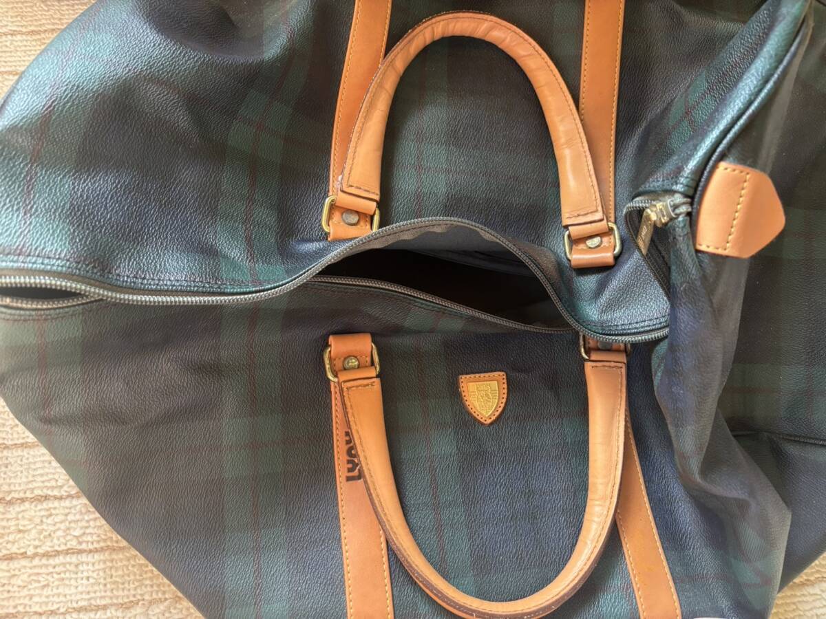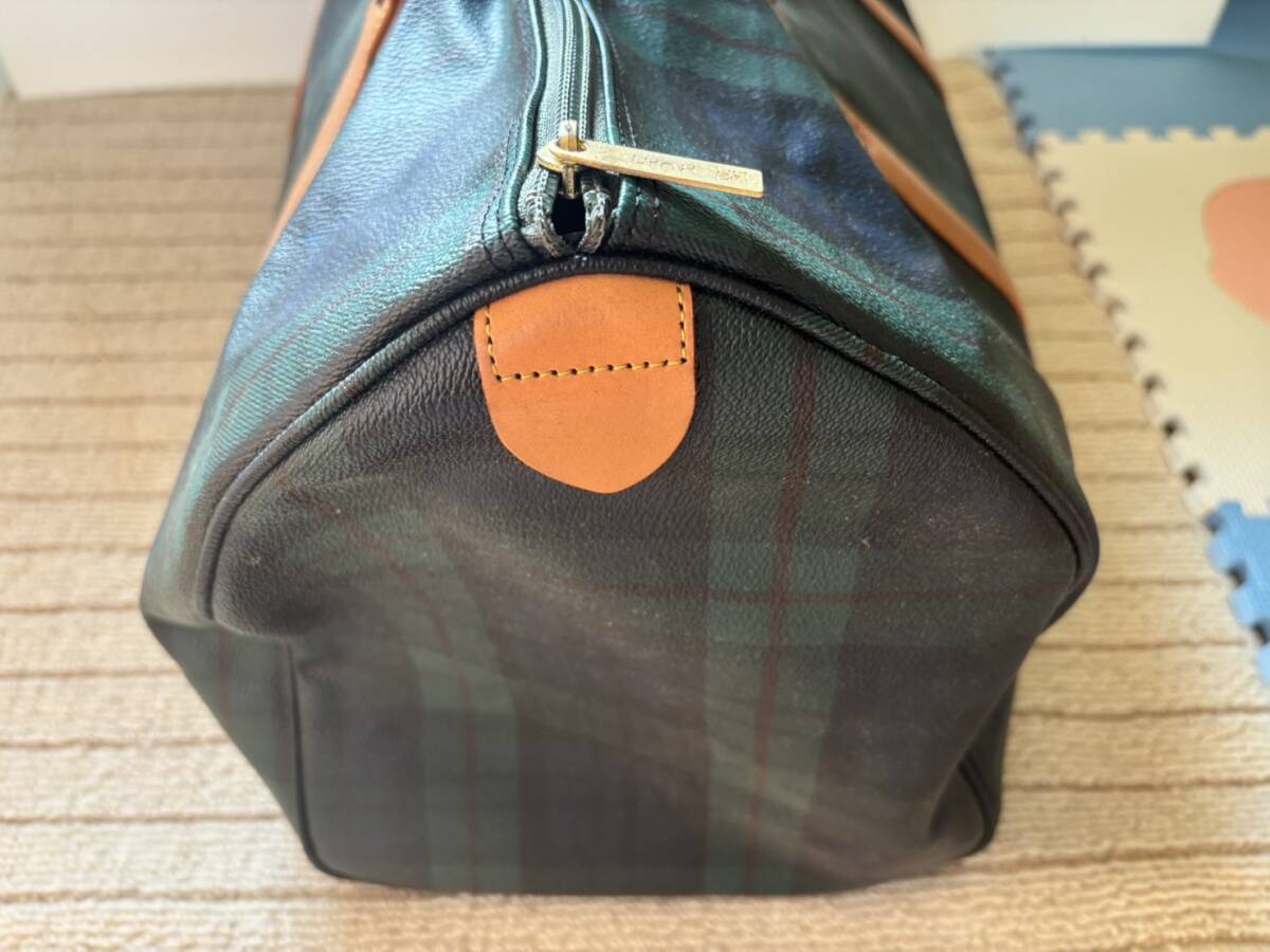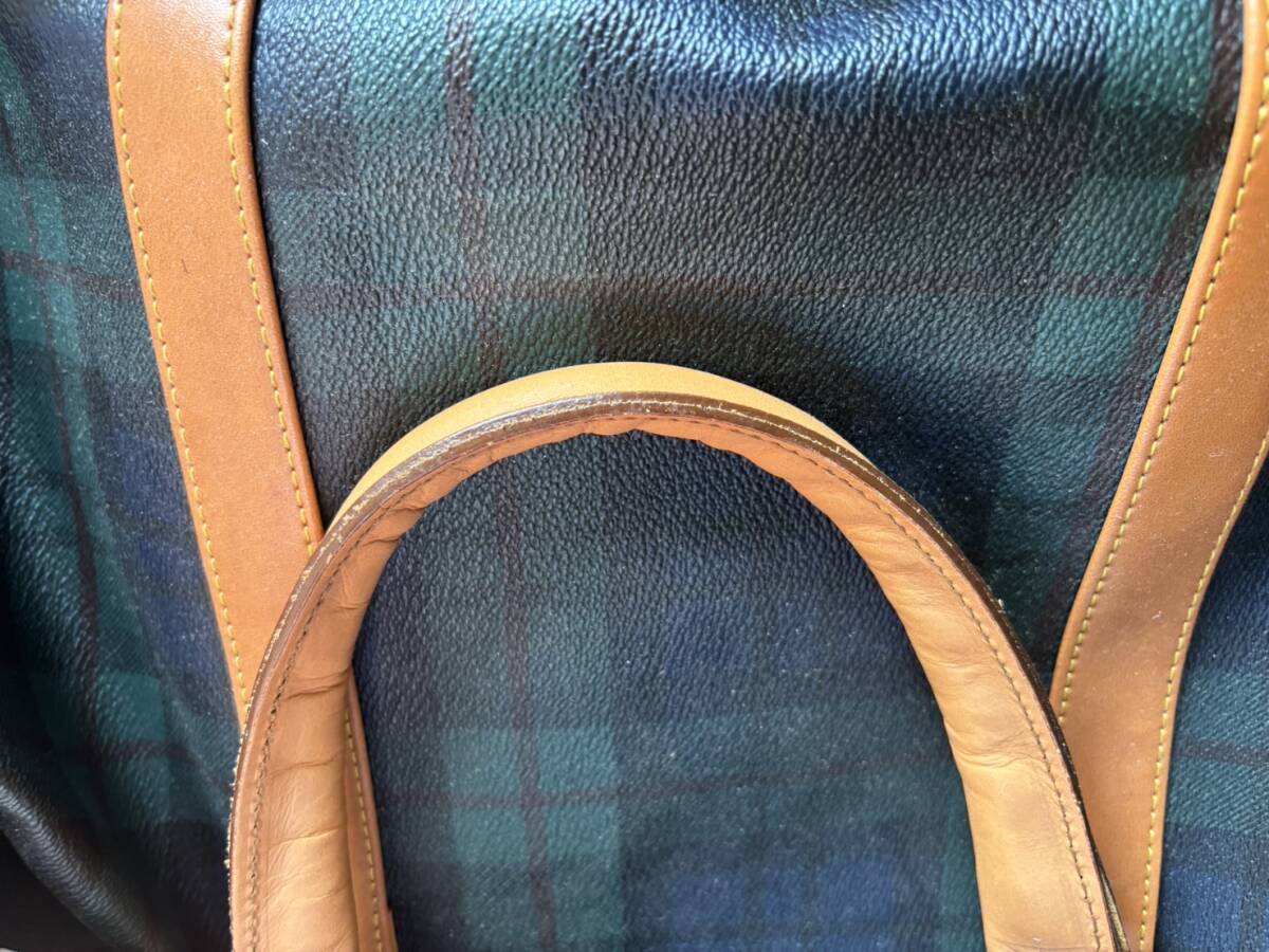 タータンチェックデザインの合成皮革ボストンバッグ。