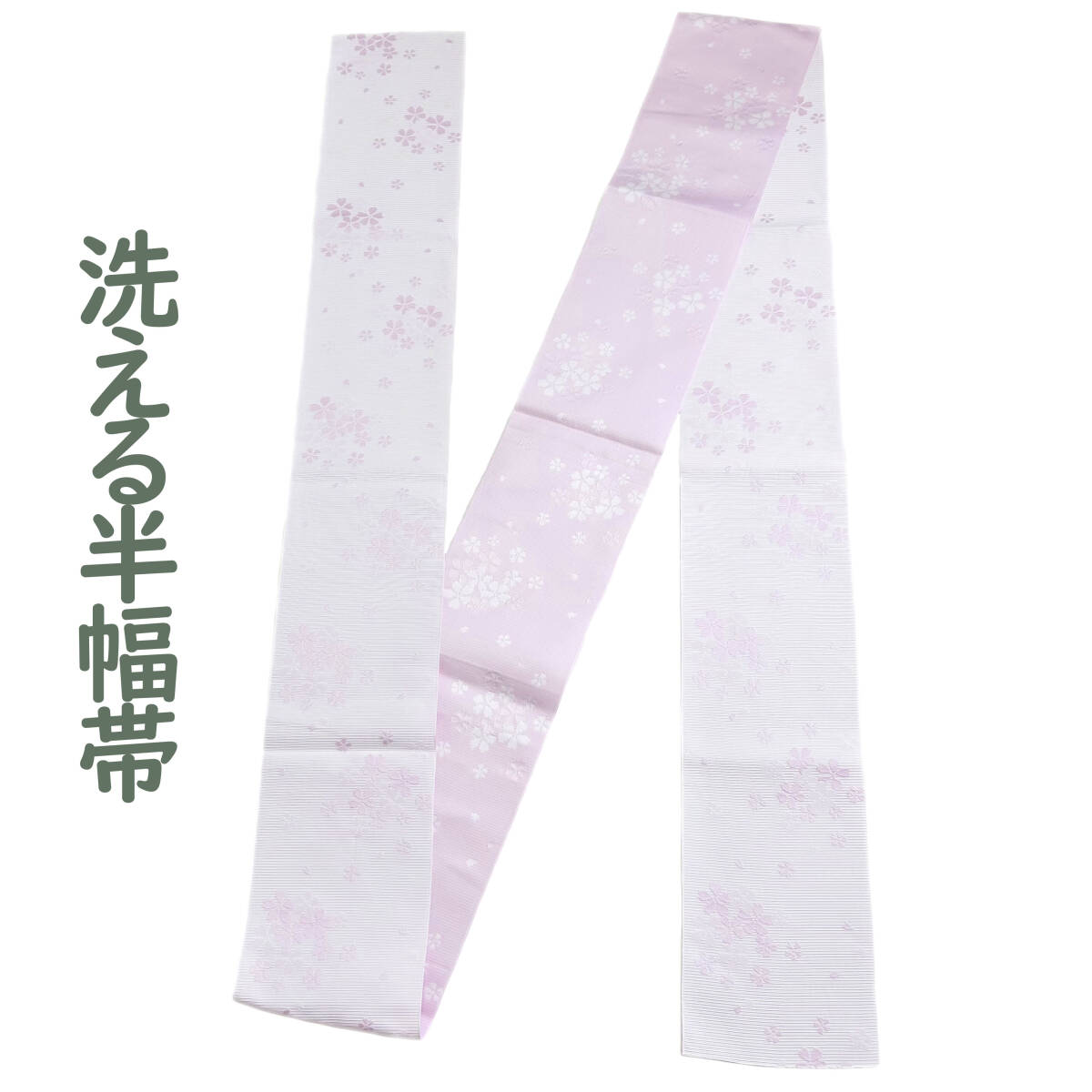 ★半幅帯 半巾帯 全通柄 洗える 桜 桃色 未使用 カジュアル ポリエステル 仕立て上がり 送料無料★