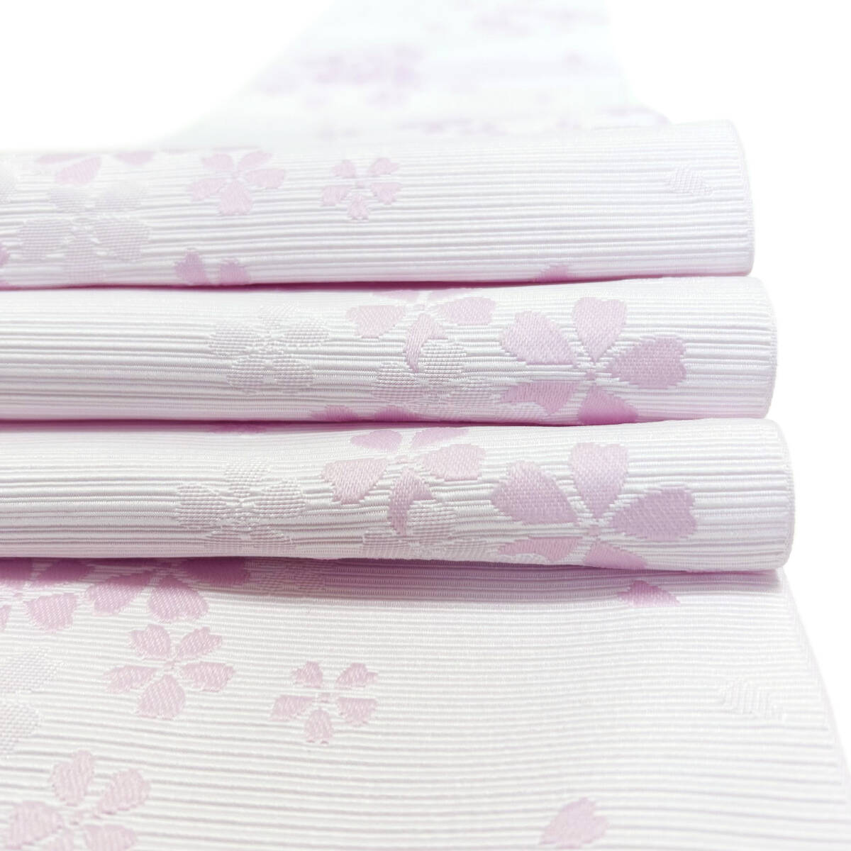 未使用の綺麗なももいろの地に、桜が織り出された可愛い色合いの半幅帯になります。