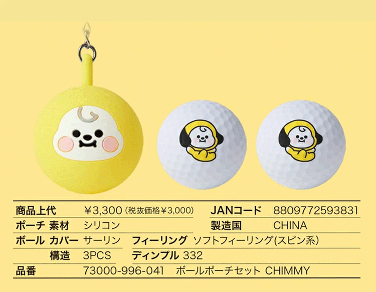 【商品特徴】 <BT21ゴルフアイテム日本初上陸!> ゴルフボールを1個収納できます。バッグにぶら下げるカラビナ付き。 【商品詳細】 ●状態:新品・未使用品 ●セット内容:ボールポーチ×1個、ゴルフボール×2個 ●ボール素材:ポリブタジエン(コア)・サーリン(カバー) ●素材:本体/シリコン 金属部分/スチール ●サイズ:本体/43×50×43 カラビナ/15×60×5(mm) ●重量:本体/16g 金属部分/6g ※撮影時の光量の具合や、ご覧いただいております画面環境によりまして、実際の商品と若干色味が違う場合がございます。 ※商品詳細のスペック値はメーカー表記の数値となりますが、個体差による若干の公差がございます。