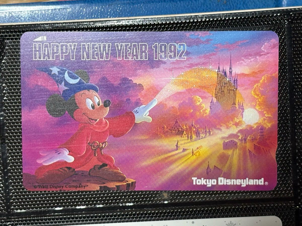 東京ディズニーランドの1992年の新年を祝う限定デザインのテレホンカードです。『ファンタジア』の魔法使い姿のミッキーマウスが、美しい朝焼けの空に魔法をかける幻想的なビジュアルが魅力。「HAPPY NEW YEAR 1992」の文字が入った記念性の高い一枚で、コレクターズアイテムとしても非常に人気です。