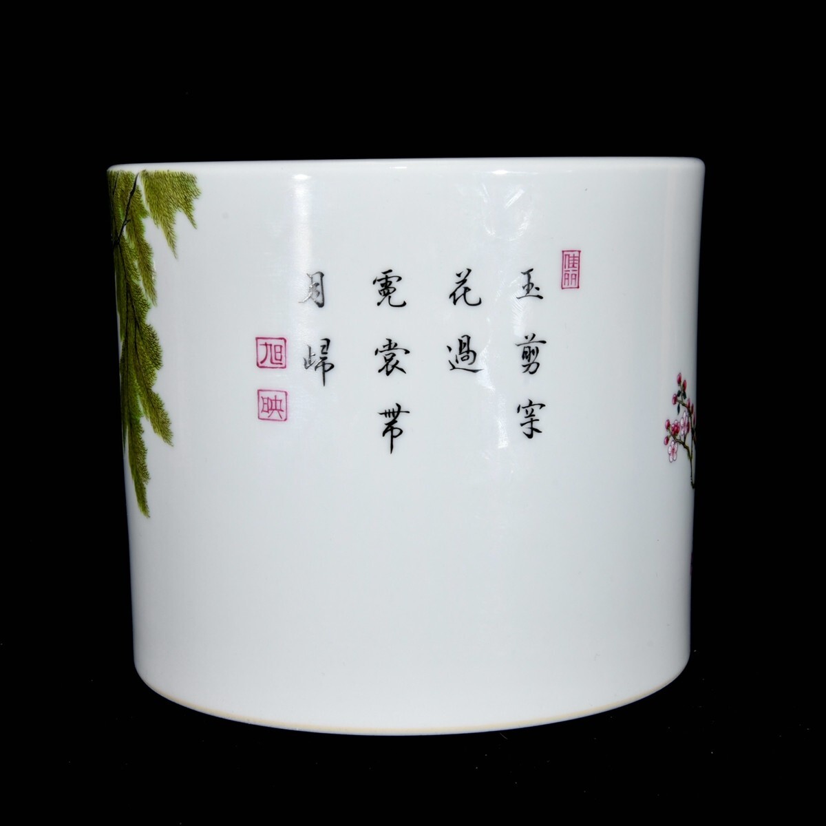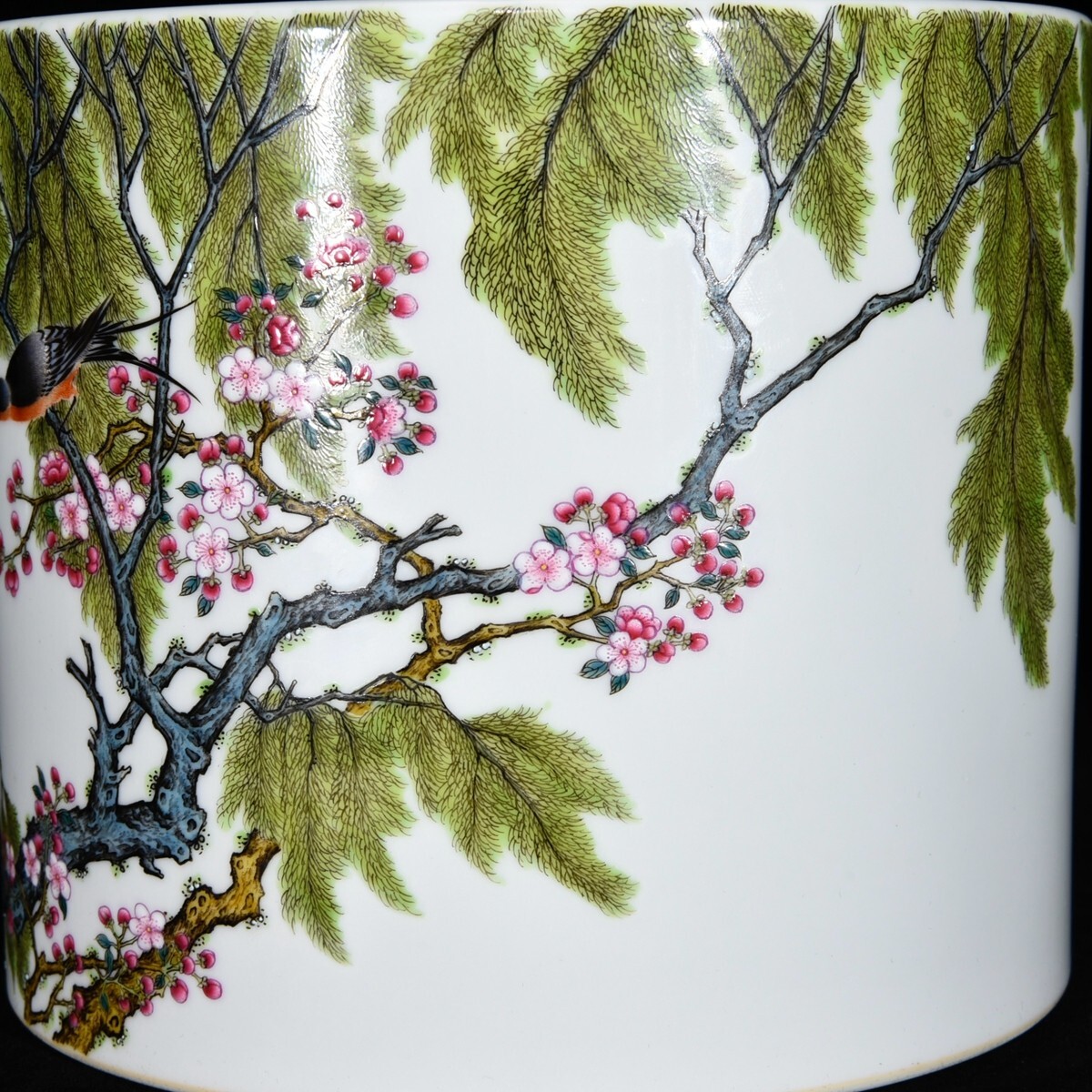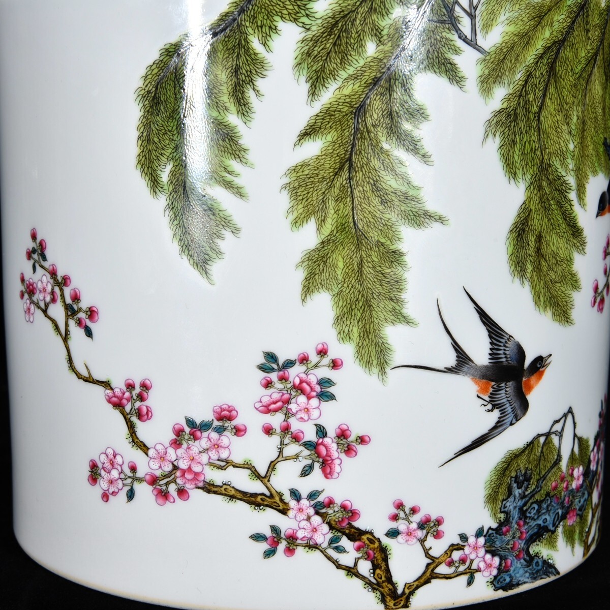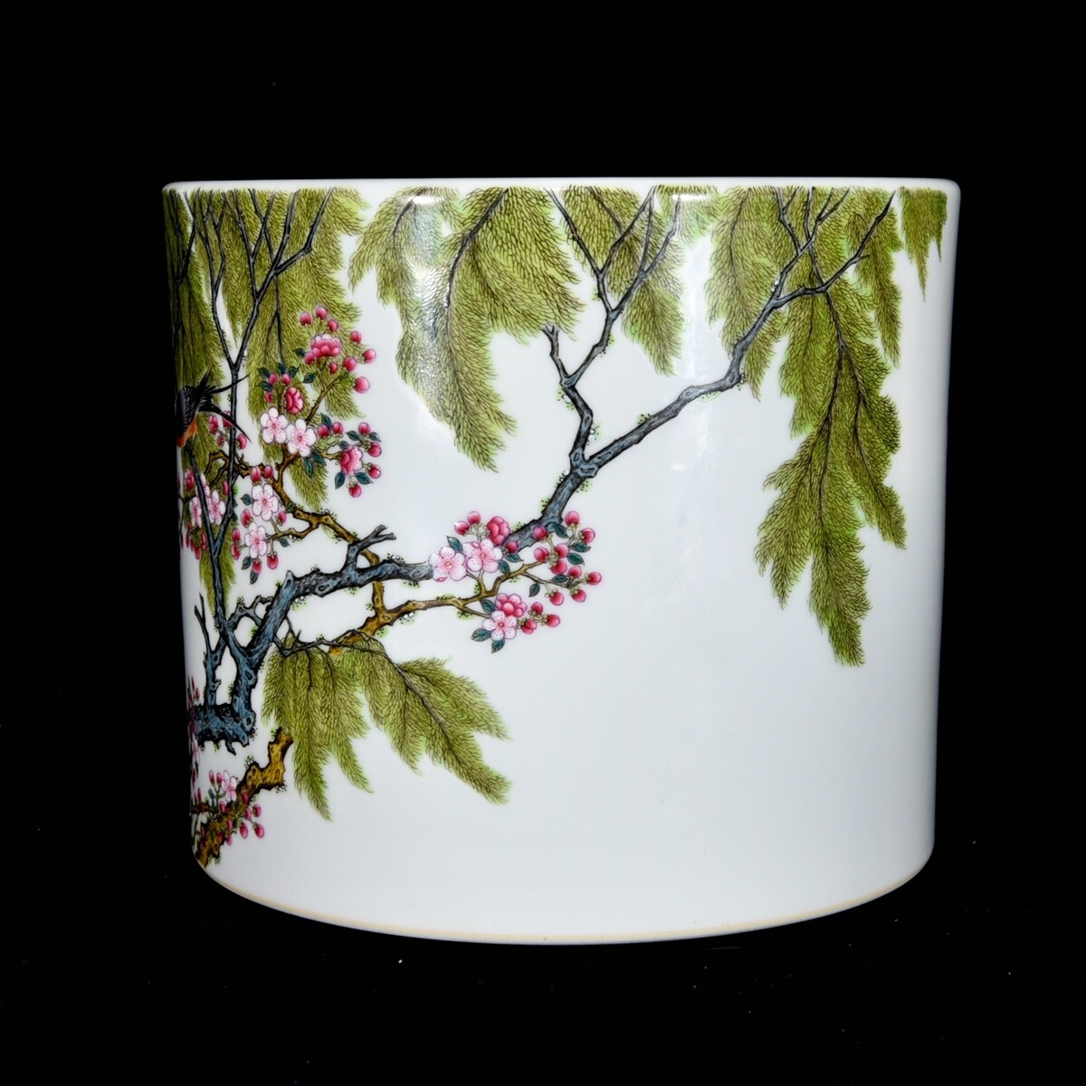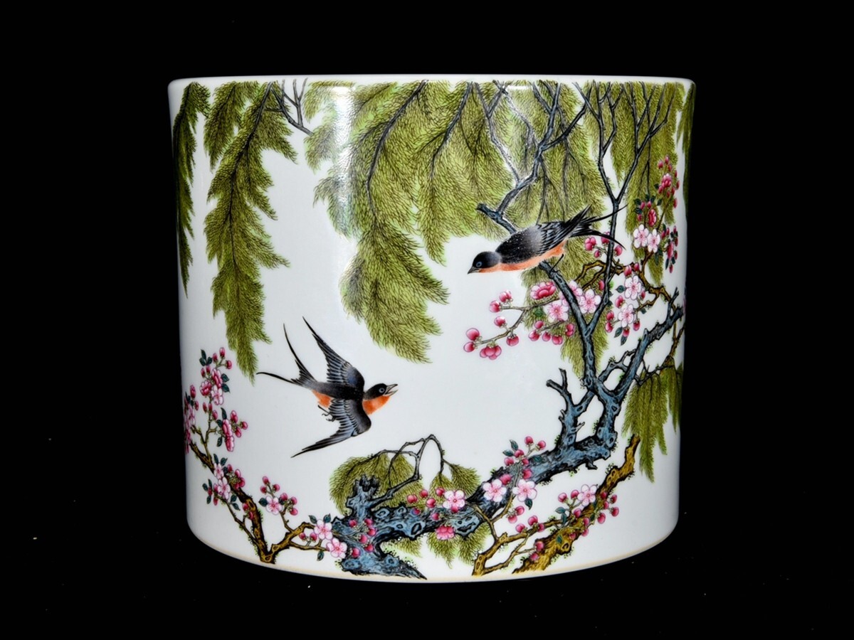 「清 雍正年製 陶磁器 琺瑯彩柳燕紋 筆筒」染付 置物 擺件 古賞物 中国古美術 旧蔵出