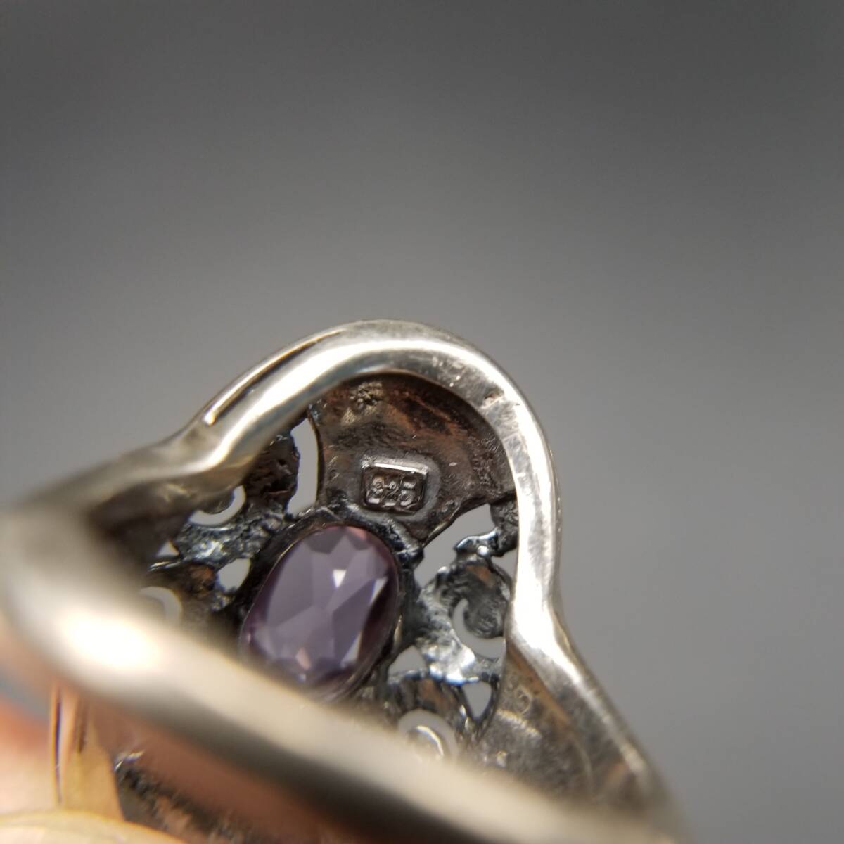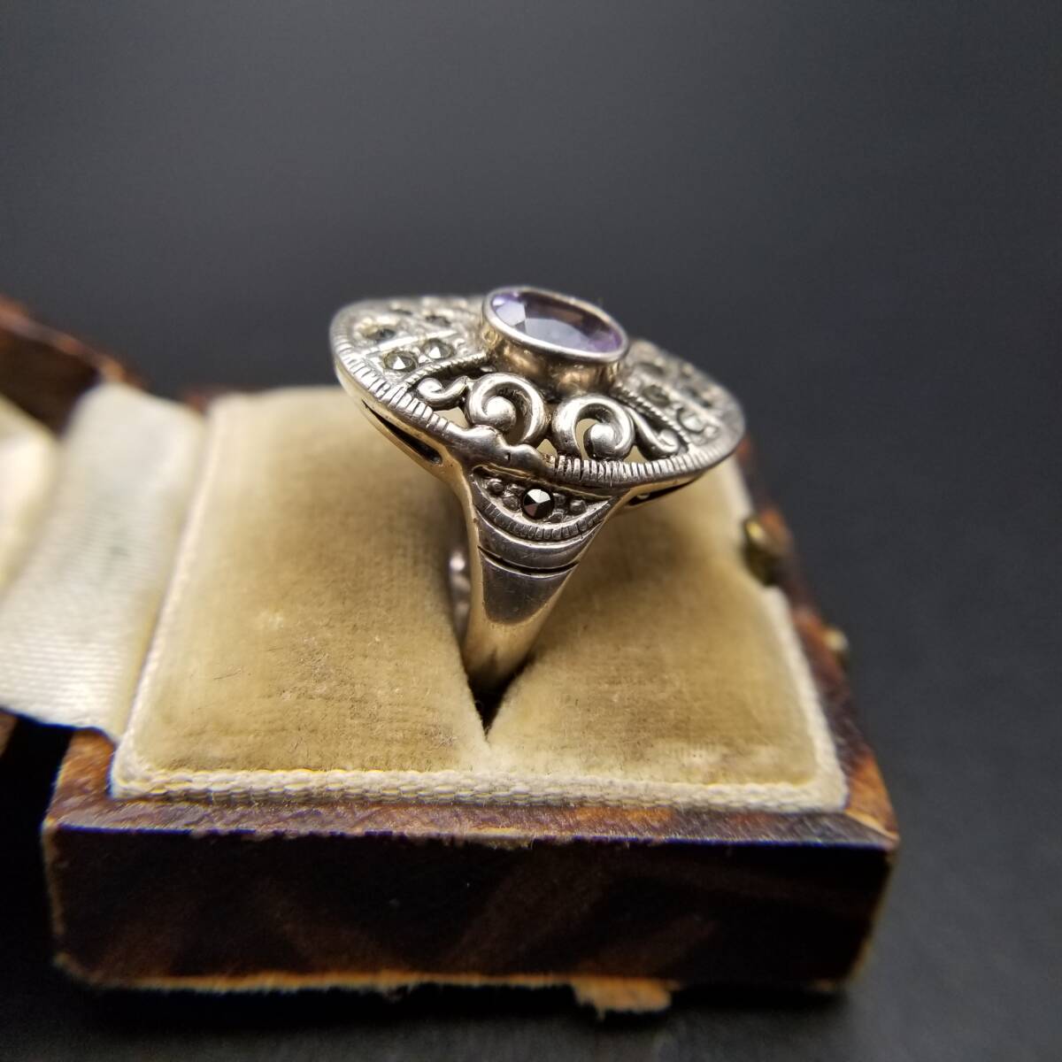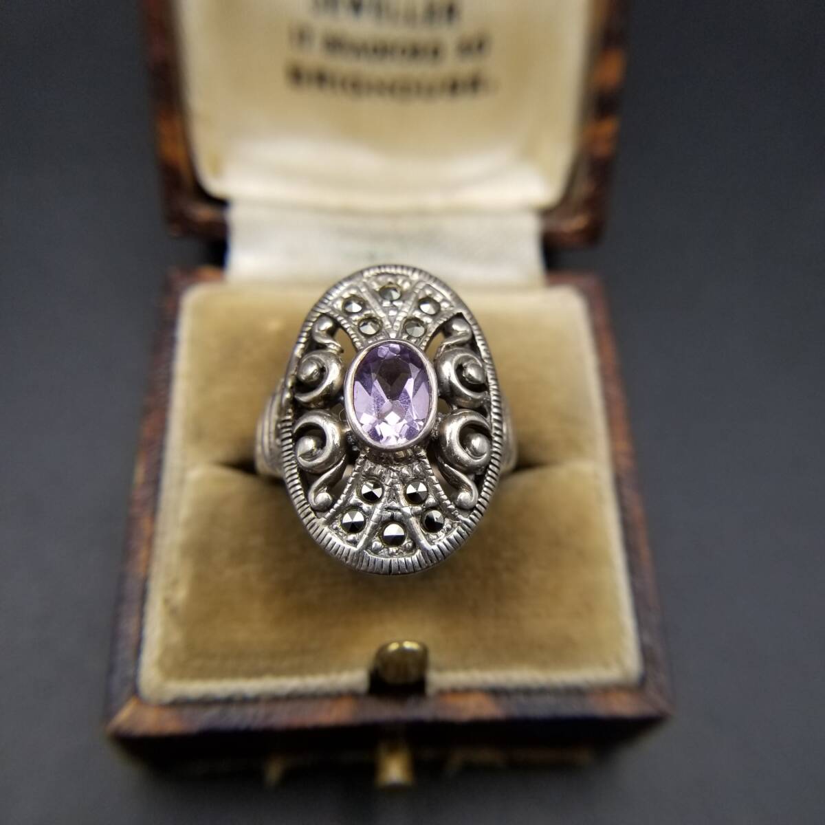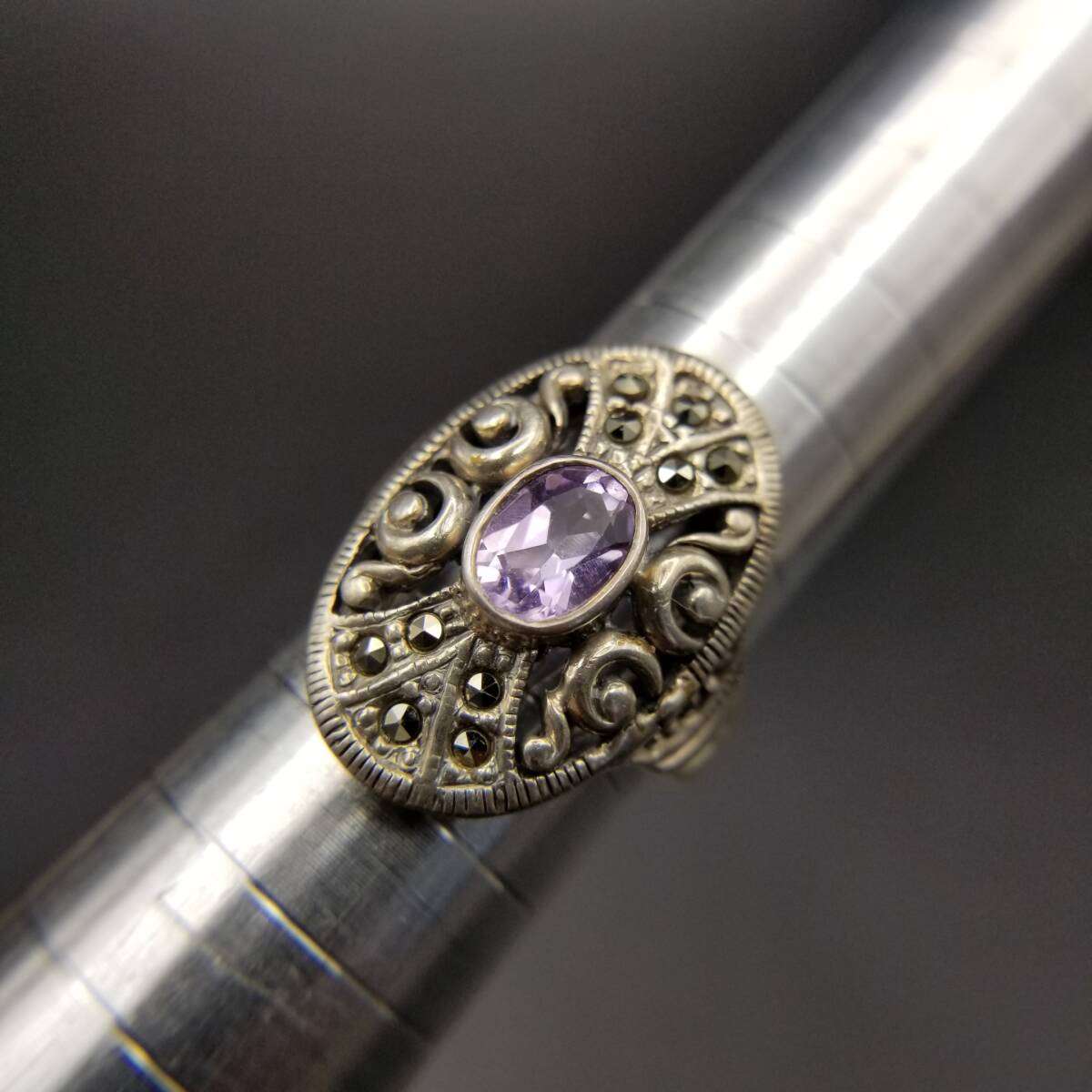 アメジスト マーカサイト 装飾 オーバル ヴィンテージ リング 925 シルバー 銀 指輪 透かし 曲線美 オープンワーク エレガント R15-V