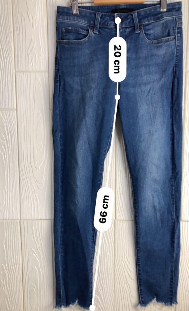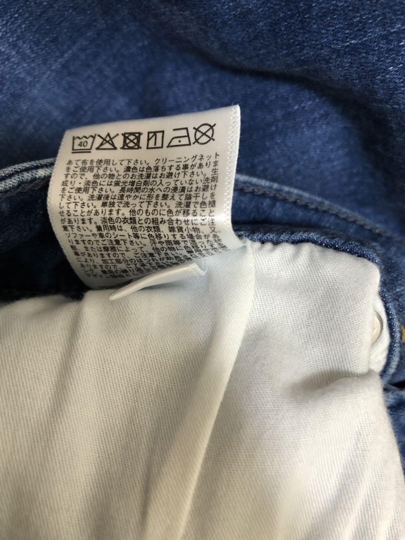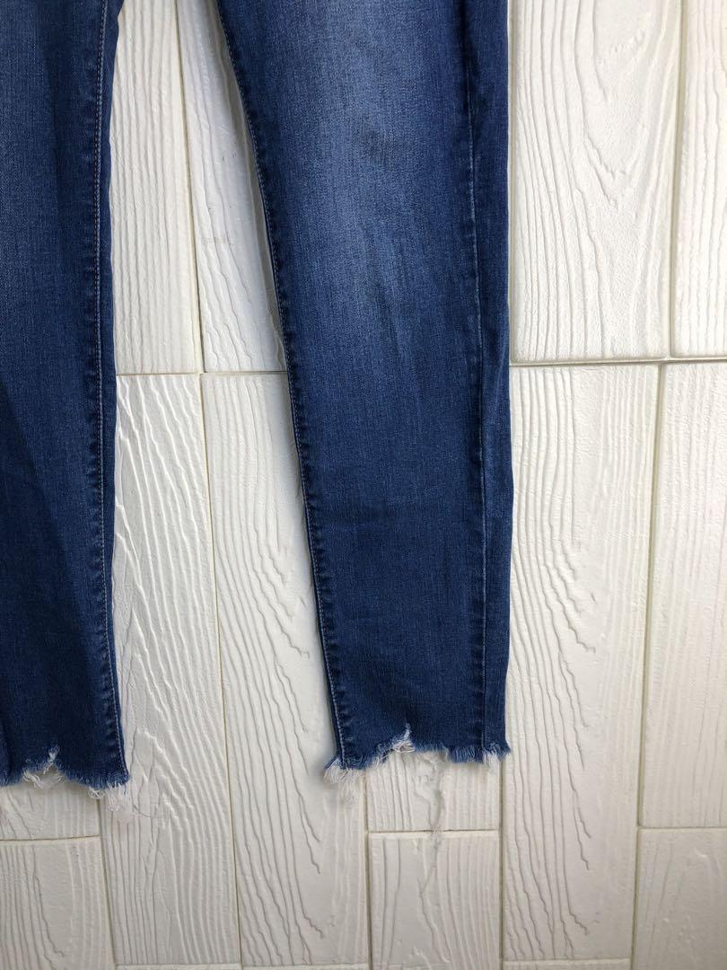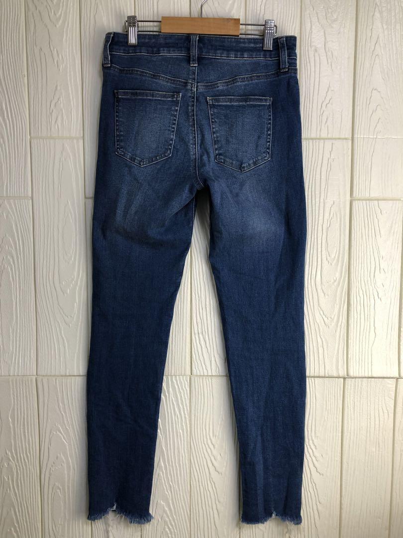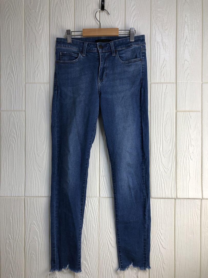 フリンジ裾デザインのブルーデニム、スタイリッシュで快適なフィット感。