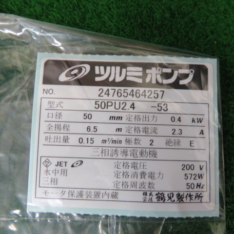 型式:50PU2.4-53 メーカー:鶴見製作所 【仕様】 口径:50mm 定格出力:0.4kW 全揚程:6.5m 吐出量:0.15m3/min 定格電圧:三相200V 周波数:50Hz 2023年製 開封済み、外箱痛みありの保管品となります。 未使用品ではございますが、保管中のキズ・汚れ等はご容赦下さい。 画像の物が全てになります。 他に付属品等はございません。 上記の事をご理解・ご了承の上で ご入札をお願い致します。 その他 ご不明な点等ございましたら ご入札前に お気軽に ご質問下さい。 オークション終了日 当日は 午後5時迄に ご質問は お願い致します。 夕方以降に ご質問等 お問い合わせ頂きましても お応えするのが 翌営業時間中になりますので ご了承ください。 *詳細につきまして ご質問されましても お答えできない場合もございます。 |