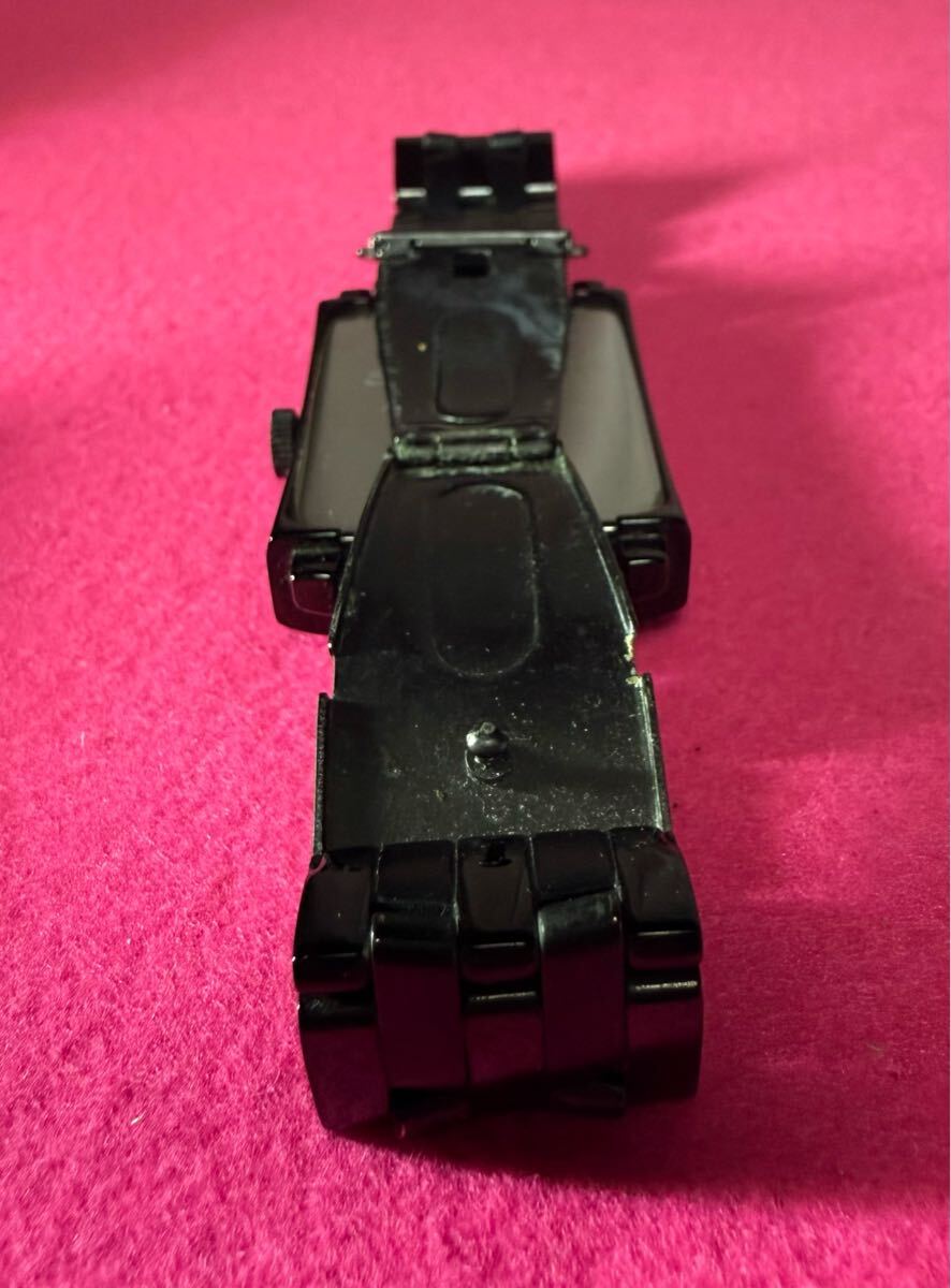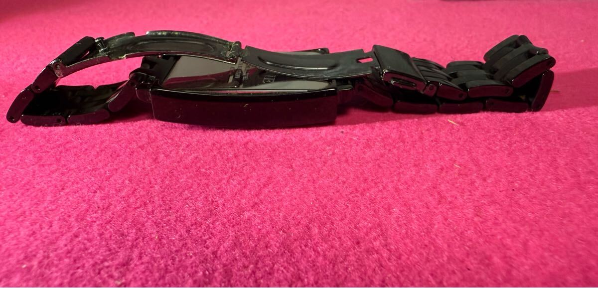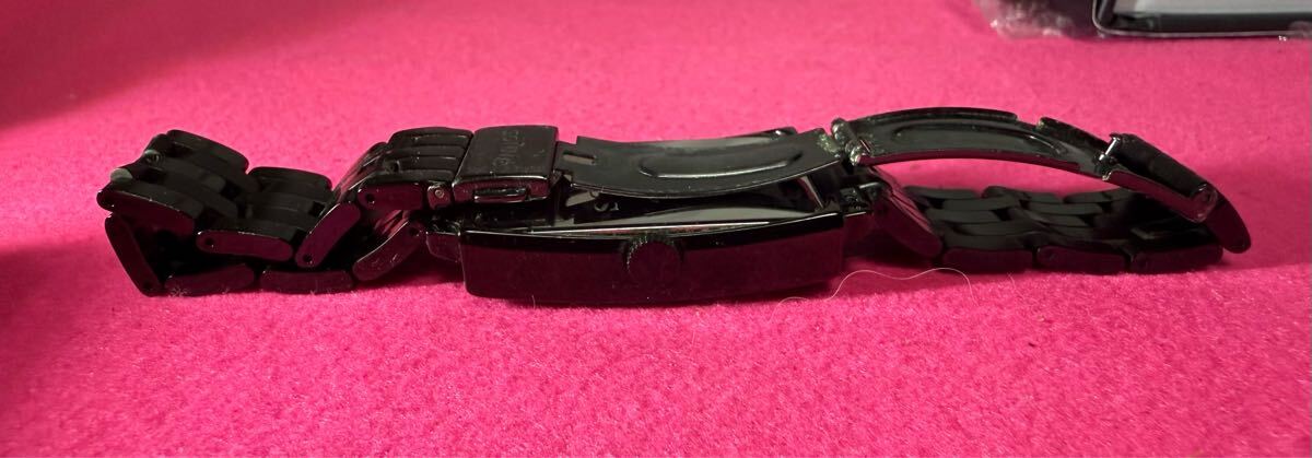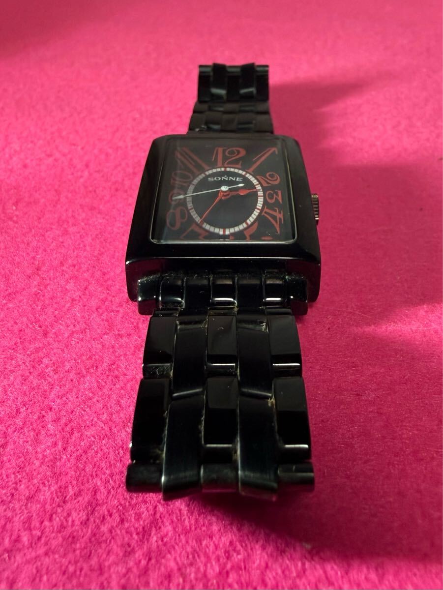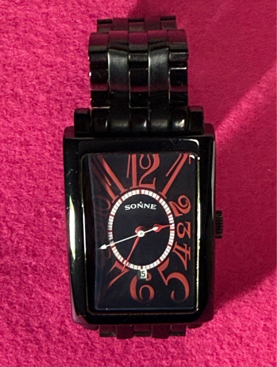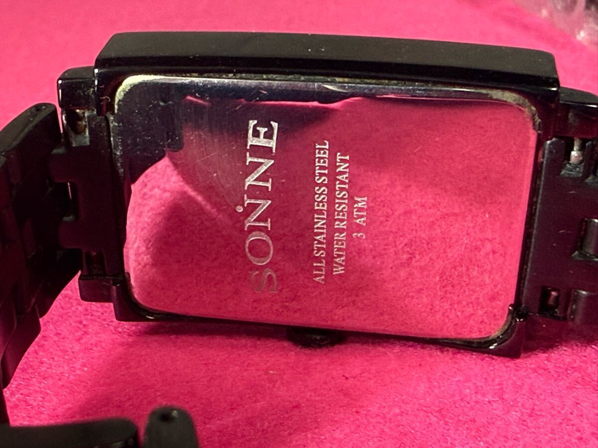 見た目中華製のように見えますがSONNEという日本の専業メーカーです。現在では機械式腕時計のメーカーとして名を馳せてますが、かつてはクオーツもありました。特徴はフランクミュラーばりの文字盤です。ベルトも含めて分厚いブラック塗装されておりますが、マテリアル素材はステンレスですの錆に強いです。裏に3ATOMと刻印されていますので、3気圧の生活防水です。現在は電池切れで動作はストップしています。気になるベルトですが、リスト周り17cm以下の方のみ入札を検討して下さい。ベルトのコマがありませんので、大きくすることができません。もちろんベルト交換という方法は残っていますが、オリジナルのベルトの良さが失われます。