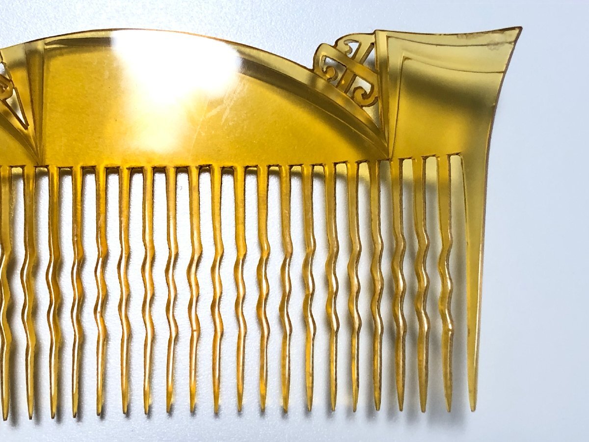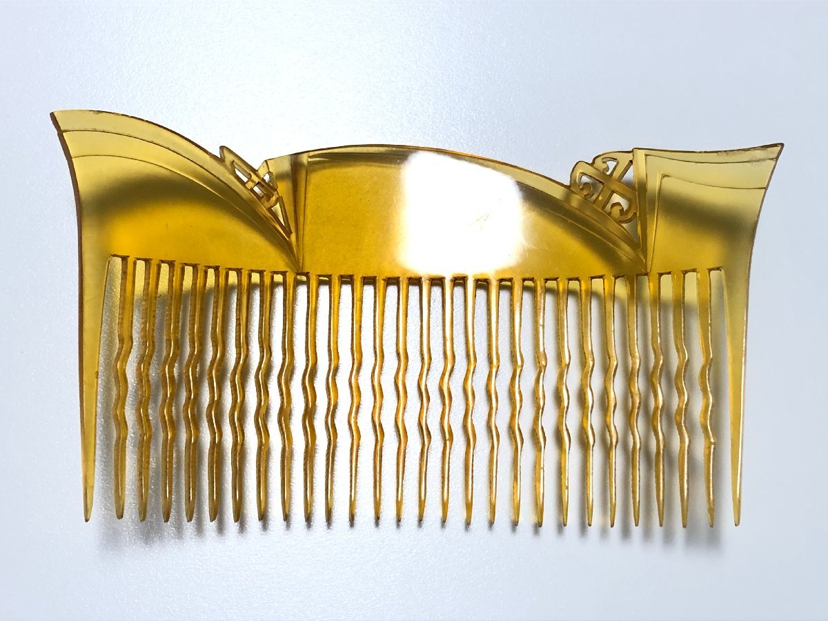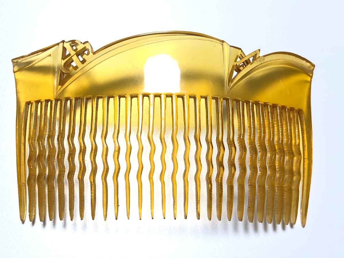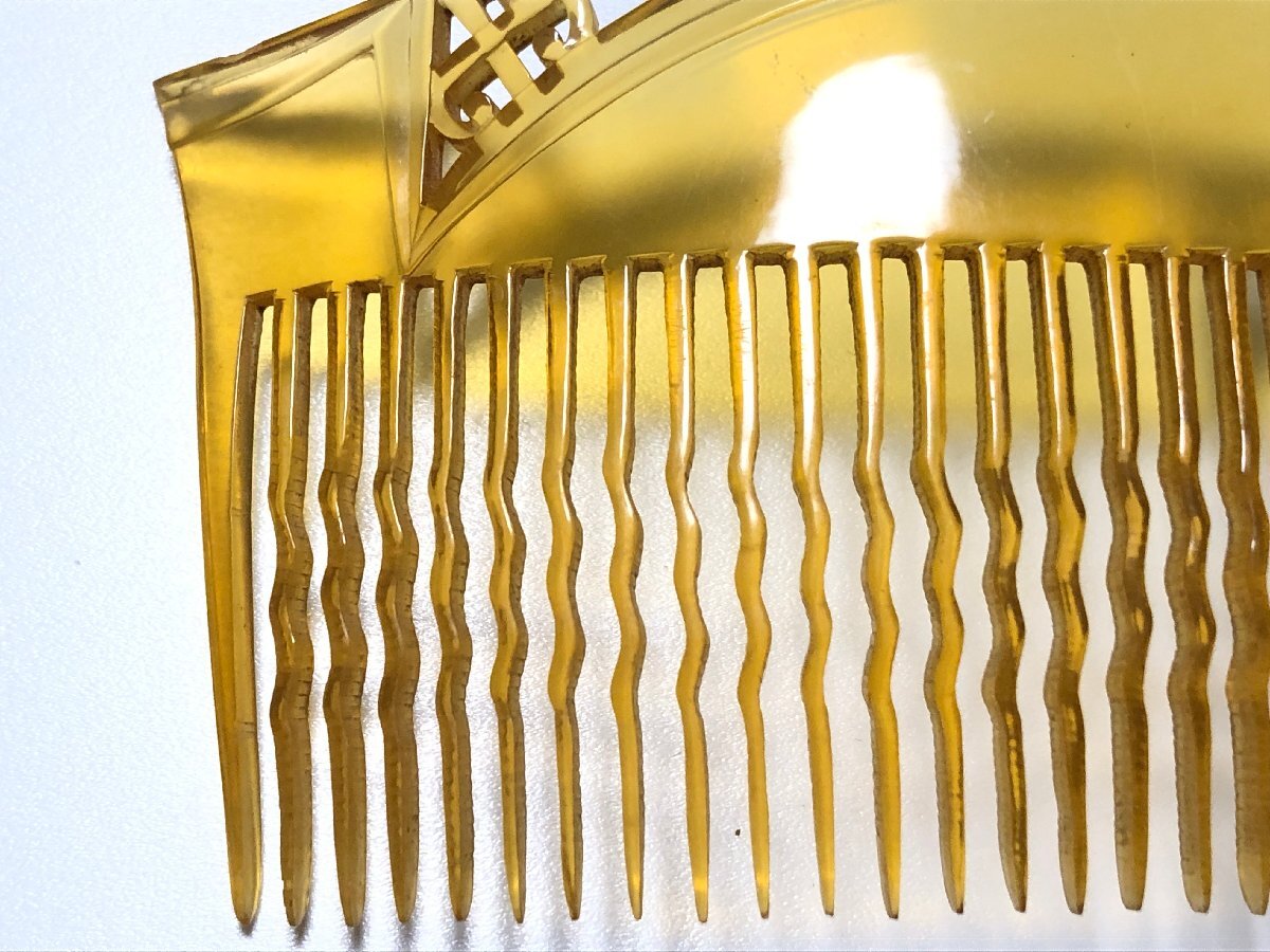 アンティークの白甲の本鼈甲を使用した、透かし細工のデザイン櫛です。鼈甲部分に若干の細かな虫食いがあります。