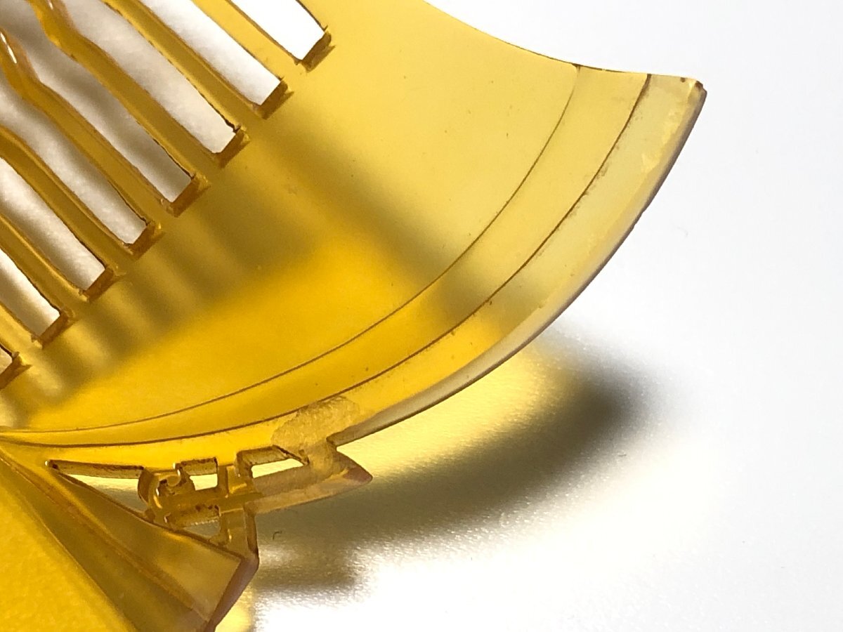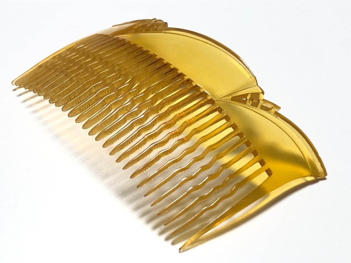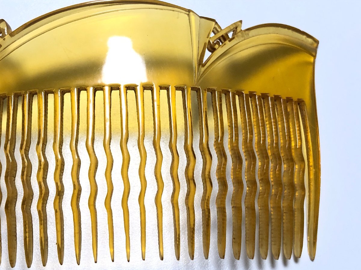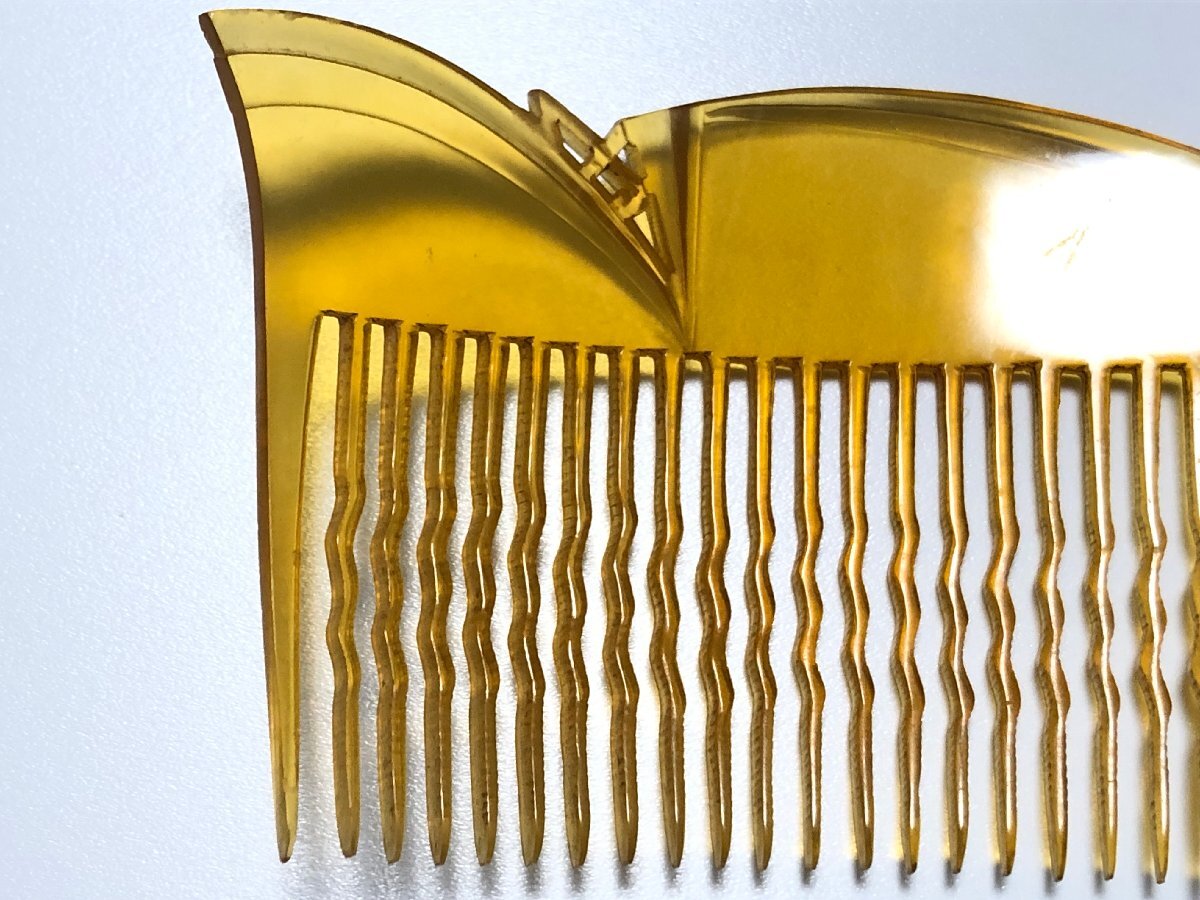 アンティークの白甲の本鼈甲を使用した、透かし細工のデザイン櫛です。鼈甲部分に若干の細かな虫食いがあります。