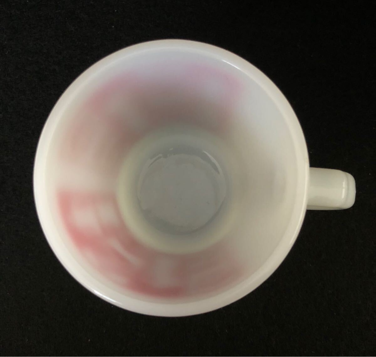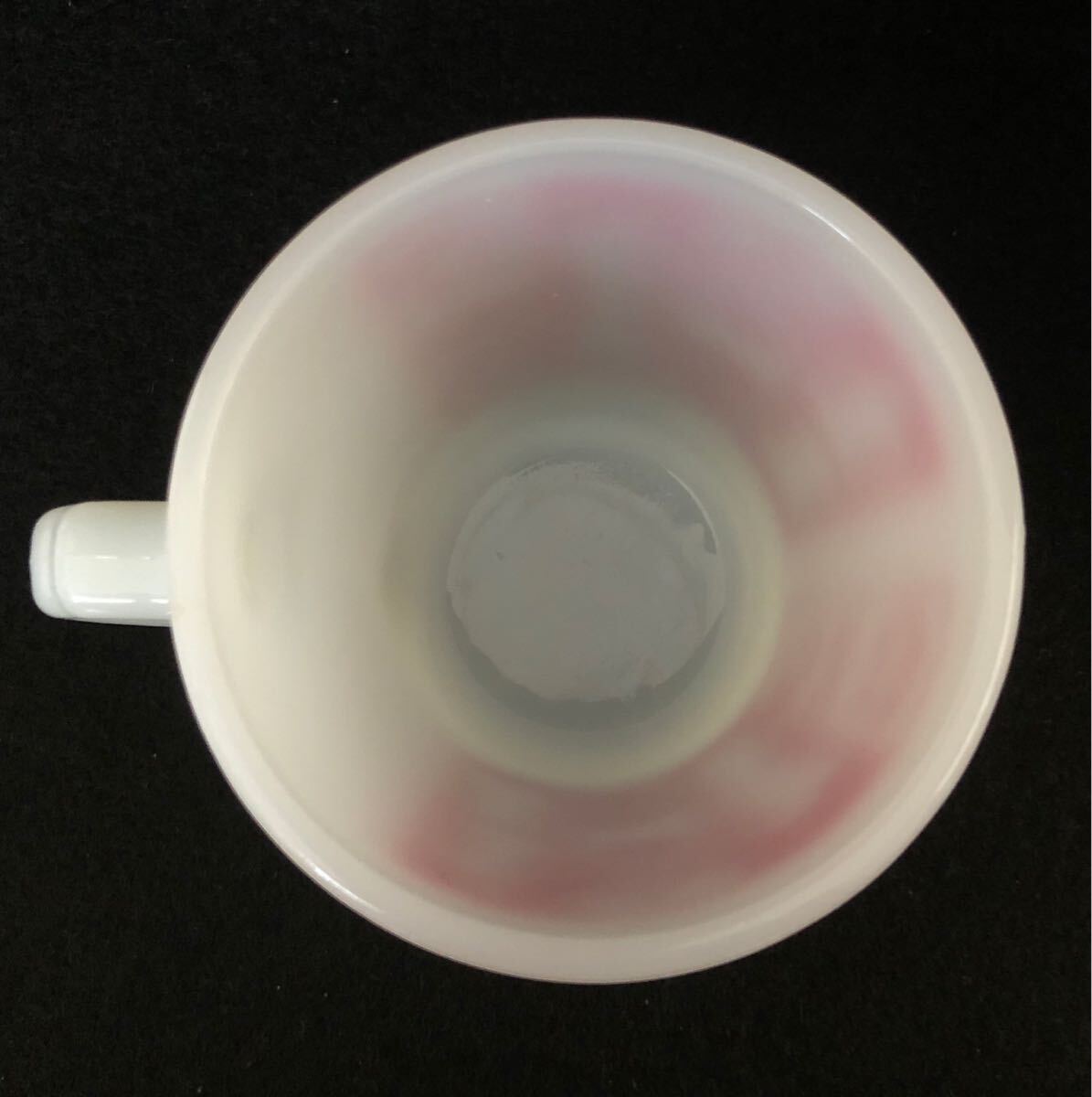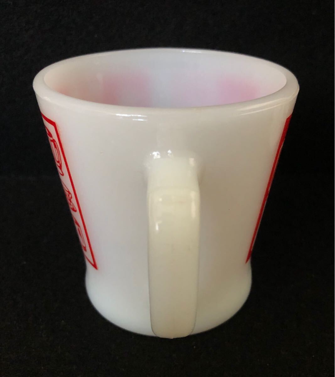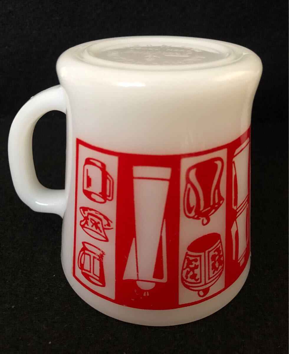 キッチンのプリントはしっかりしていますが一部に薄いキズがあります。内側底部と外側底部のキズはガラスの練り切り跡だと思います。全体に割れ、ヒビ、カケ、スポット無く、ツヤがあり、とても良いマグカップです。