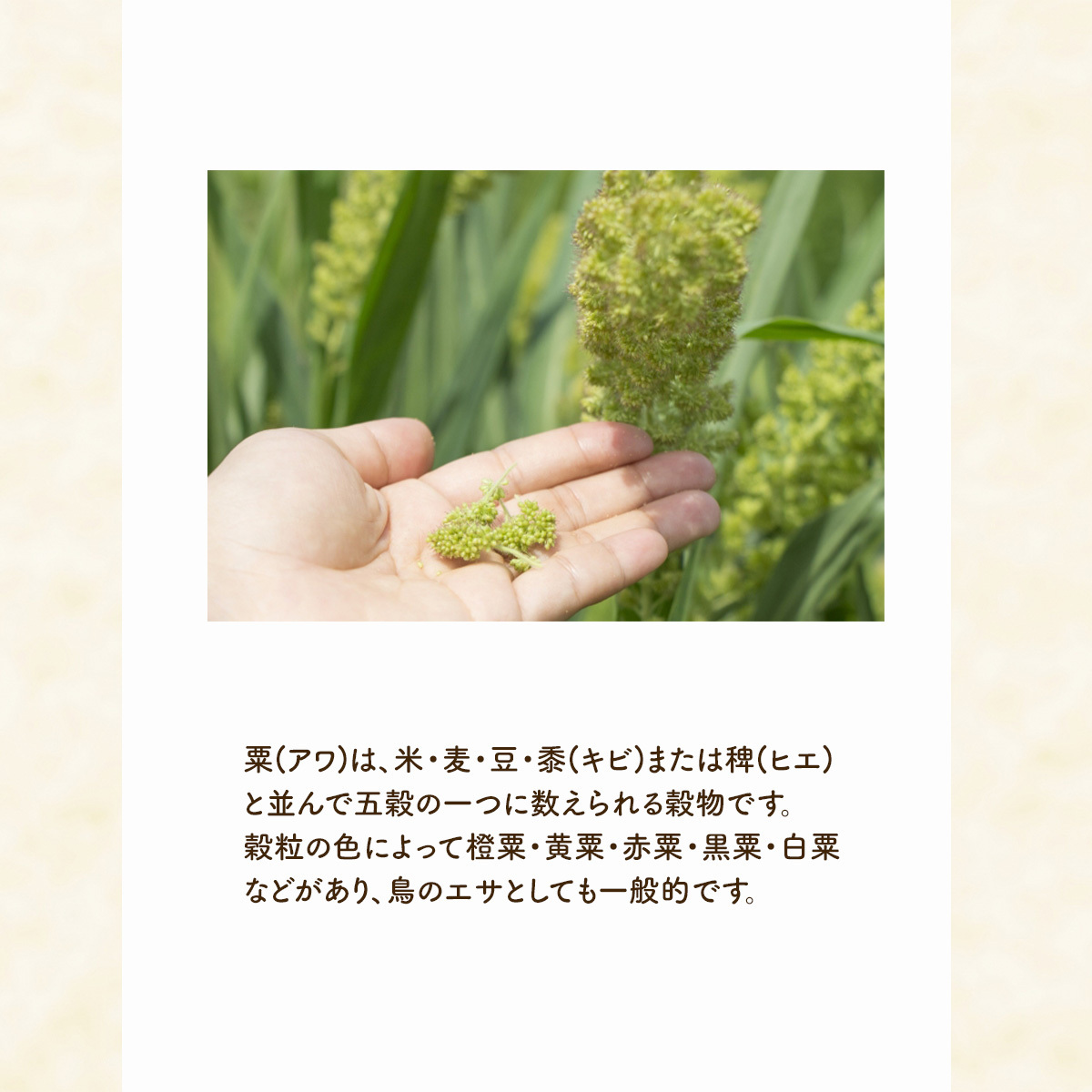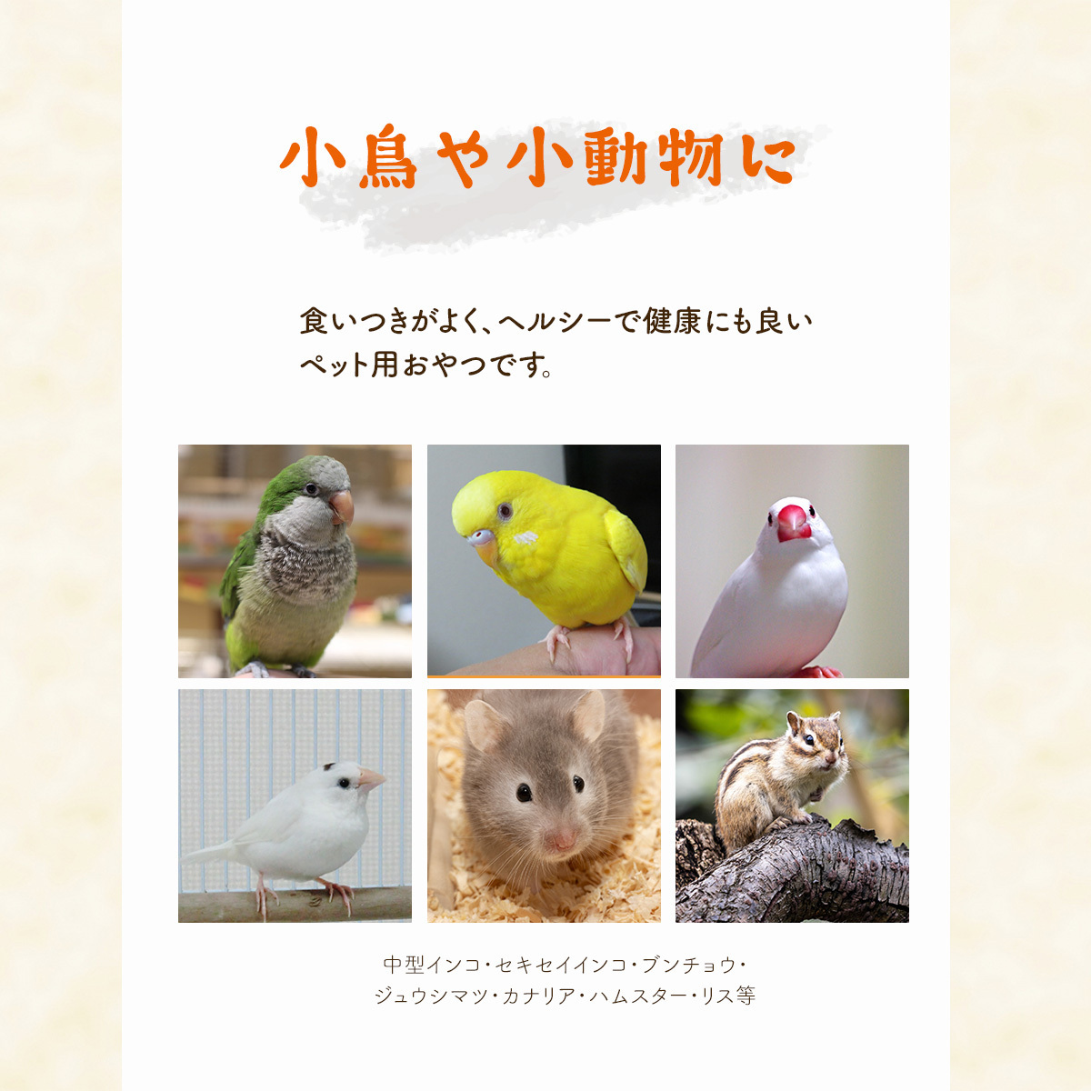 説明 | 天然無添加の穂付き赤粟です。 ヘルシーで喰い付きの良い赤粟を穂付きで。 喰い付きが良く、健康にも良いおやつです。 対象:中型インコ セキセイインコ ブンチョウ ジュウシマツ カナリア ハムスター リス等 |