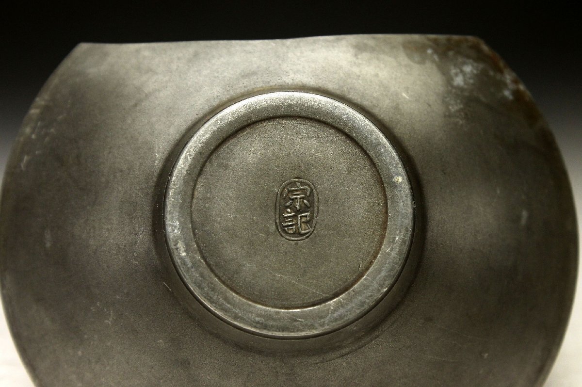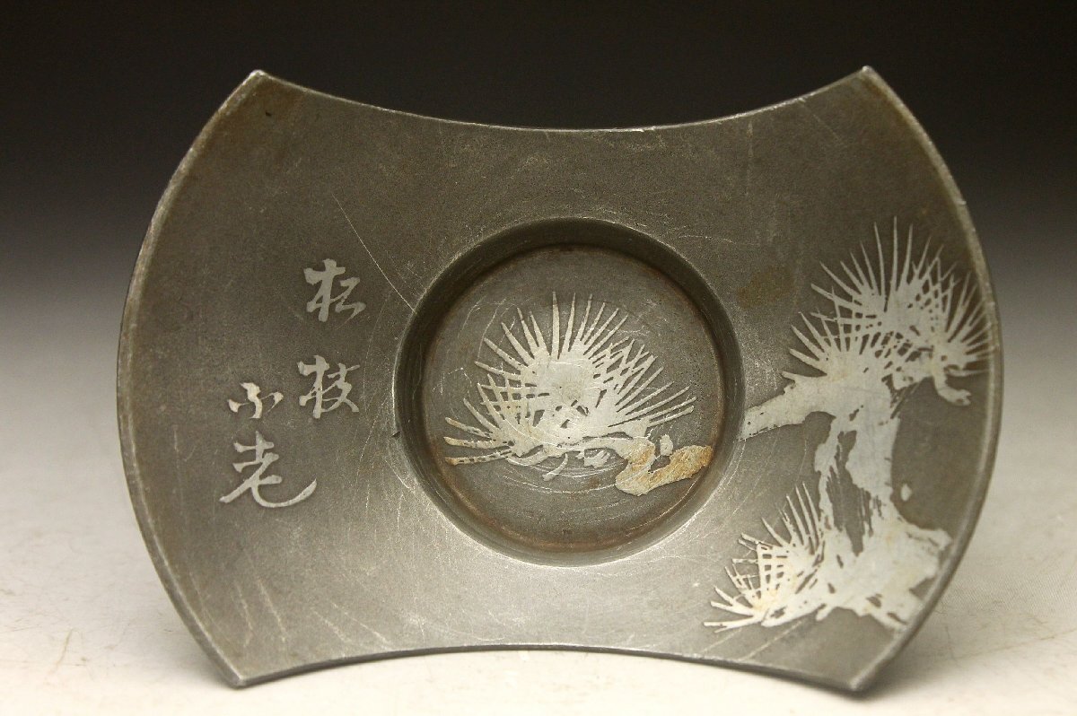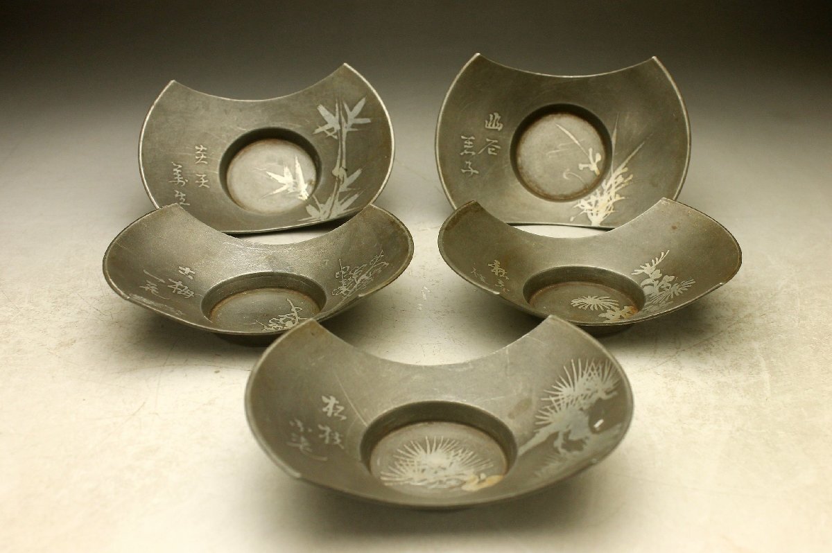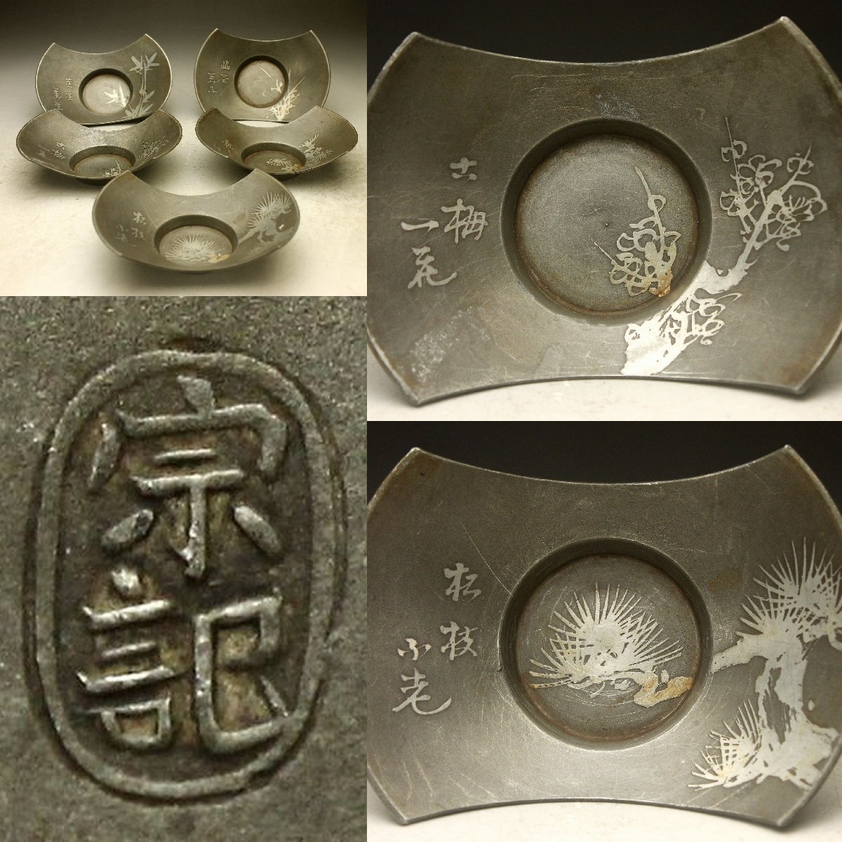 【余韻】 煎茶道具 中国 古錫「宗記」銘 錫茶托 五君子絵替 分銅 茶托揃(5客)★無傷美品<同梱可>