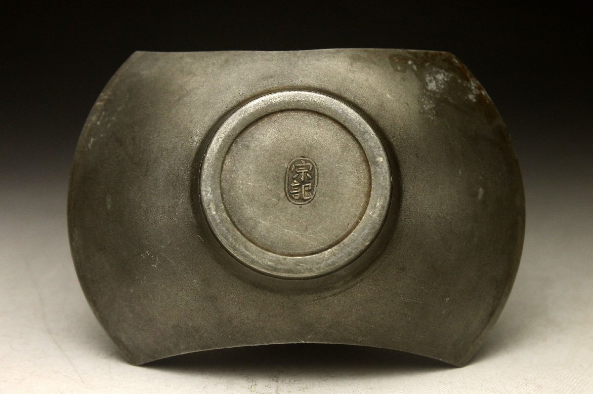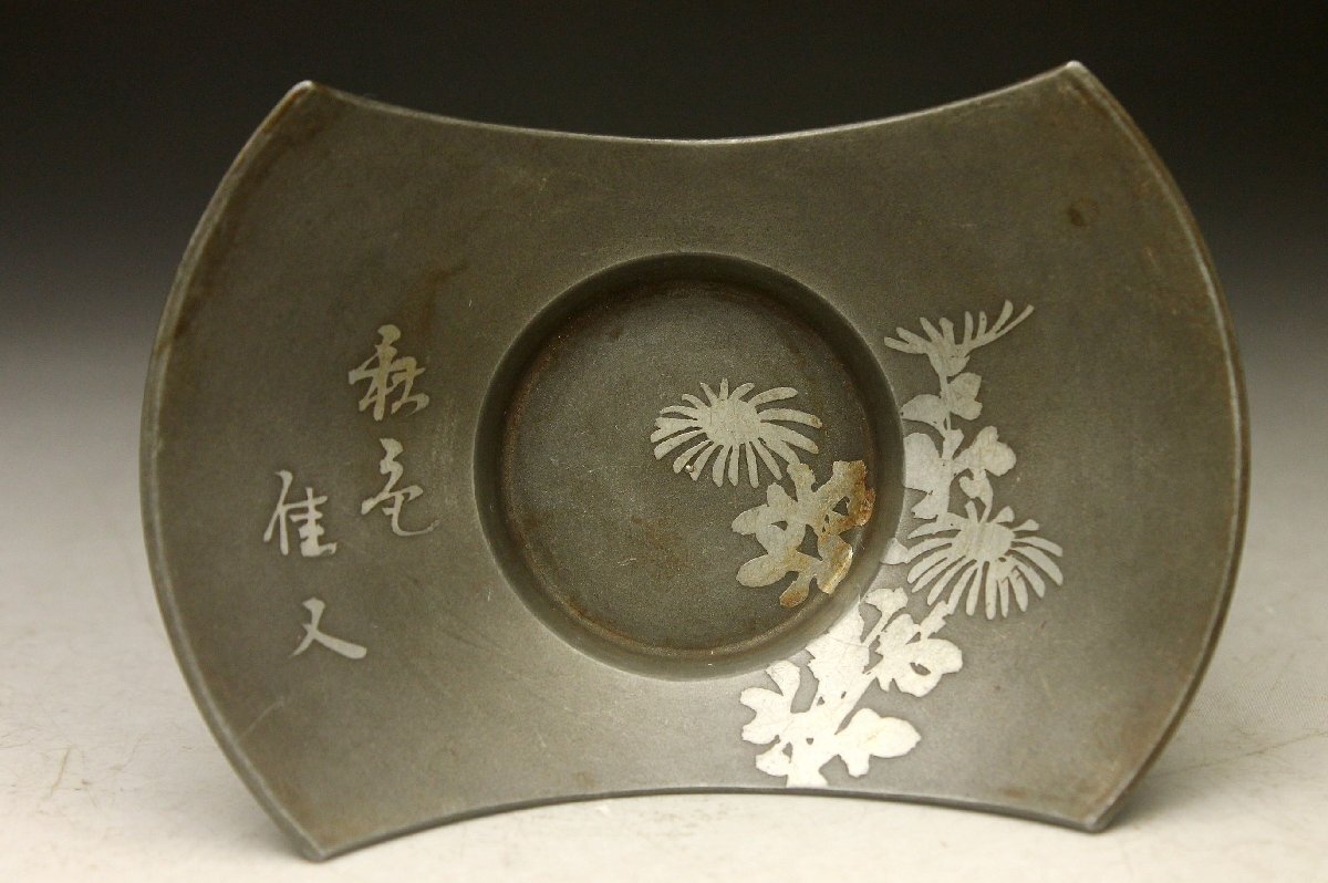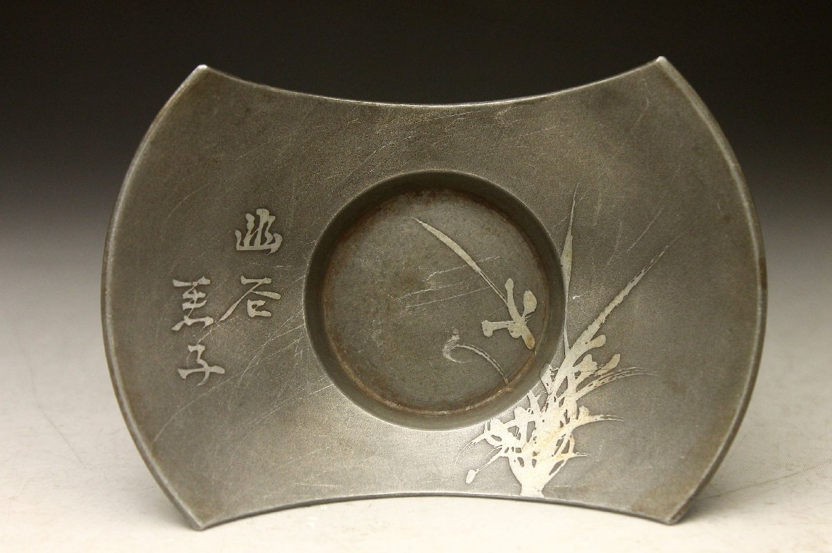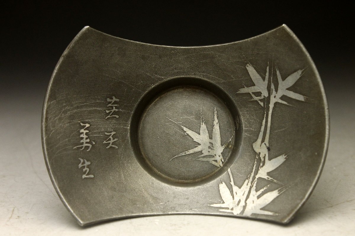 【余韻】 煎茶道具 中国 古錫「宗記」銘 錫茶托 五君子絵替 分銅 茶托揃(5客)★無傷美品<同梱可>