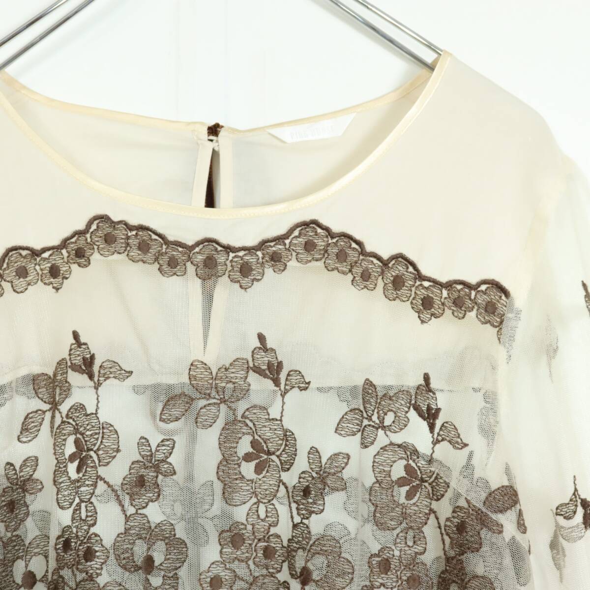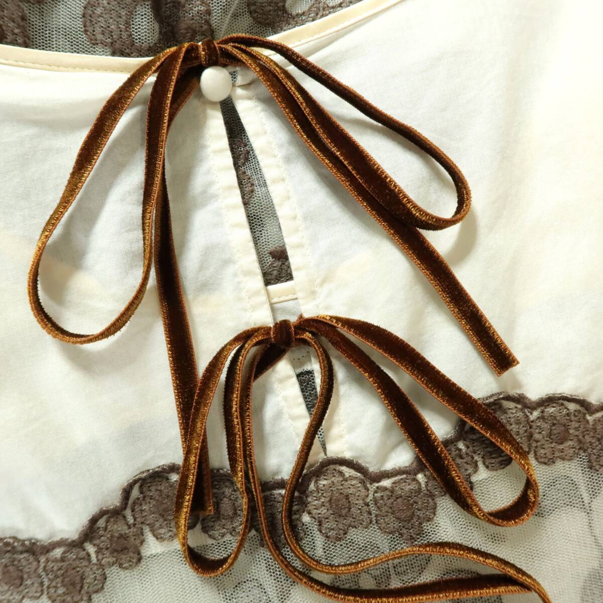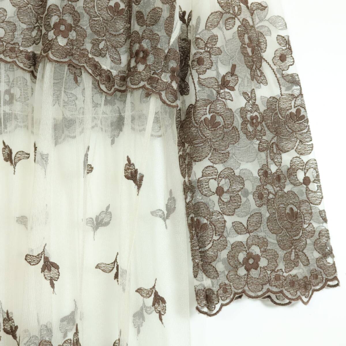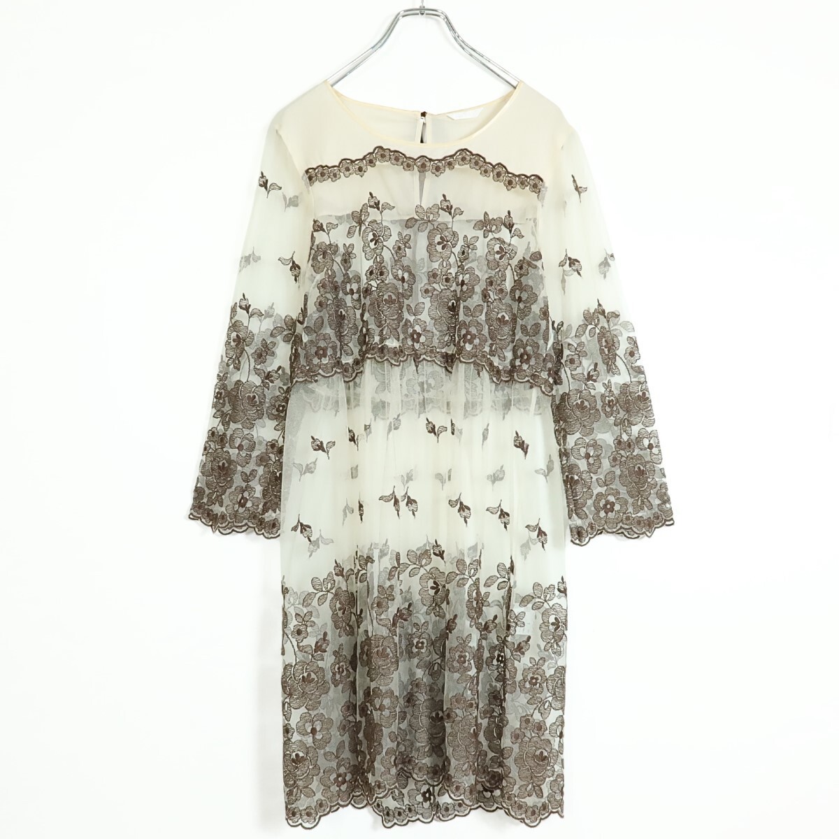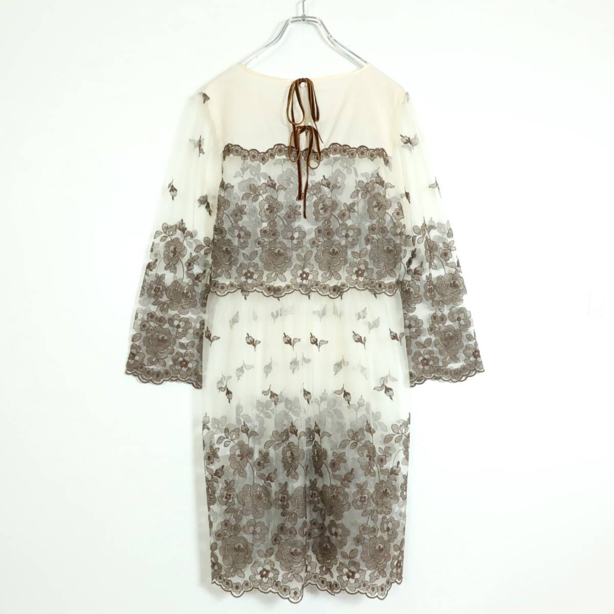 商品説明 | 実寸約】肩幅38袖丈54.5バスト96着丈92 (cm) 【サイズ表記】 なし。実寸をご参照くださいませ。 【素材】 ナイロン100% 【状態】 使用感少なめの美品 【デザイン】ベージュ×薄茶系 刺繍付きチュールレースの長袖ワンピースです。 薄手でシアー感あり 首の後ろでベロア調リボン2本を結ぶデザイン。 |