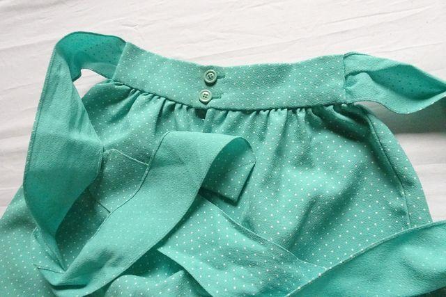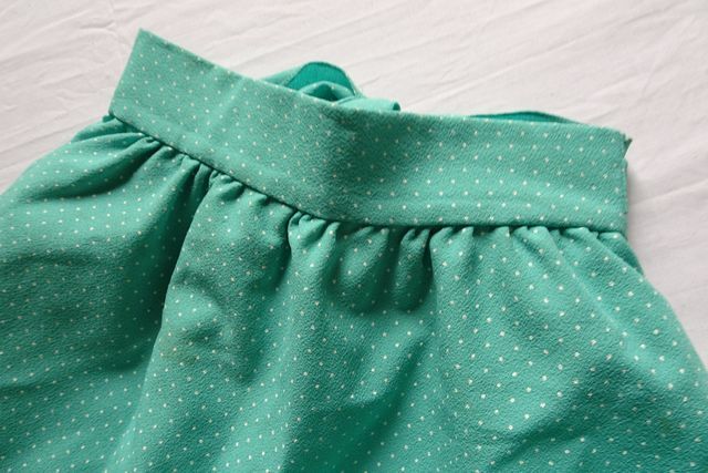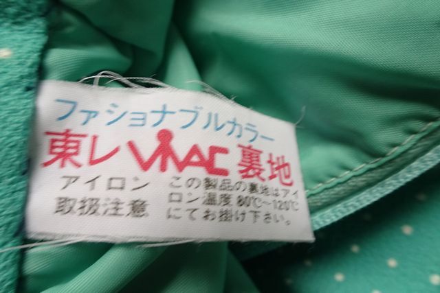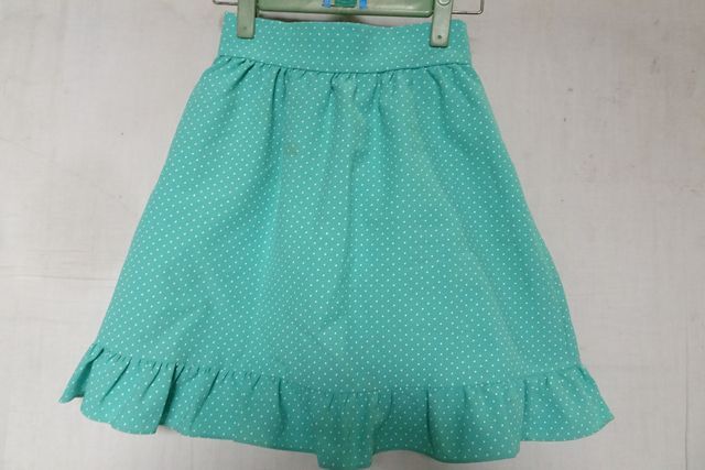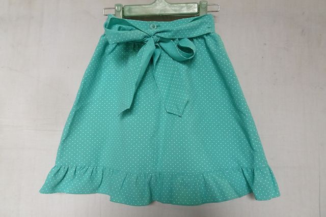台形ミニスカート/ひざ上丈/裾ペプラム/ウエストリボンひも結び/白ドット柄/裏地付/レトロ/エメラルドグリーン/ウエスト58(6/24R7)
