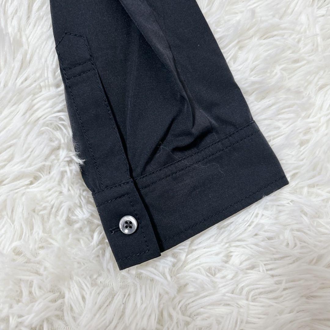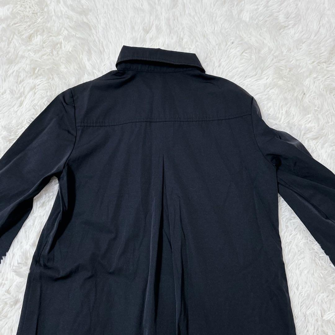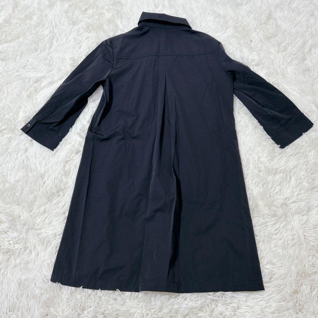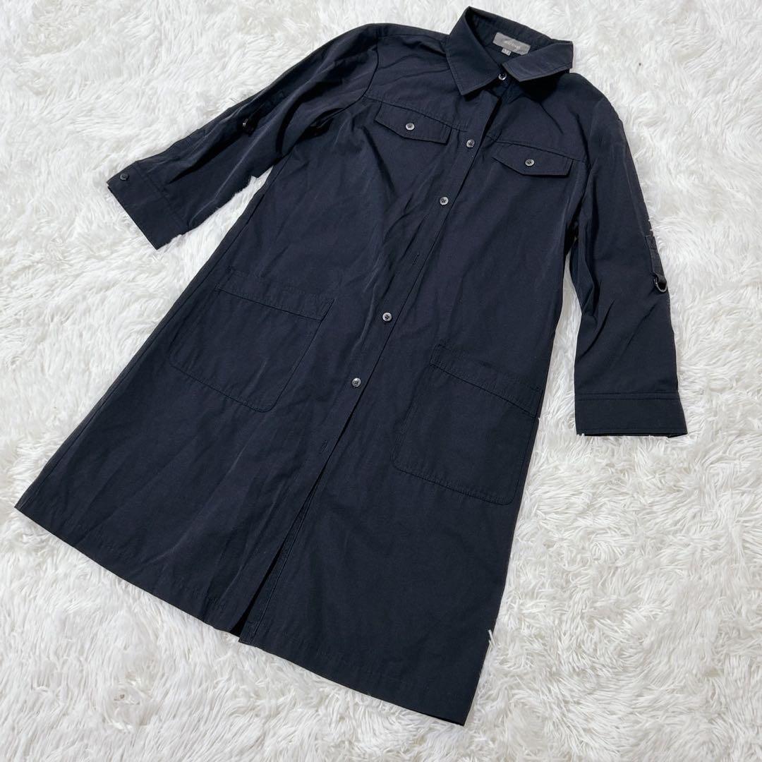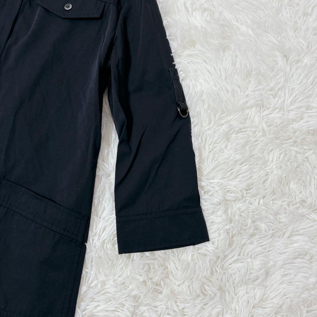 ボタンフロントとポケットが特徴のブラックトレンチコート。