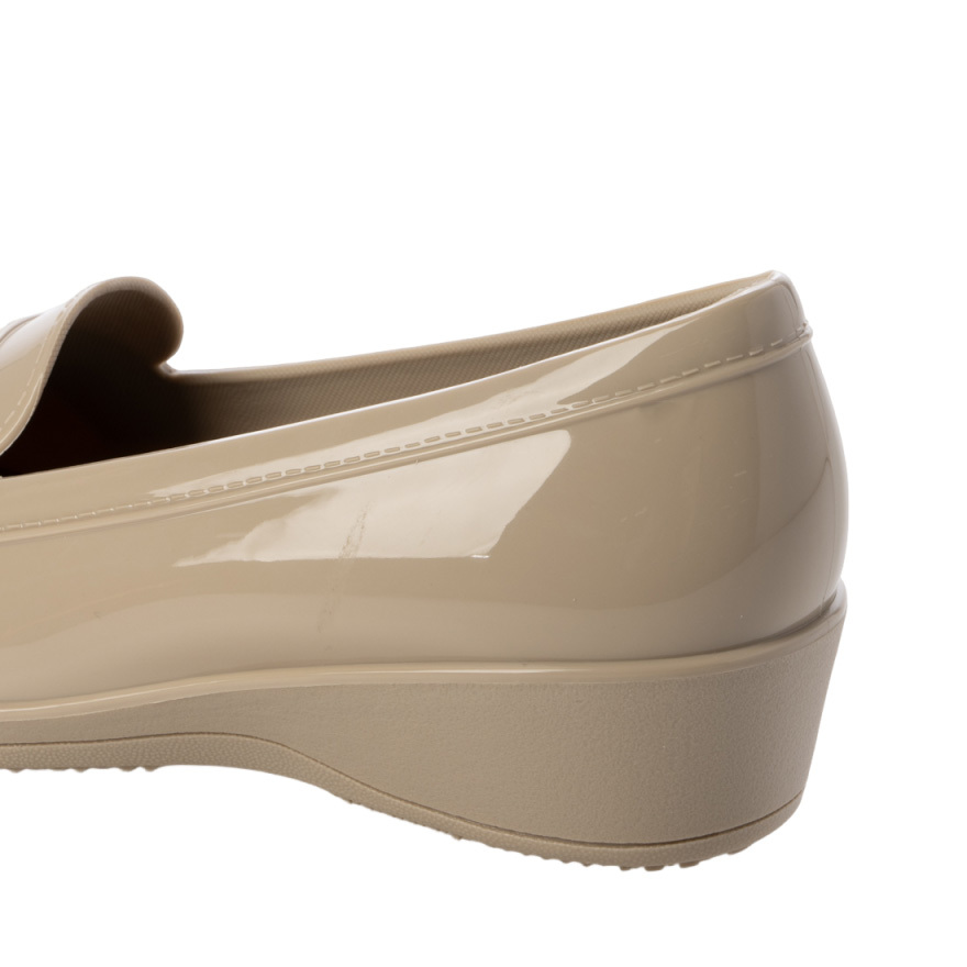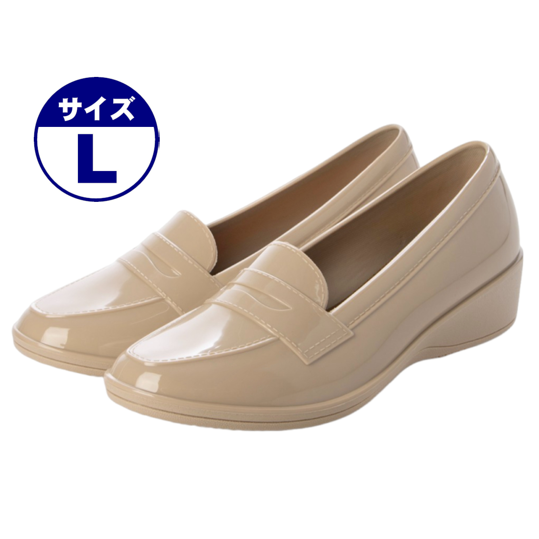 エナメル調仕上げで足元をエレガントに演出。にわか雨に備えて、おすすめの晴雨兼用ローファーです。