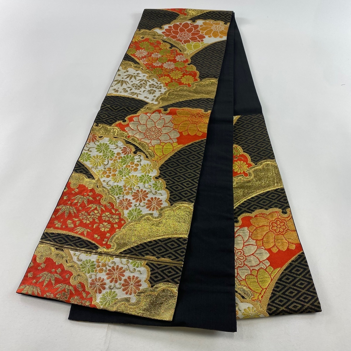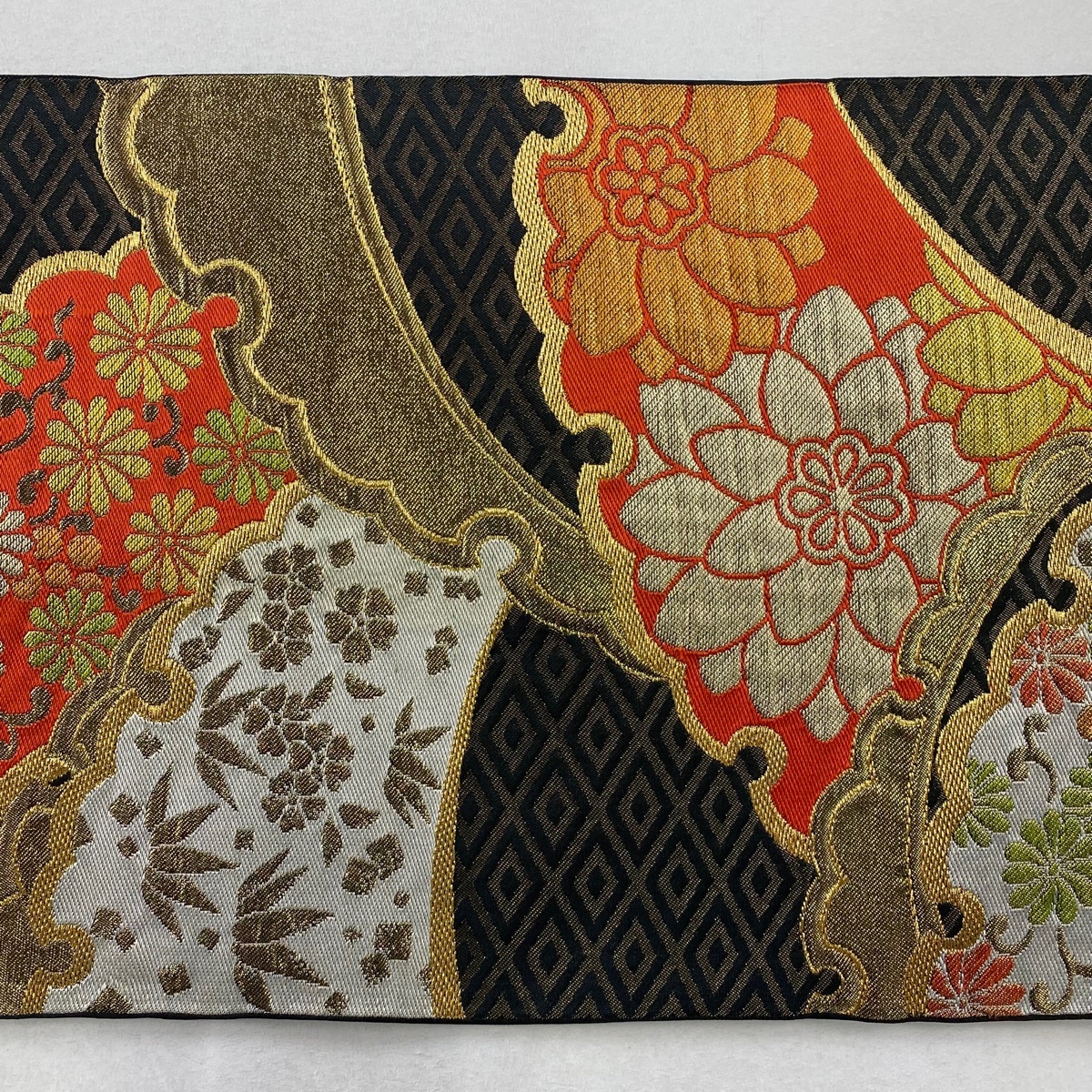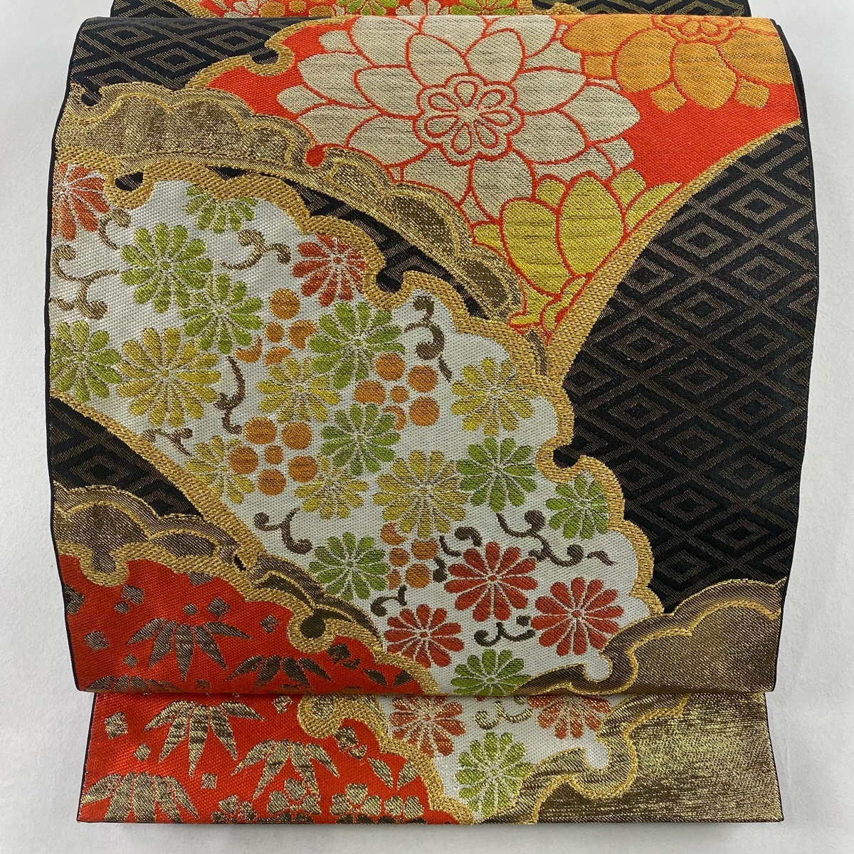 | 袋帯 名品 川島織物 落款 雪輪 菊唐草 金糸 箔 黒灰 六通 正絹 【中古】 |