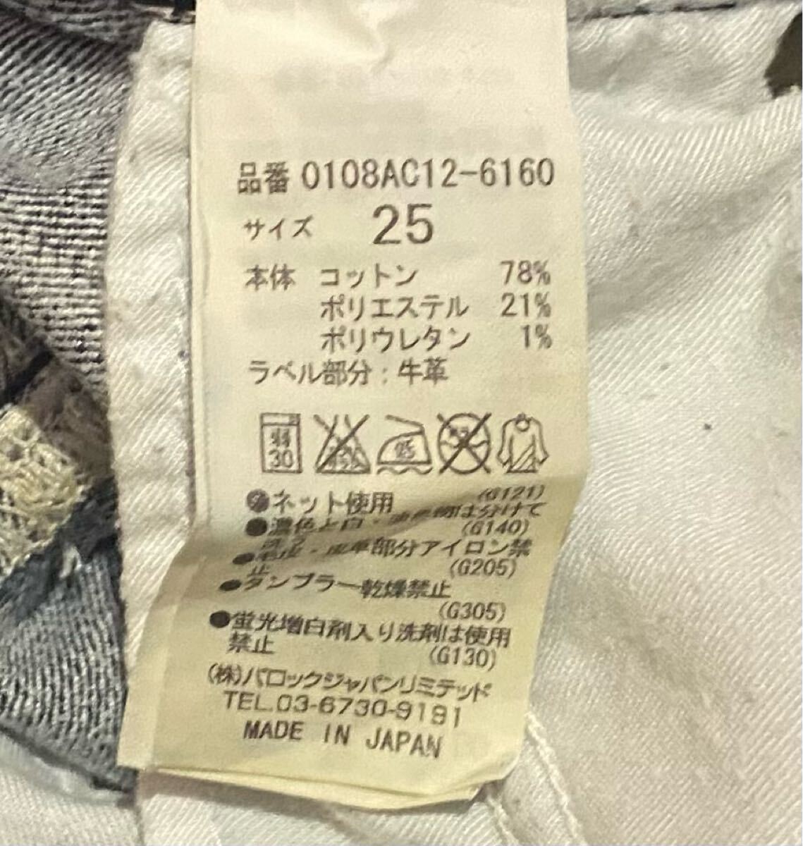 マウジーのストレッチ暖スキニーデニム(ジーンズ)、品番0108AC12-6160です。色はインディゴブルーです。USEDで裾直ししておりますが状態は良いです(10段階中8程度)。牛革パッチ、ジッパーフライです。生地はストレッチ入りでコットン78%、ポリエステル21%、ポリウレタン1%です。正規品です((株)バロックジャパンリミテッド、日本製)。サイズはW25でウエストは重ねずに平置きで約70cm、ヒップ約83cm、股上約18cm、股下約70cm、股下15cmのふともも部分約40cm、裾まわり約29cm、重量約460gです。発送はゆうパケットポストになります。