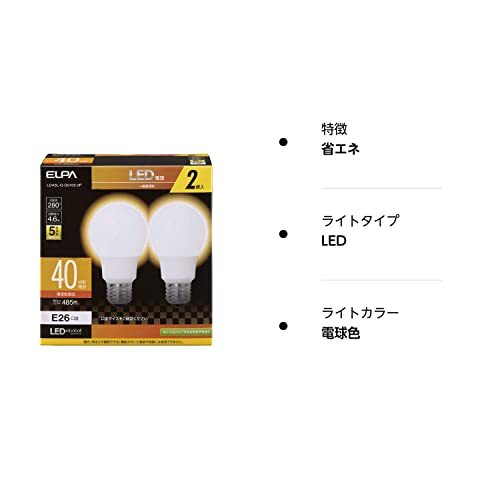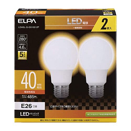 「エルパ (ELPA) LED電球A形広配光 E26 電球色相当 屋内用 2個入 LDA5L-G-G5102-2P」▼4901087219995▼(商品説明)・電球色 40W型 E26 LDA5L-G-G5102-2P・・Size:40W型 E26・軽量・コンパクト設計・ワイドに明るい広配光設計です。・密閉型器具対応・省エネ法2027年度目標基準達成
