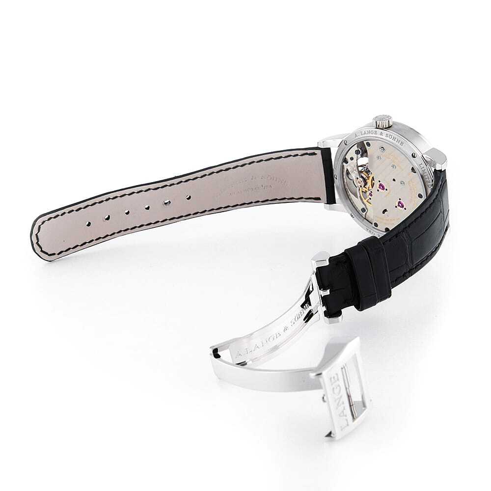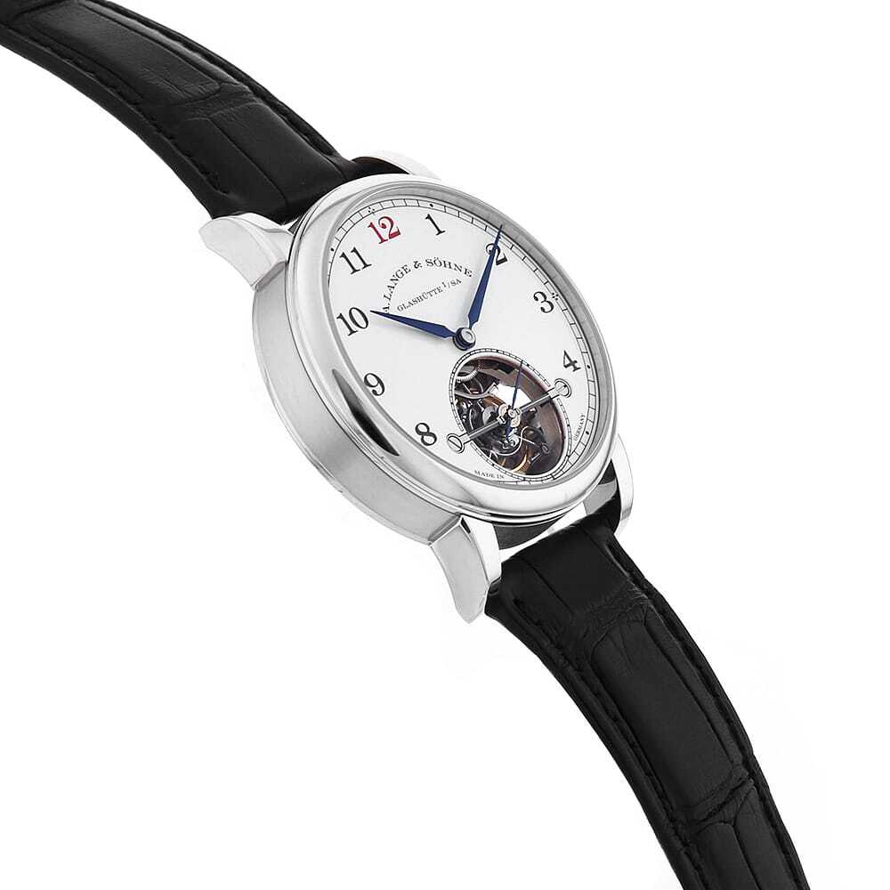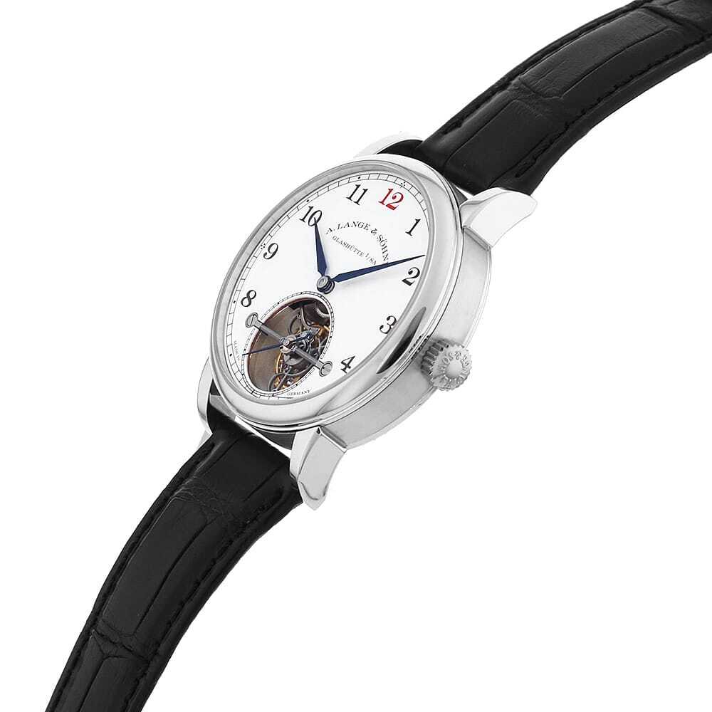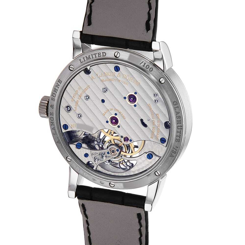 モデル情報 | 100本限定である本モデルは、伝統的な工芸技術と最先端の技術革新を融合させた、究極の精密機械式時計です。白色のエナメルダイアルが際立つ端正なデザインは、一見すると控えめで飾り気のない佇まいながら、その内には高度な複雑機構が秘められています。重力の影響を補正するトゥールビヨンを搭載しながらも、特許を取得した「ゼロリセット機構」と「ストップセコンド機構」を組み合わせることで、秒単位での時刻合わせを可能にした革新的な技術が結実しています。シースルーバック越しに覗くのは、自社製手巻きムーブメント「Cal.L102.1」。丁寧に手仕上げされた各パーツが織りなす芸術品と呼ぶにふさわしい景観が広がり、パーツひとつひとつが<ランゲ&ゾーネ>の真摯な時計作りの姿勢を物語っています。 |
