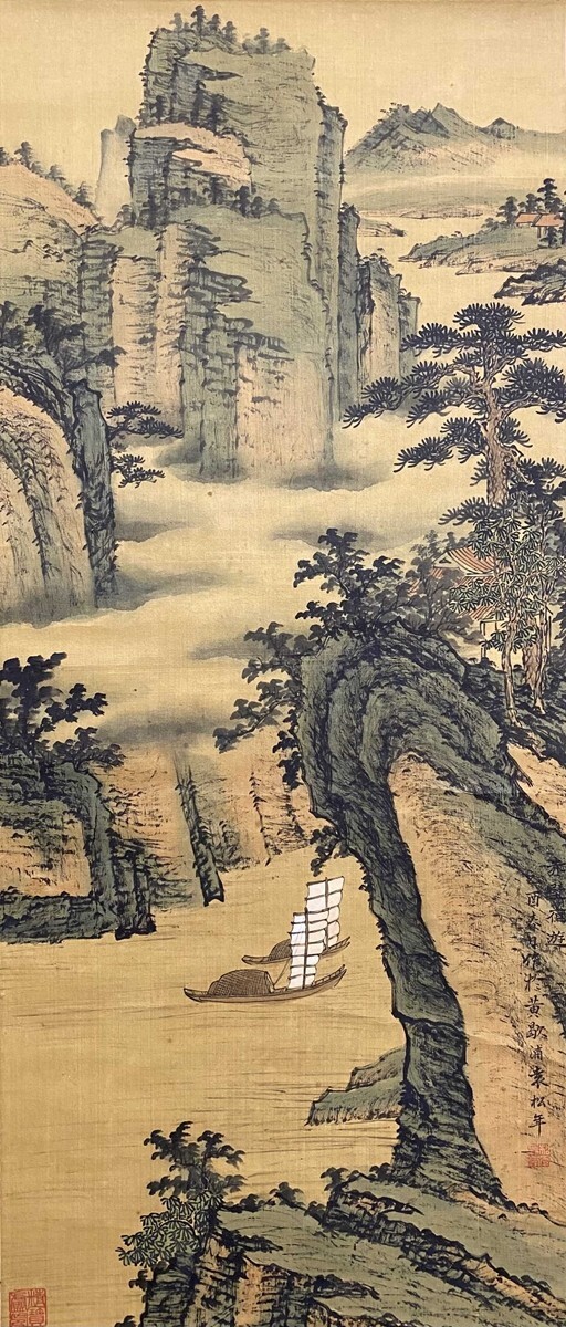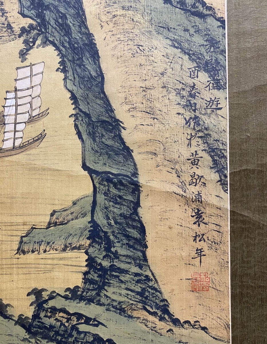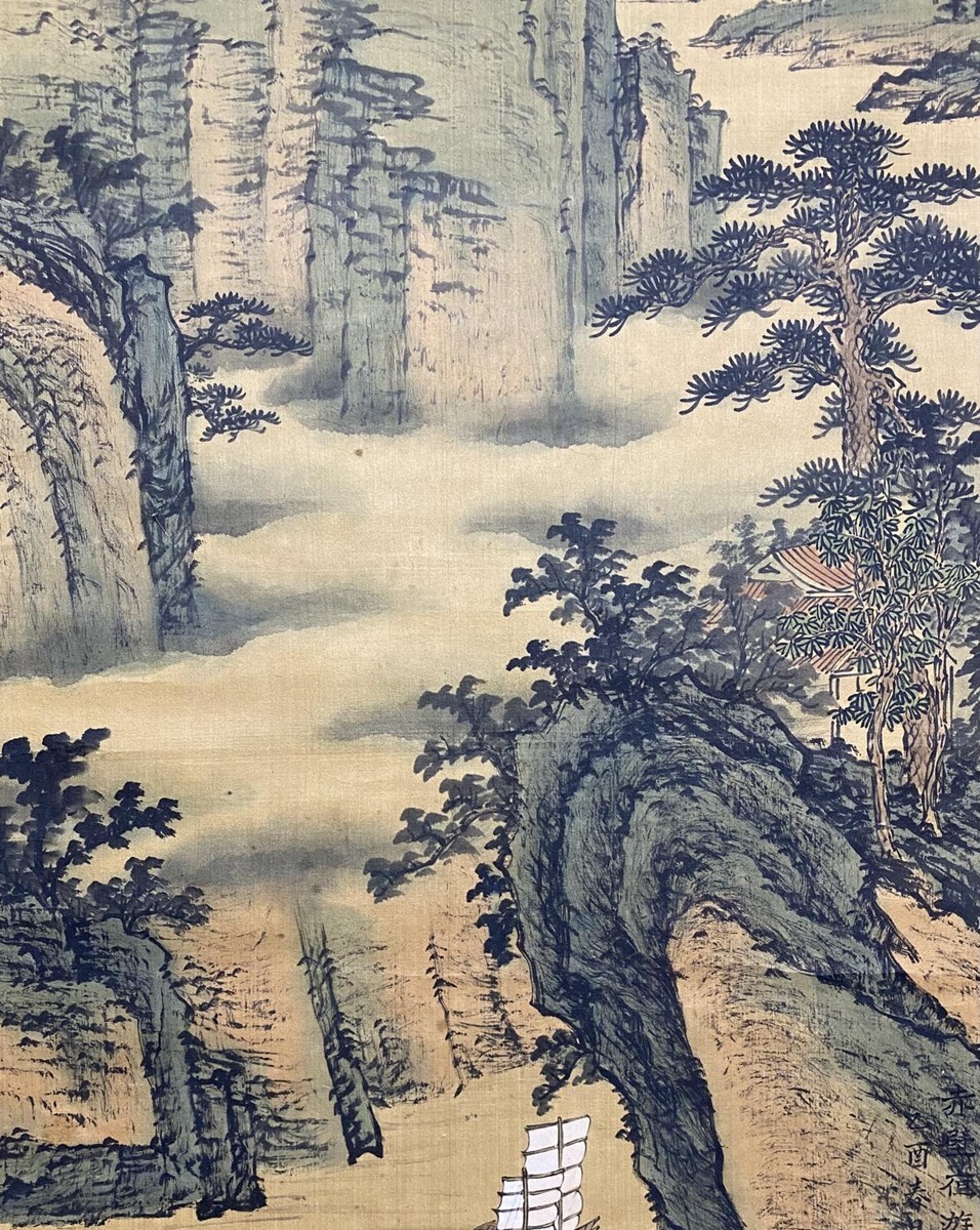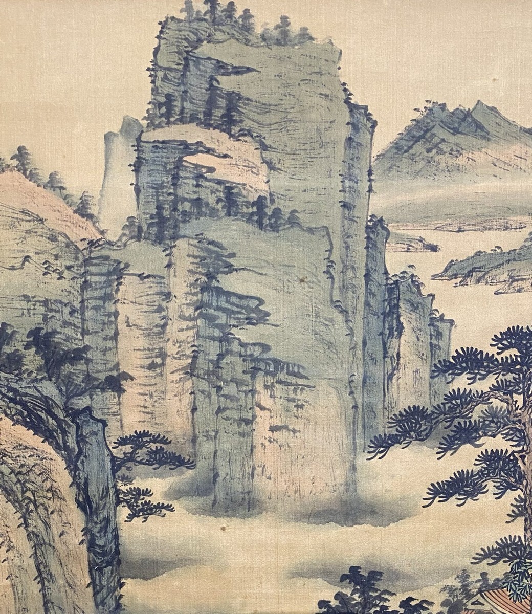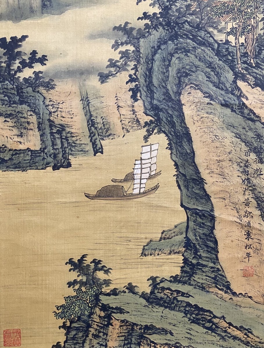 【瓏】「袁松年作 山水図」近代画家 肉筆絹本 掛け軸 書画立軸 巻き物 中国書画 古美術 蔵出