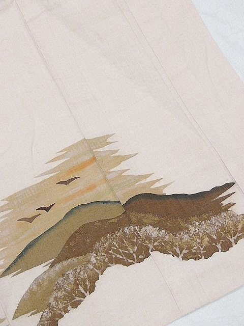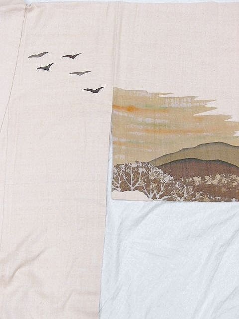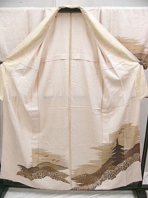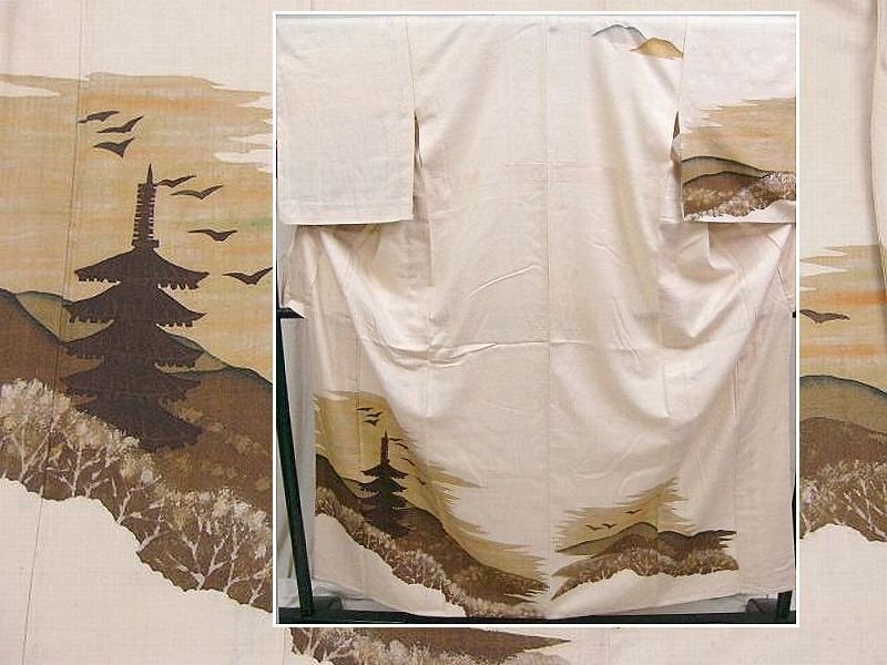 リサイクル品 京風景模様 正絹 真綿紬生地 付け下げひとえ着物 USED
