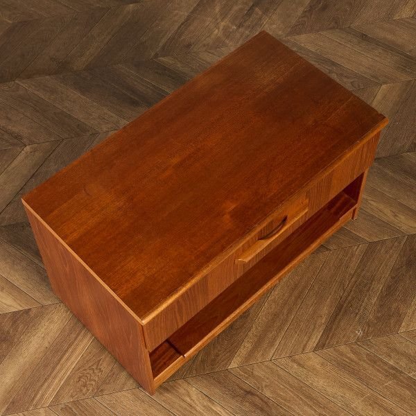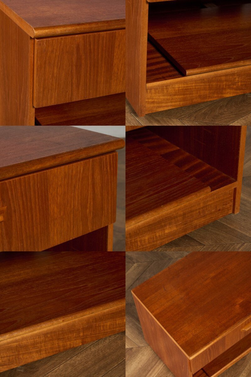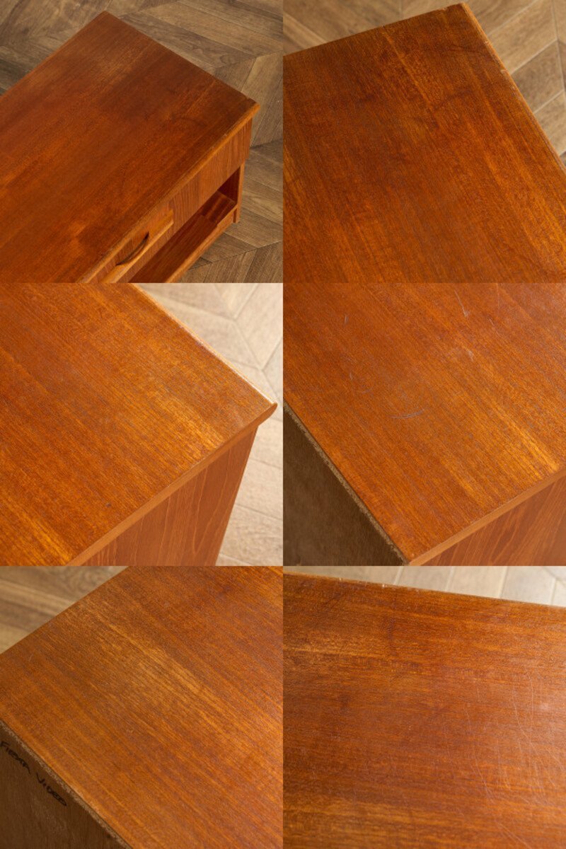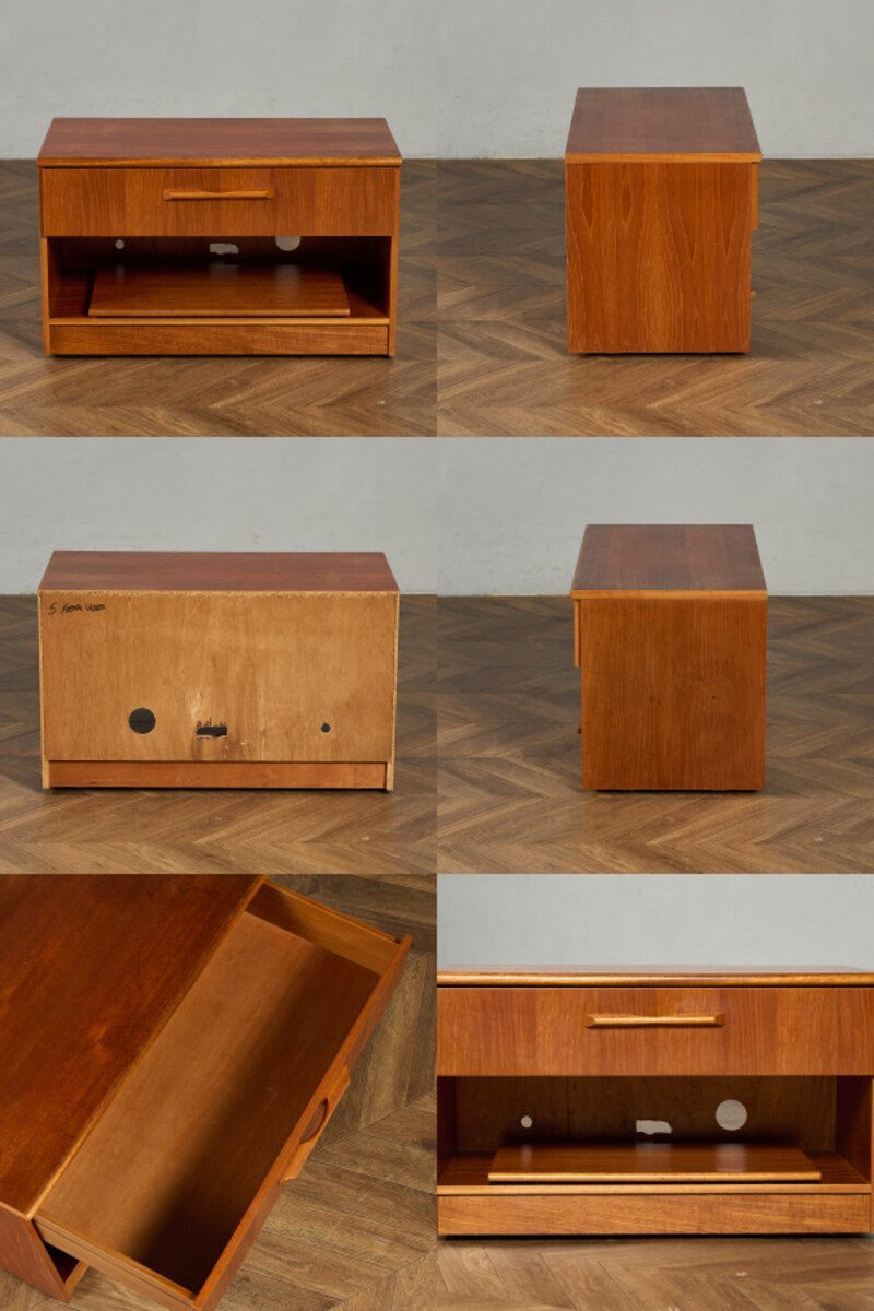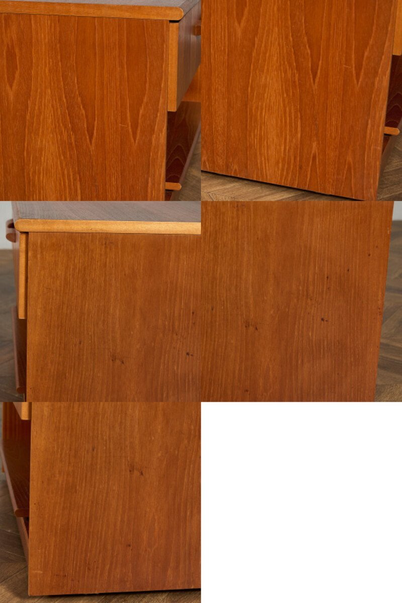 イギリスヴィンテージ TVボード / AVボードです。 デンマークスタイルのデザインをルーツに独自のアレンジが施された上質なTVボード。つややかに削られた取っ手の繊細なディティールが魅力です。細部にこだわりが感じられる、リビングの顔として申し分のないお品です。 戦後、モダンな北欧デザインが大ブームとなり、英国でも北欧スタイルの家具が作られるようになります。伝統的な家具作りの基盤があった英国の高い技術力と生産力は、高品質な家具を生み出すことを可能にしました。いち早くデンマークデザインを取り入れたG-PLAN(ジー・プラン)や、スコットランドの老舗メーカーA.H.McIntosh(A.H.マッキントッシュ)、Nathan(ネイサン)などが代表的な英国メーカーです。その他にも、北欧スタイルの優秀な家具メーカーが多数存在しました。ミッドセンチュリー期に作られた英国の北欧スタイル家具は、本場の北欧家具に負けずとも劣らない品質とデザイン性で現在でも高く評価され、近年、ますます人気が高まっています。 |