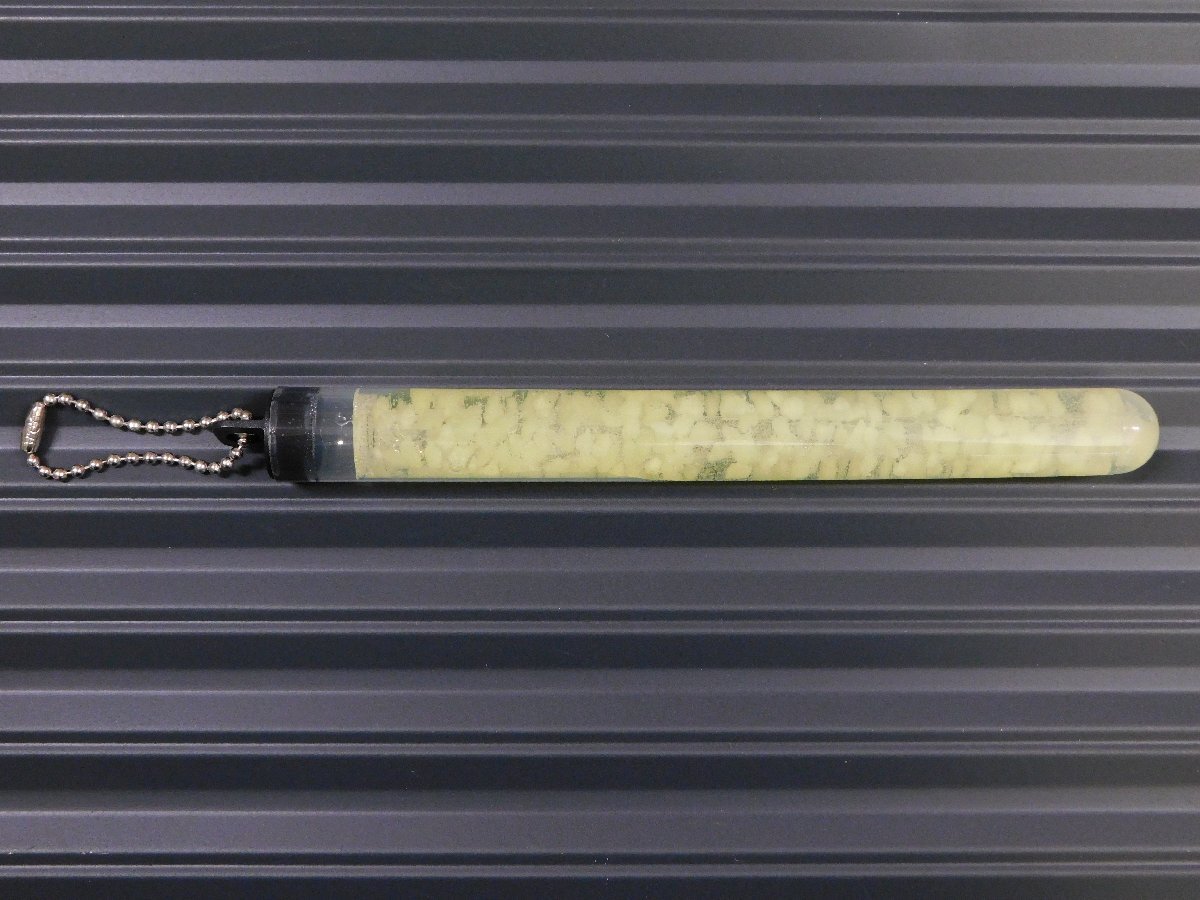 蓄光粒子を樹脂で固めたステックは、明るいところで光を蓄え、暗闇でグリーンに光ります。