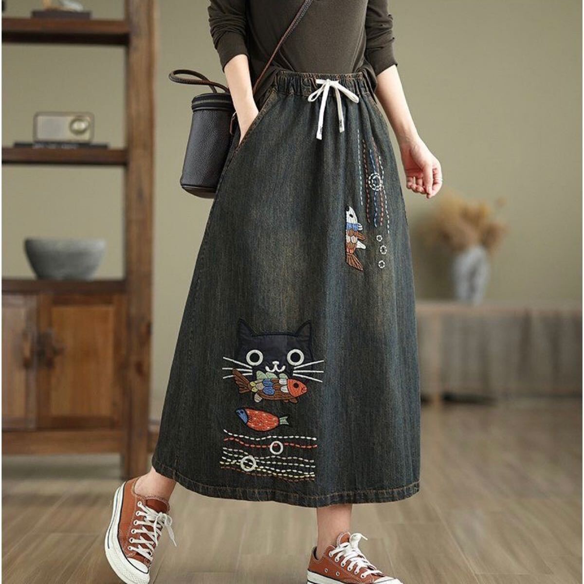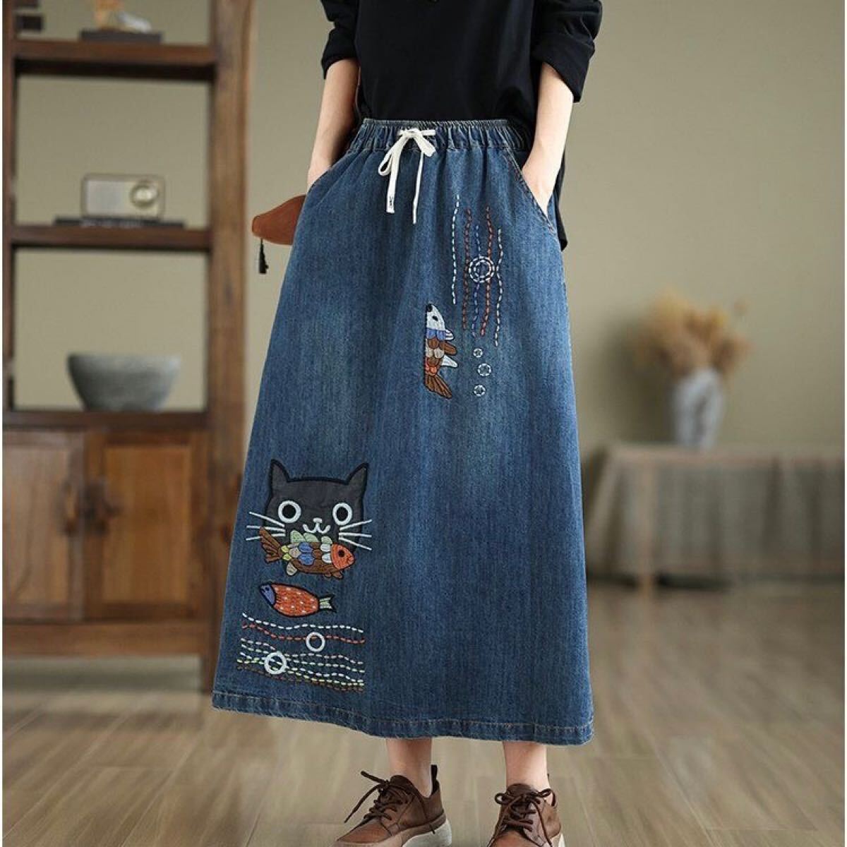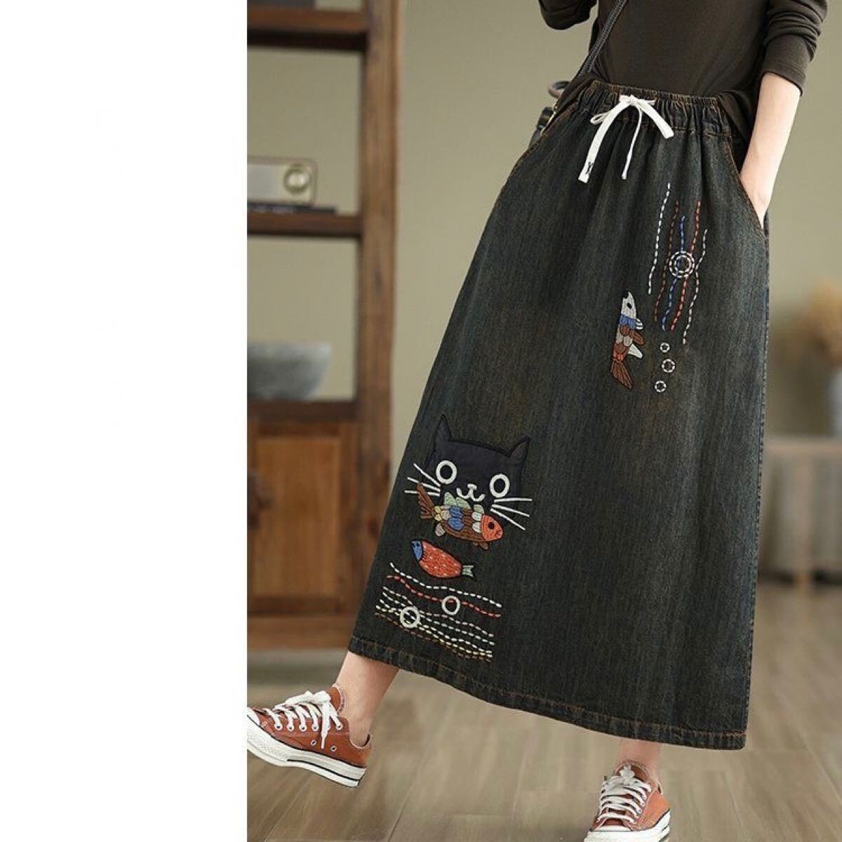 レディース ロングスカート デニムスカート デニムロングスカート ロングデニムスカート カジュアルスカート 刺繍入り 猫柄 オールシーズン 春 夏 秋 冬 大人可愛い 大人かわいい おしゃれ オシャレ お洒落 ゆったり 通勤 カジュアル 刺繍 ボトムス 可愛い SLKD011(2色M-2XL)