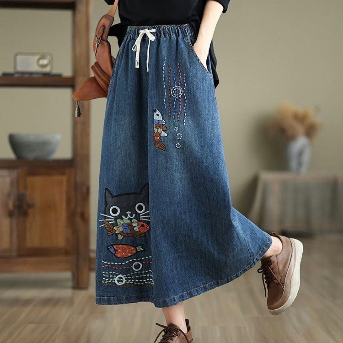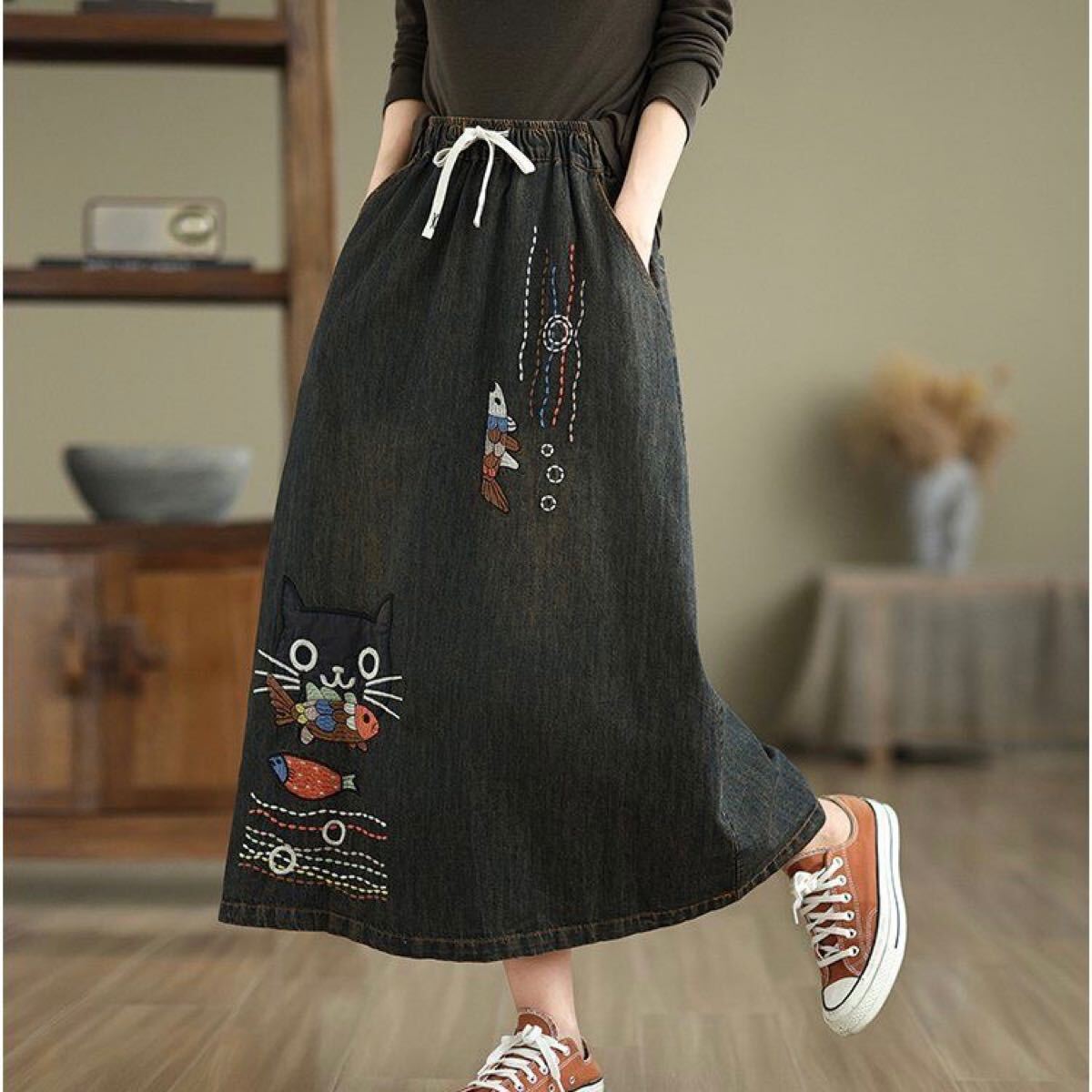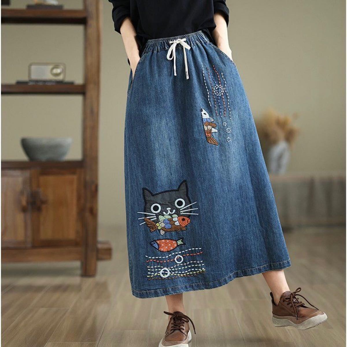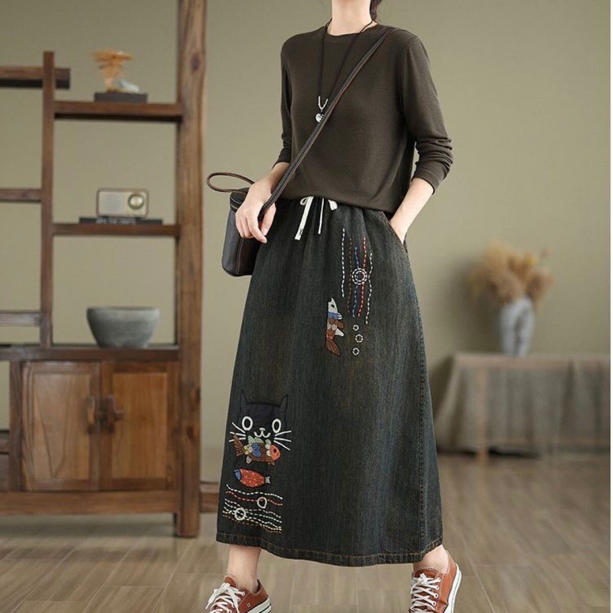 レディース ロングスカート デニムスカート デニムロングスカート ロングデニムスカート カジュアルスカート 刺繍入り 猫柄 オールシーズン 春 夏 秋 冬 大人可愛い 大人かわいい おしゃれ オシャレ お洒落 ゆったり 通勤 カジュアル 刺繍 ボトムス 可愛い SLKD011(2色M-2XL)
