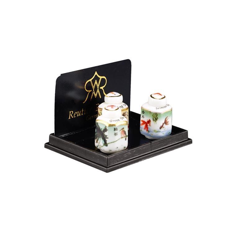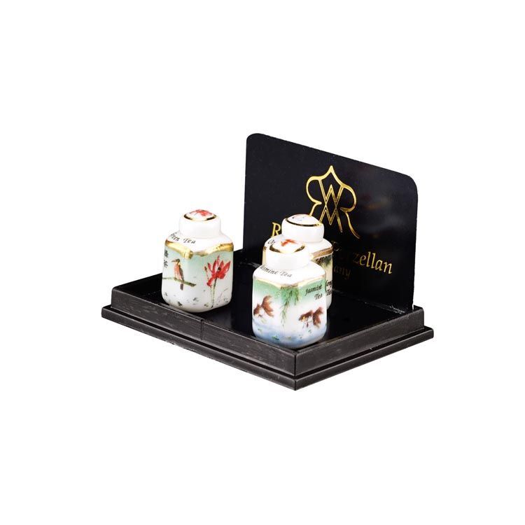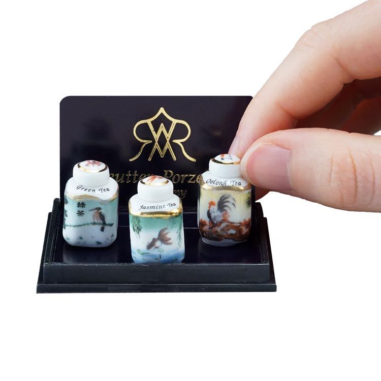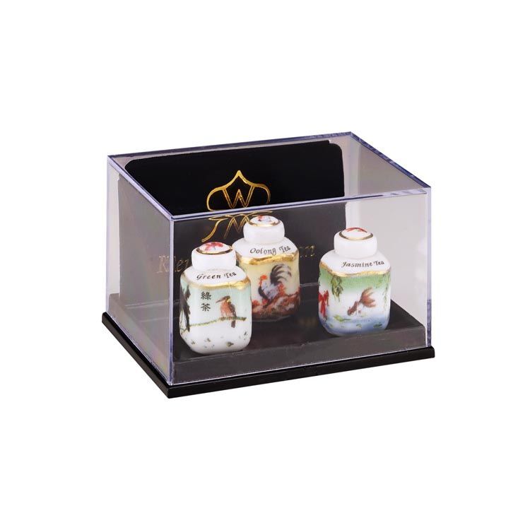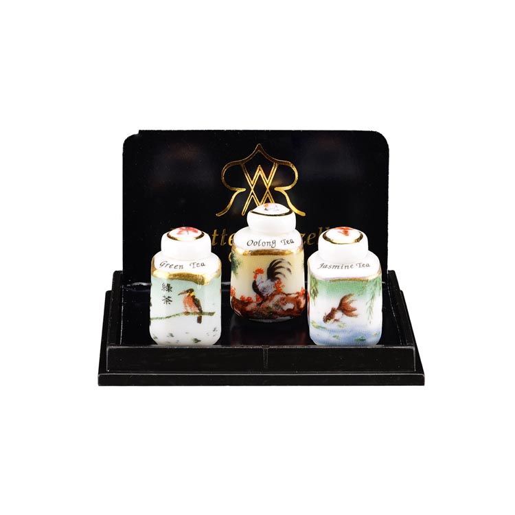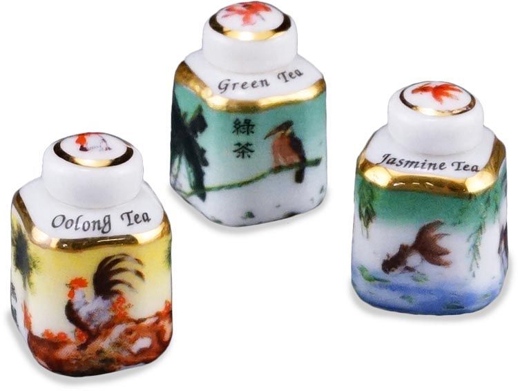 アジアンシリーズのお茶葉入れ3個セットです。「緑茶」「烏龍茶」「ジャスミン茶」と書いてあります。蓋を開けることはできません。絵柄は東洋と西洋が融合したような、何とも不思議なものですが、全体的にとても素敵です。コレクションの一つには、ぜひ欲しい感じですよ!サイズ:13x13xH20mm