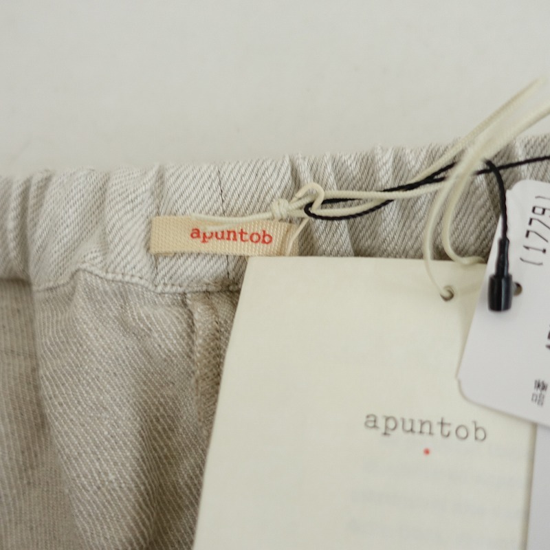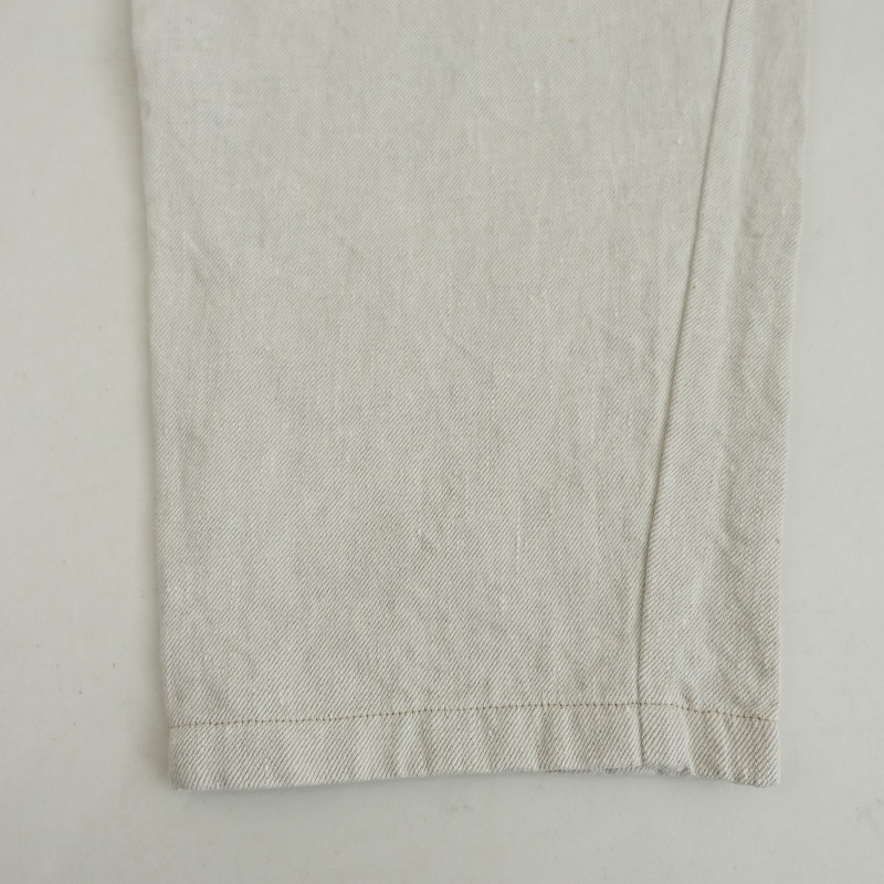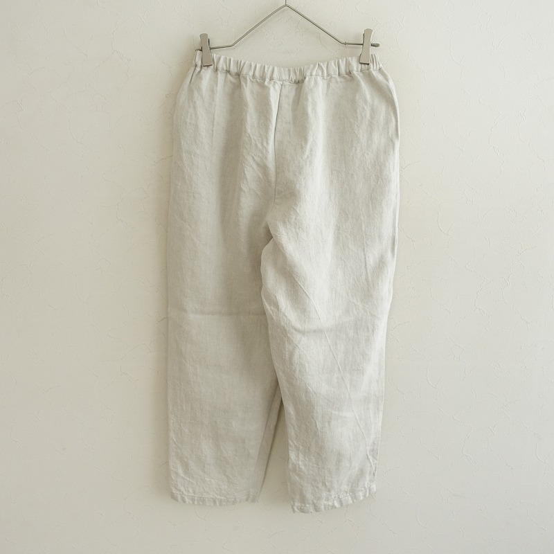 apuntobのリネンツイルイージーテーパードパンツです。カラーはイタリアで一点づつ手作業で染められたキナリ風のオフホワイト(表記:CHALK)です。柔らかさとハリコシをあわせもつ、程よい厚みの麻綾組織の生地を使用。うっすら透け感があり、麻特有の糸節・ネップ・染ムラ・色糸混入などが見受けられるナチュラルな素材です。ウエストが総ゴム入りのプルオンパンツです。フロントに2タックを配したテーパードパンツです。前両腰にポケットがございます。 |