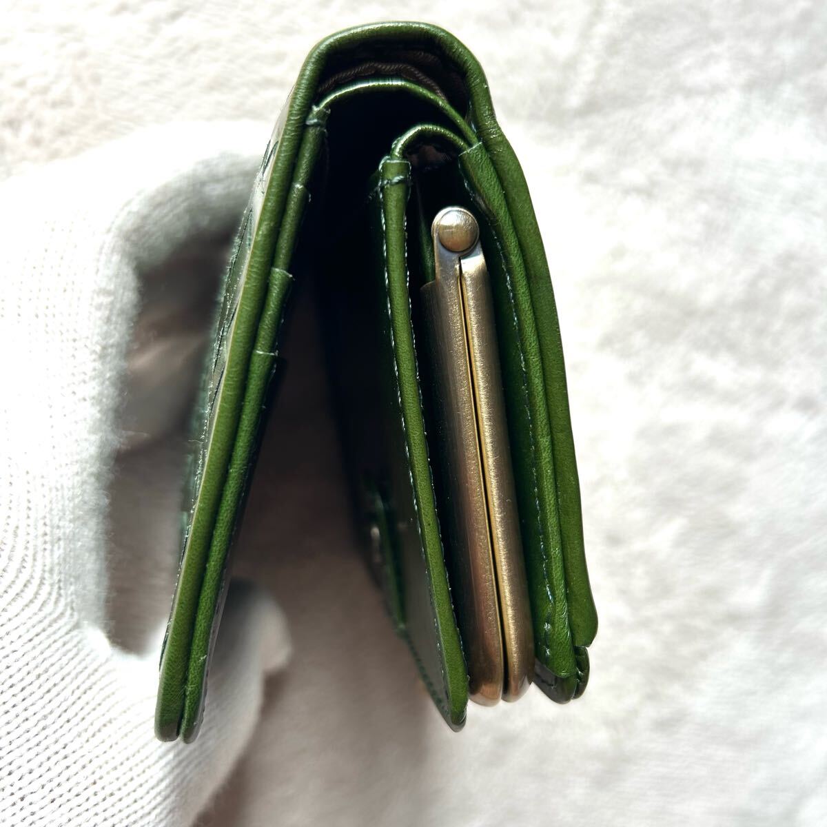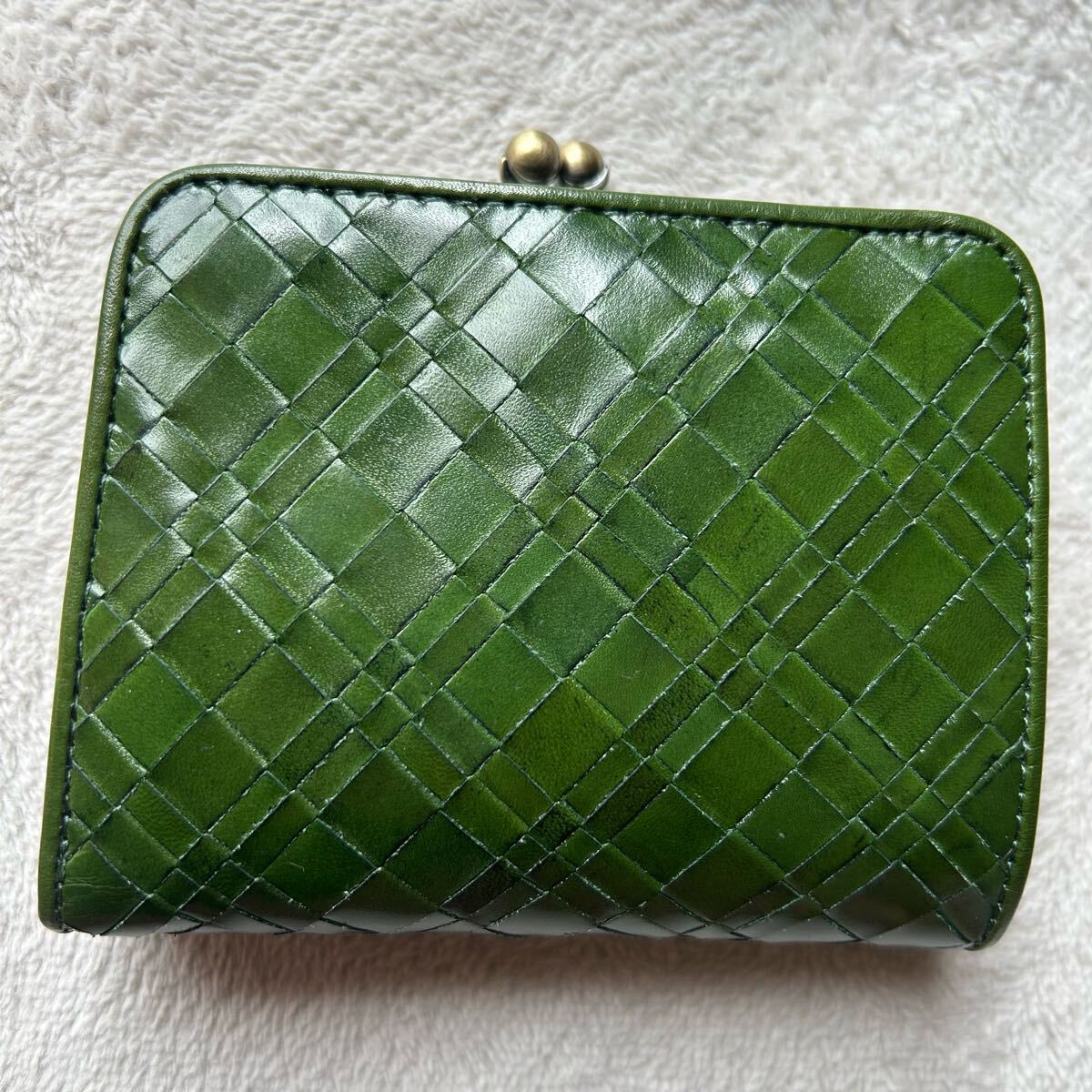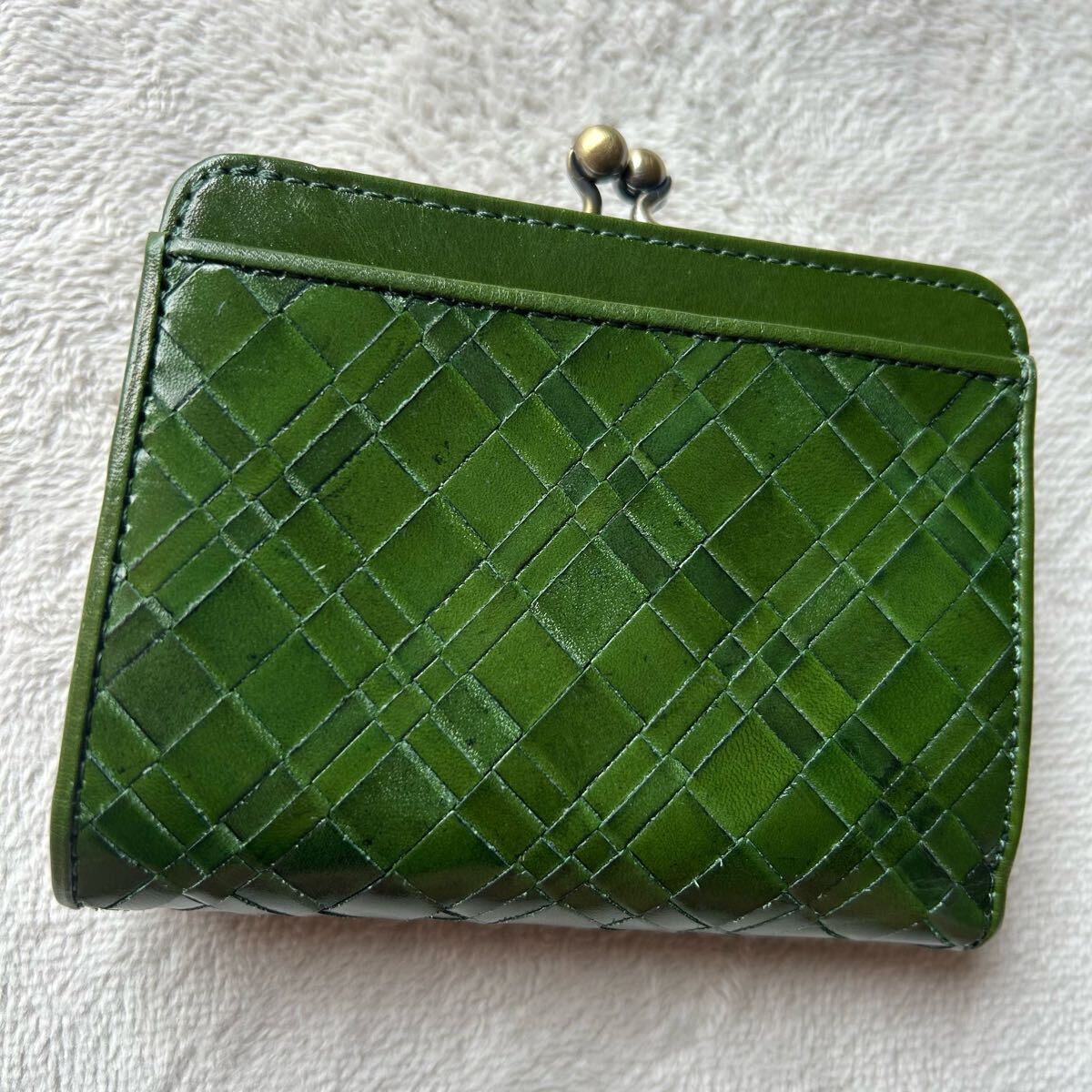編み込みデザインのグリーン二つ折り財布、カードポケット6つ付き。