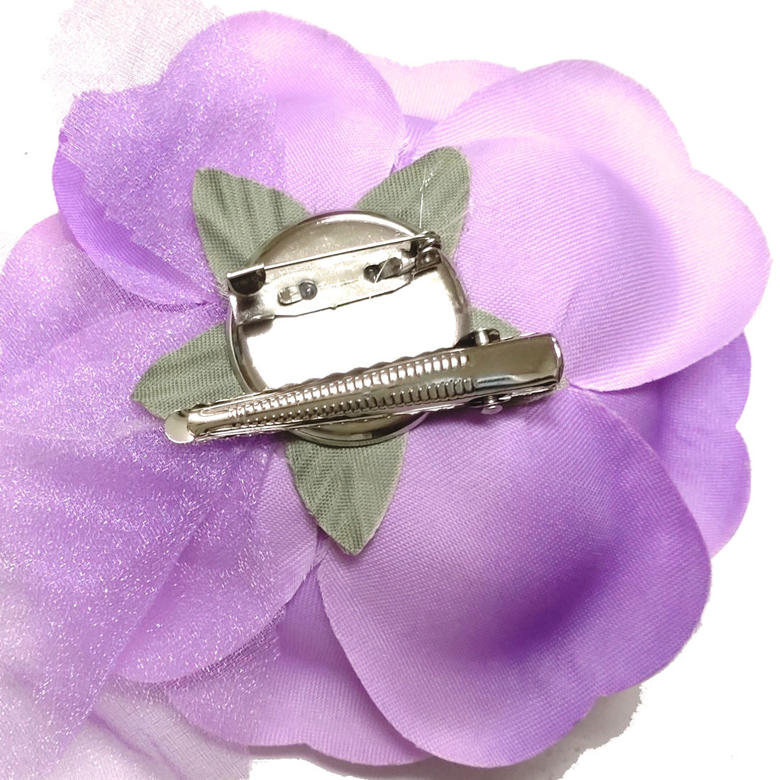 丸みのあるコロンとした大きめの花びらに、透け感が美しいレース生地のリーフ(葉っぱ)が付いたコサージュです。 |