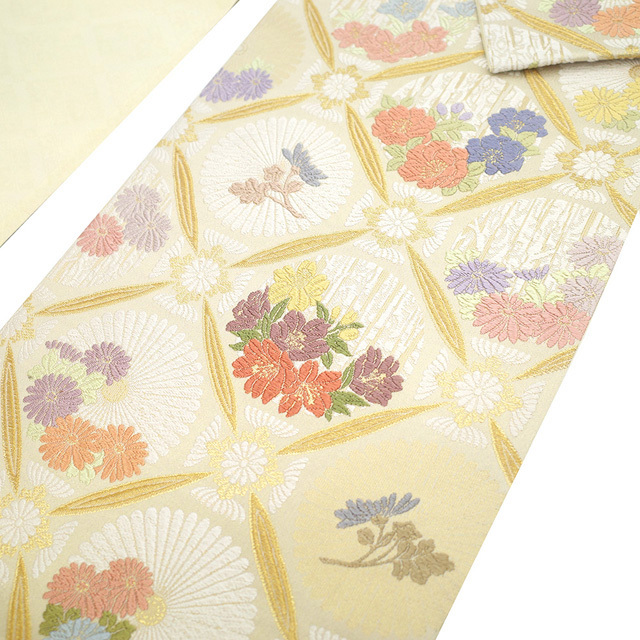 袋帯 リサイクル フォーマル 唐織 正絹 京都 西陣 丸勇 御印 金糸 白ベージュ地 菊 花 花菱 中古 仕立て上がり みやがわ sb54137