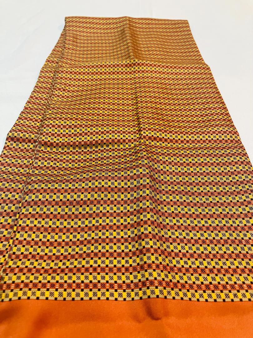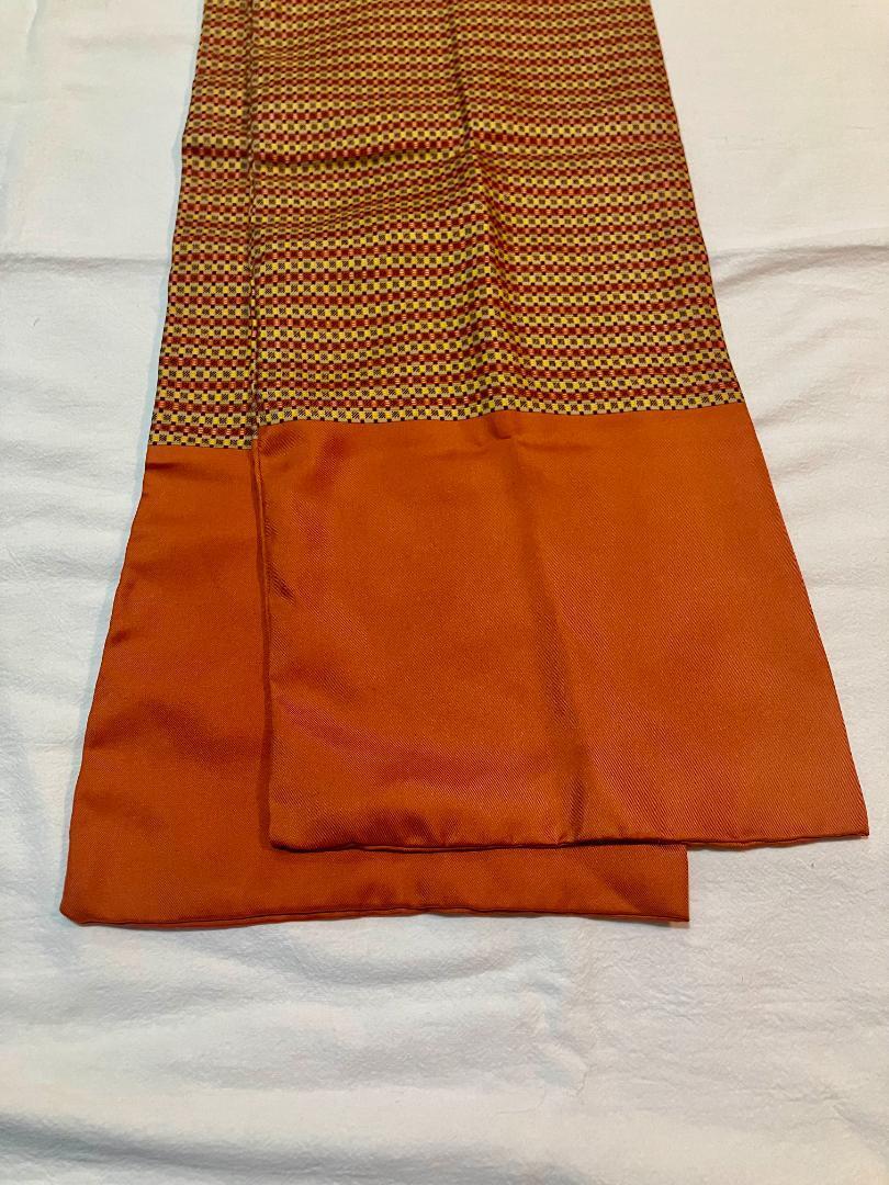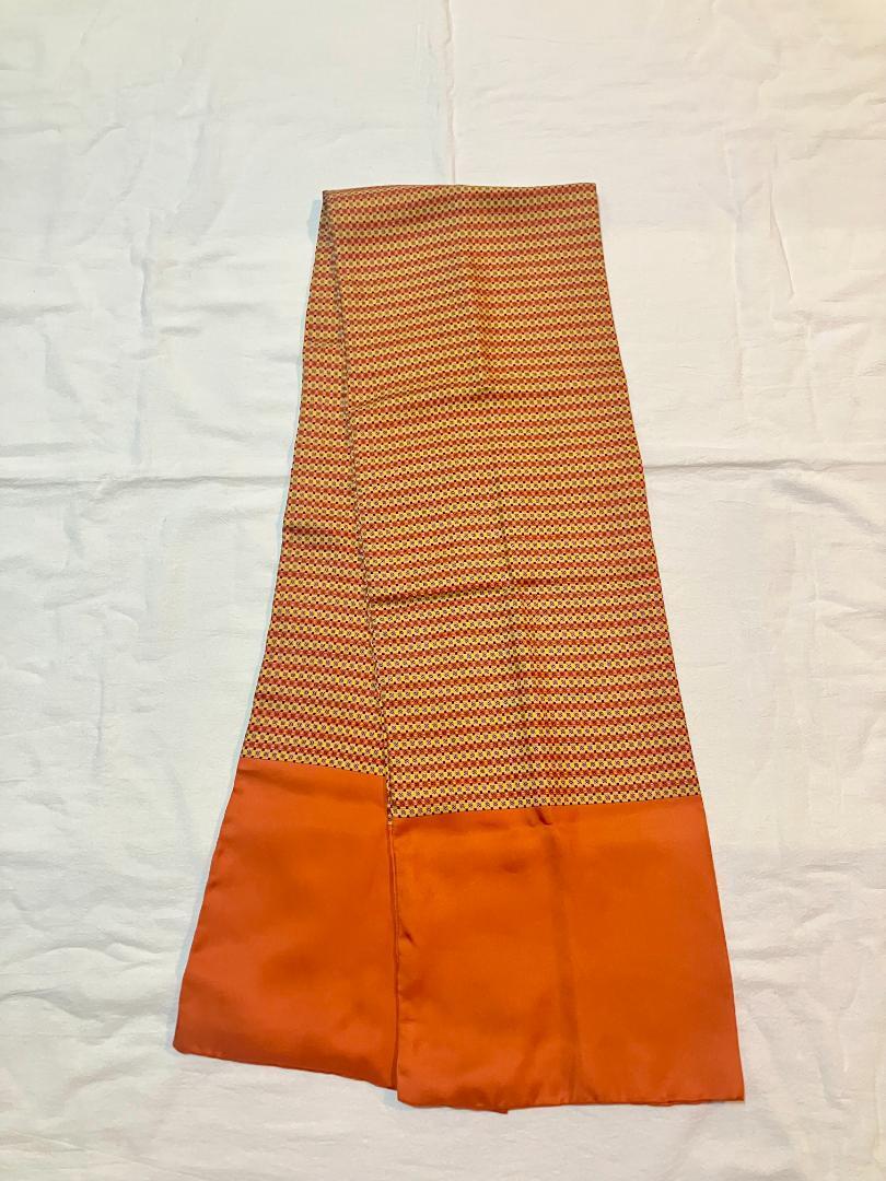 幾何学模様のシルクスカーフ、オレンジとブラウンの配色が特徴。