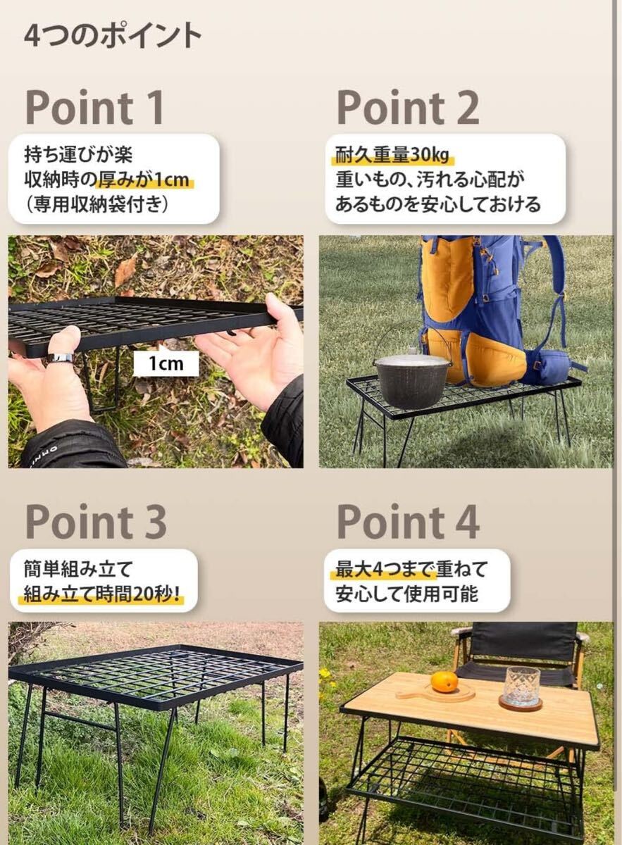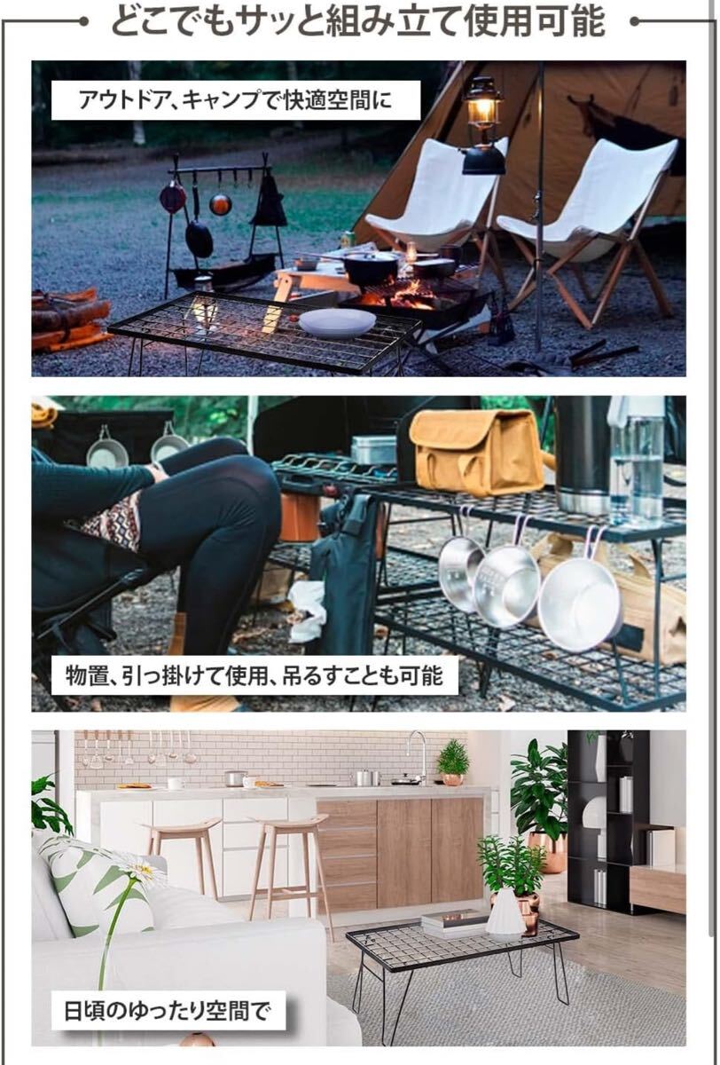 さまざまな場面での使用を実現。室内でのテーブル、キャンプ時のテーブルや台、焚火置き、収納スペース、サイドテーブル、高熱のフライパン等を置くテーブル、水切り台、棚としても使用可能。