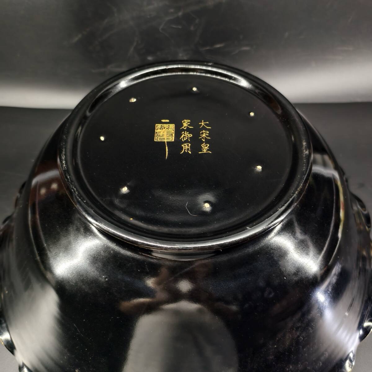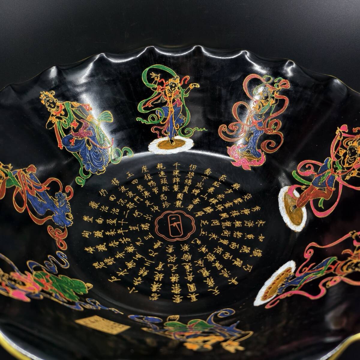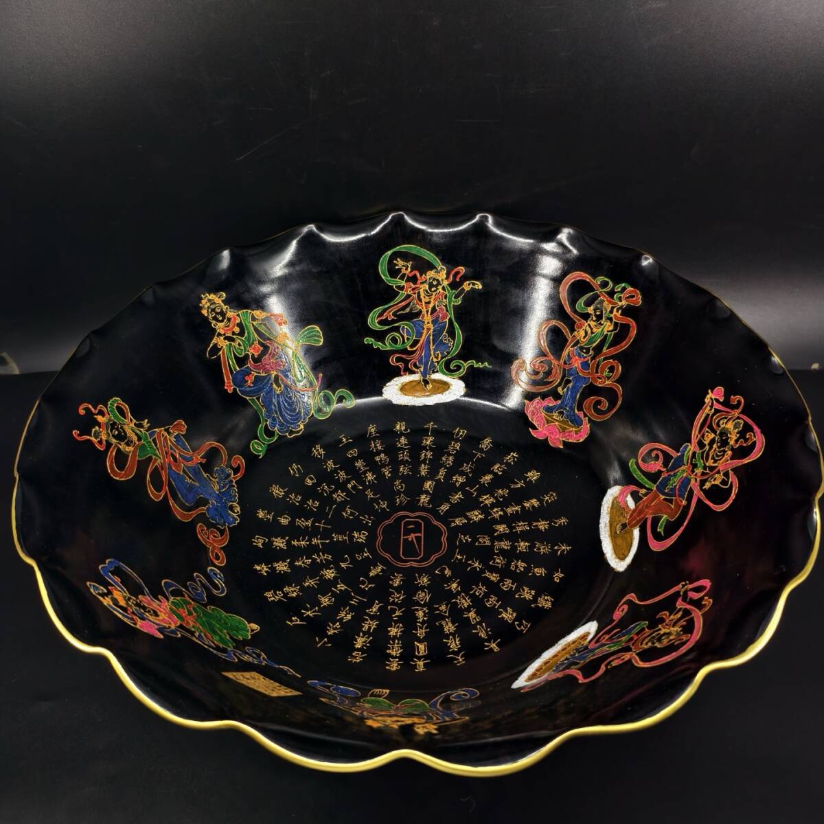 秘藏 宋時代 時代物 汝窯 蒔絵金銘文 加彩夜光 飛天紋 花口碗 唐物 陶磁器 骨董品 中国美術 高さ17 cm 直径50 cm 古物保証 702