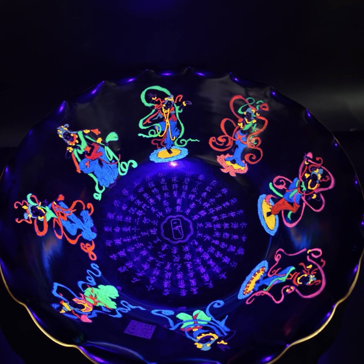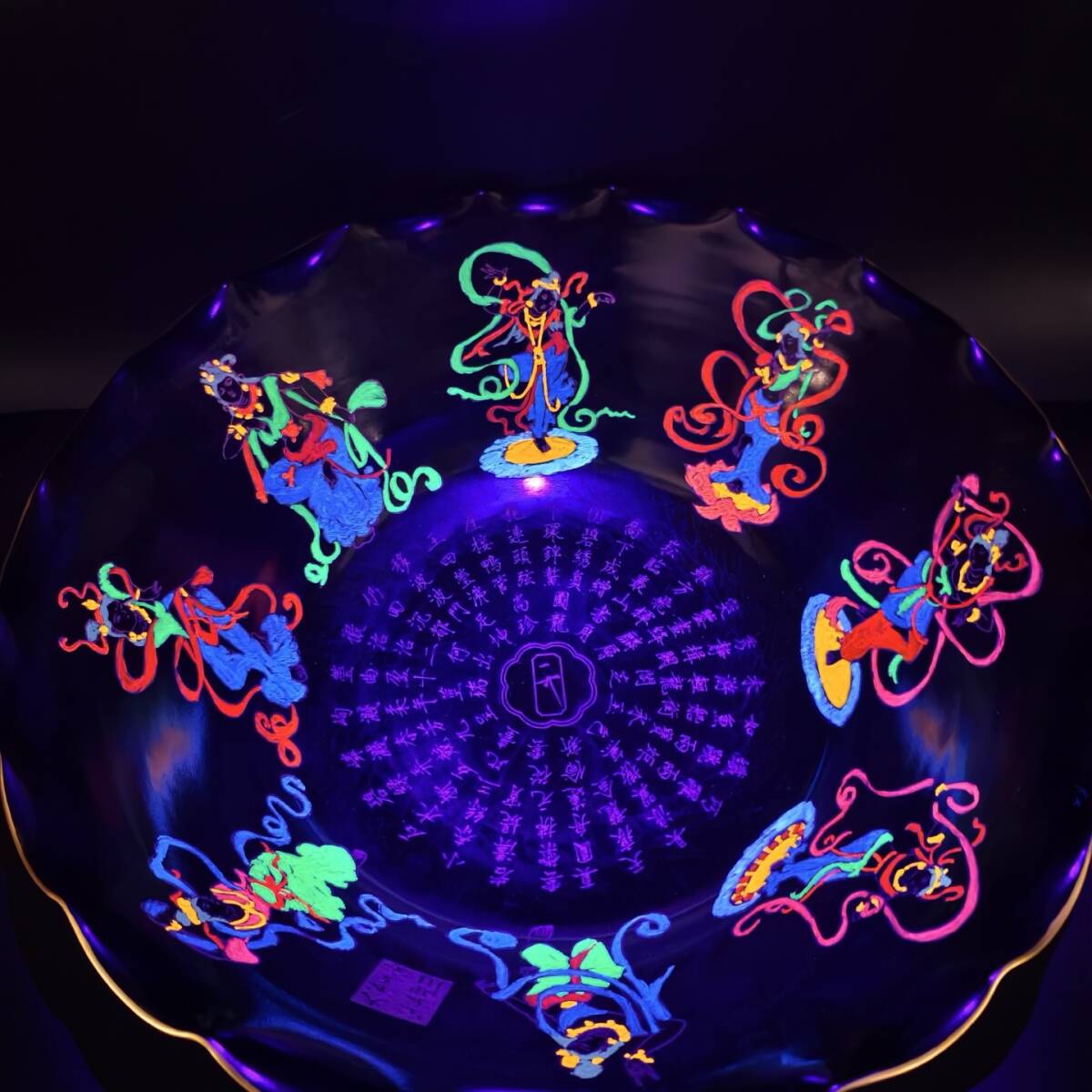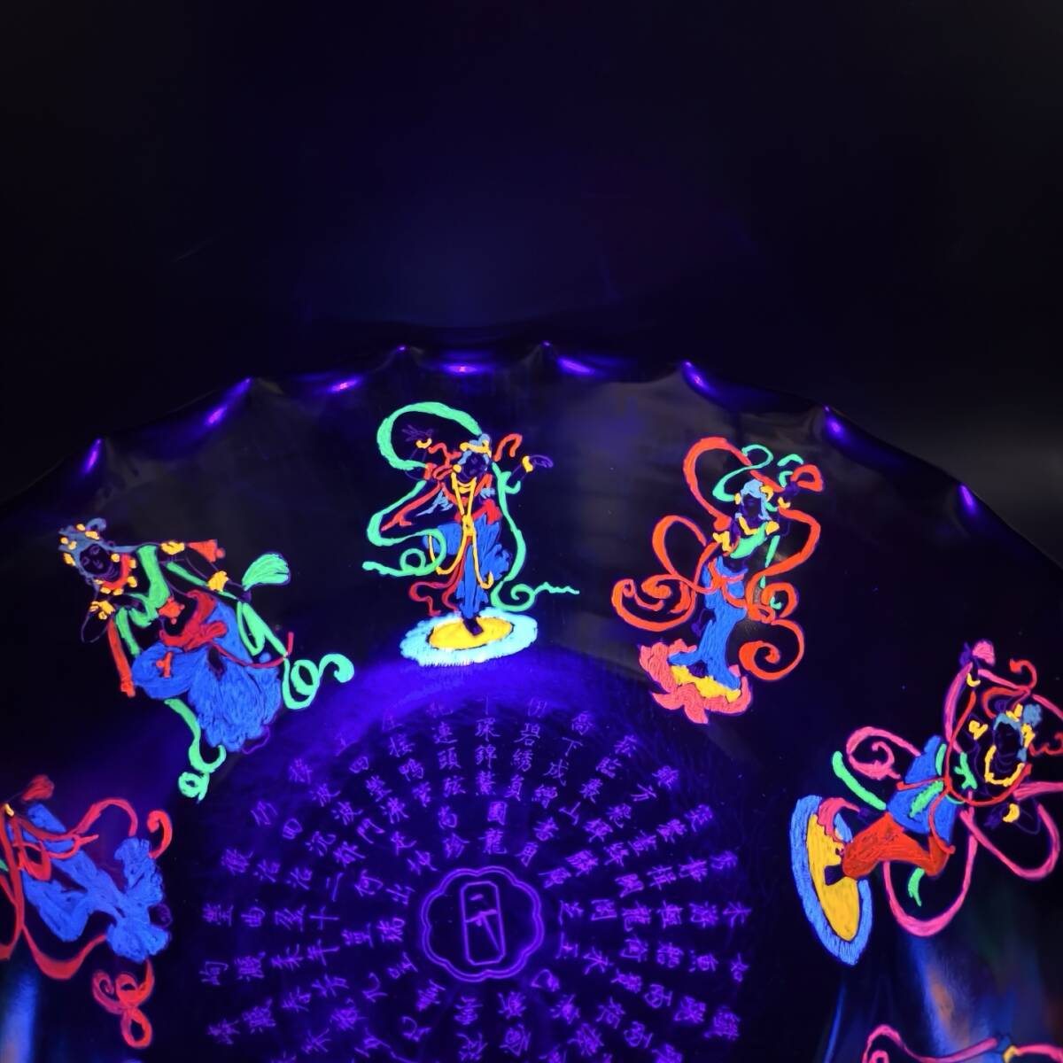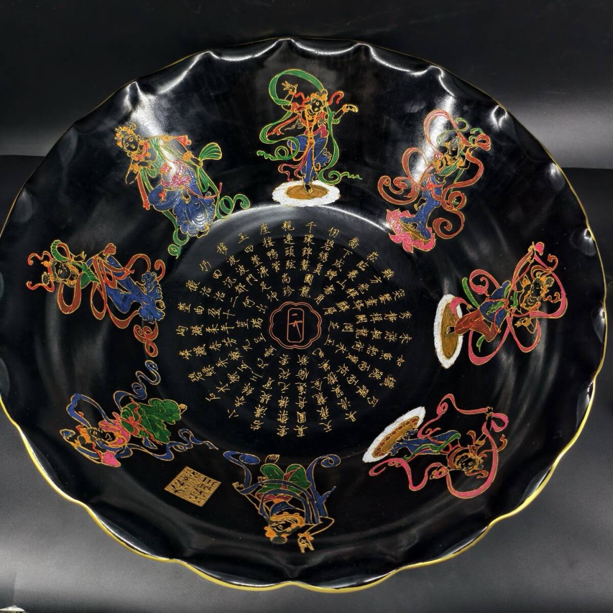秘藏 宋時代 時代物 汝窯 蒔絵金銘文 加彩夜光 飛天紋 花口碗 唐物 陶磁器 骨董品 中国美術 高さ17 cm 直径50 cm 古物保証 702
