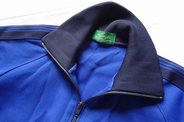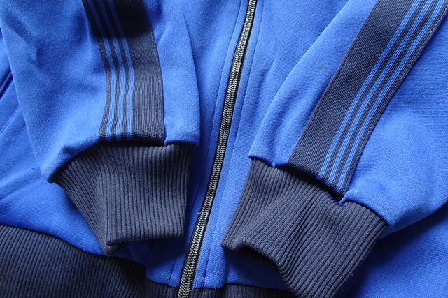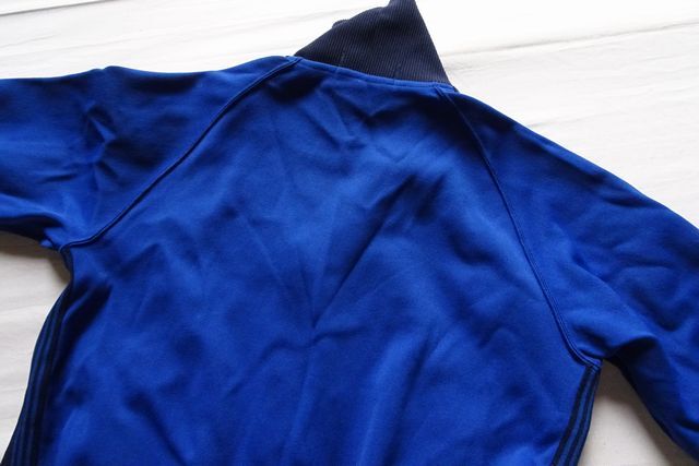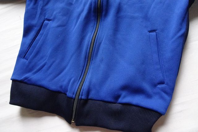 肩から袖にかけて、身頃脇部分、紺と青のラインテープ生地貼付け縫いです。