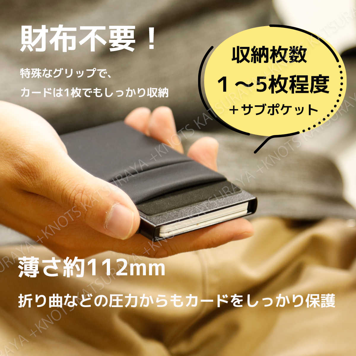 カードの取り出しレバーを側面に移動したことで片手操作が可能になり、ポケットから取り出すのと同時にカードがスライドできます。収納は押し込むだけでいつもスマートに。大切な情報を守るスキミング防止機能、アルミケースはでは折り曲げや圧迫からもカードを守ります。