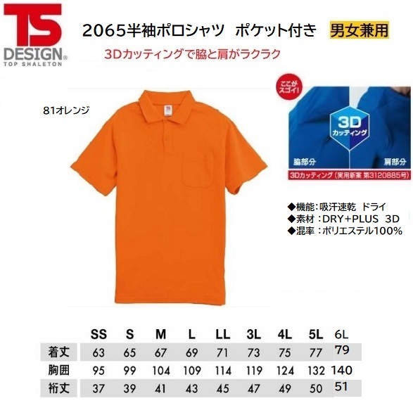 [ネコポス発送/1枚]★TSDESIGN 2065半袖ポロシャツ ポケット付き【81オレンジ・5Lサイズ】定価3000程度の品、即決880円!!