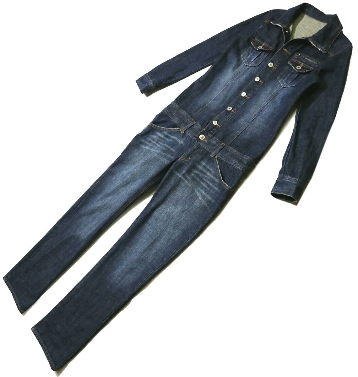 ・春や秋、晩秋や初冬あたりでも着用頂けそうです。フロントは上着部がボタン、パンツ部ジッパー、袖先は2つのボタン留めです。パンツ部はローライズ系の作りです。