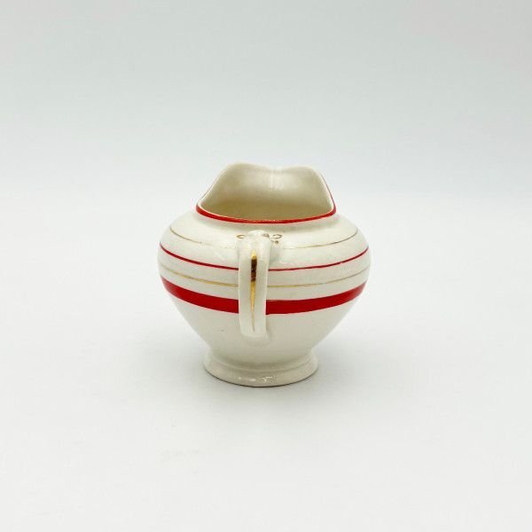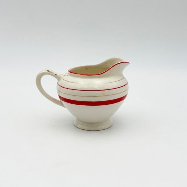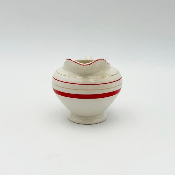 ぽってりとした丸みのあるフォルムに、赤いラインがぐるりと施され、シンプルでありながら視線を引きつける印象的なデザインとなっています。小ぶりながらも存在感があり、食卓に置くだけでどこか懐かしく温かな空気が広がる一品です。やや艶のあるアイボリーの釉薬に、ハンドペイントで引かれた鮮やかなラインがアクセントとなり、使い込まれた陶肌からは時を経た美しさと品格がにじみ出ています。