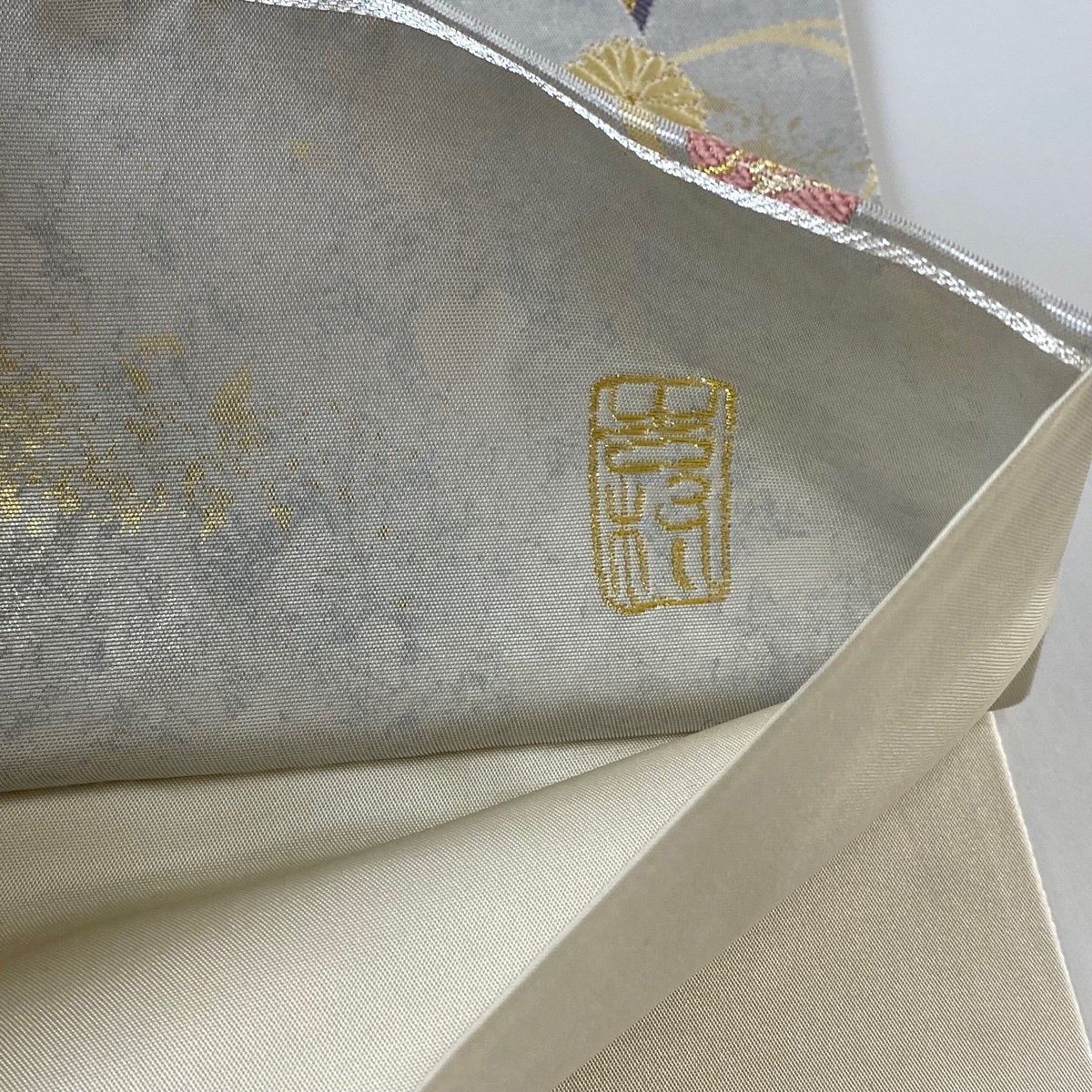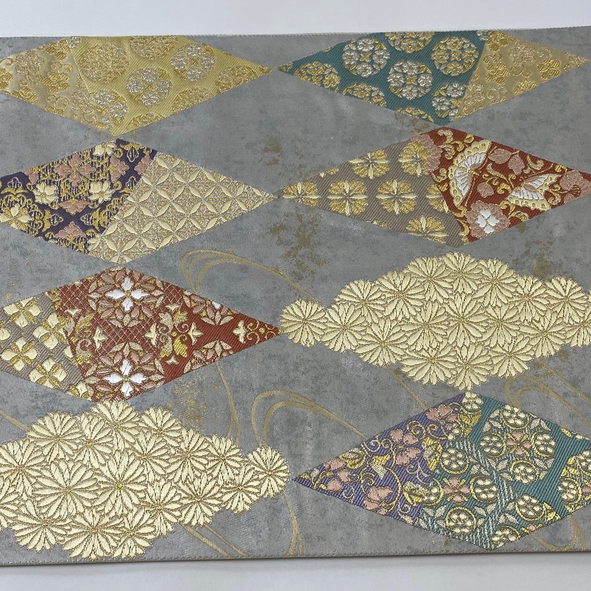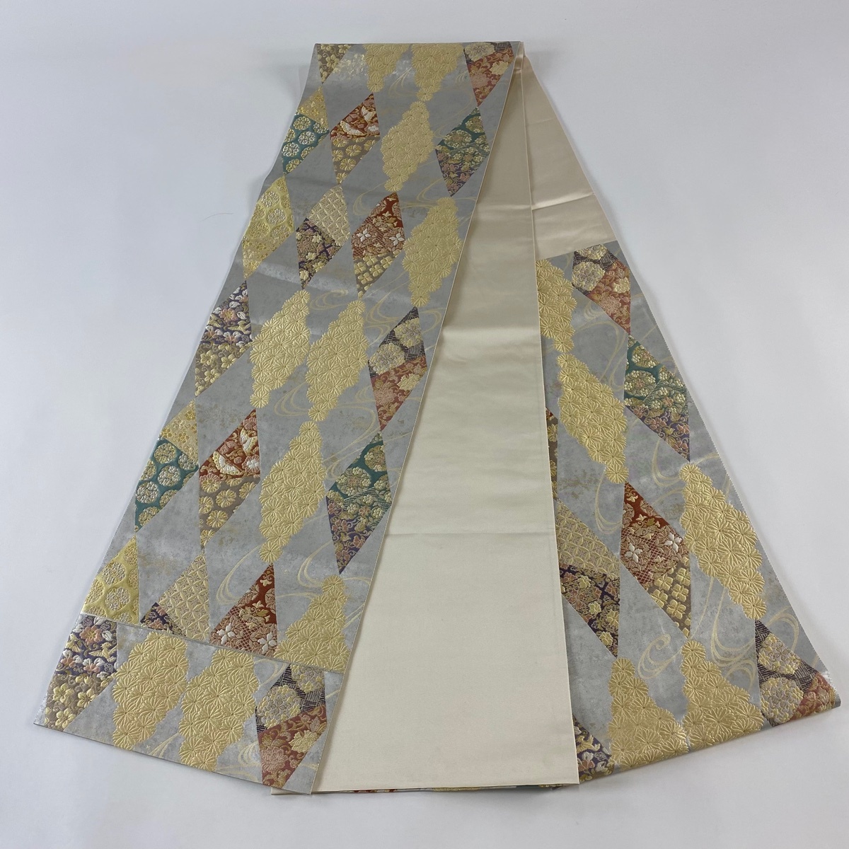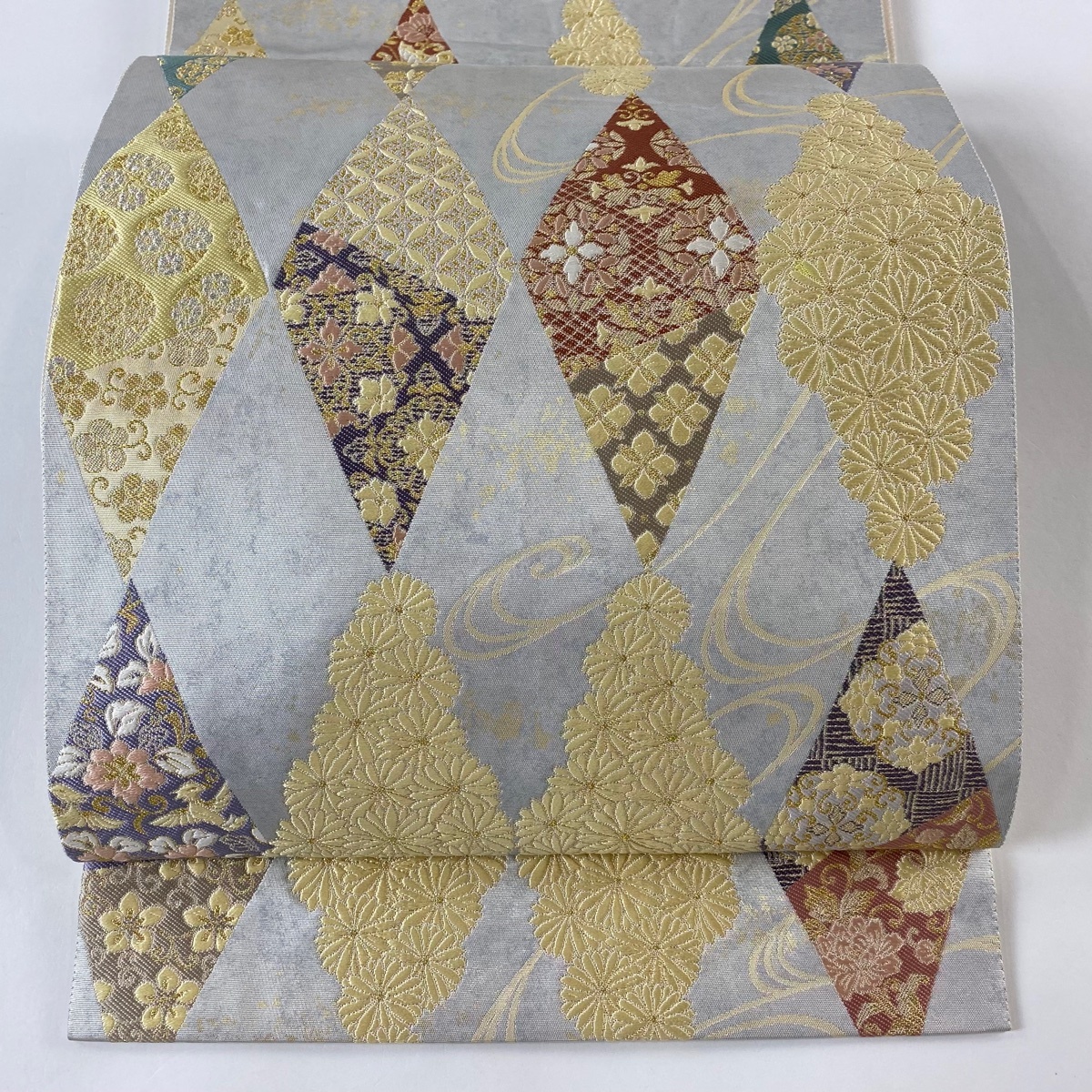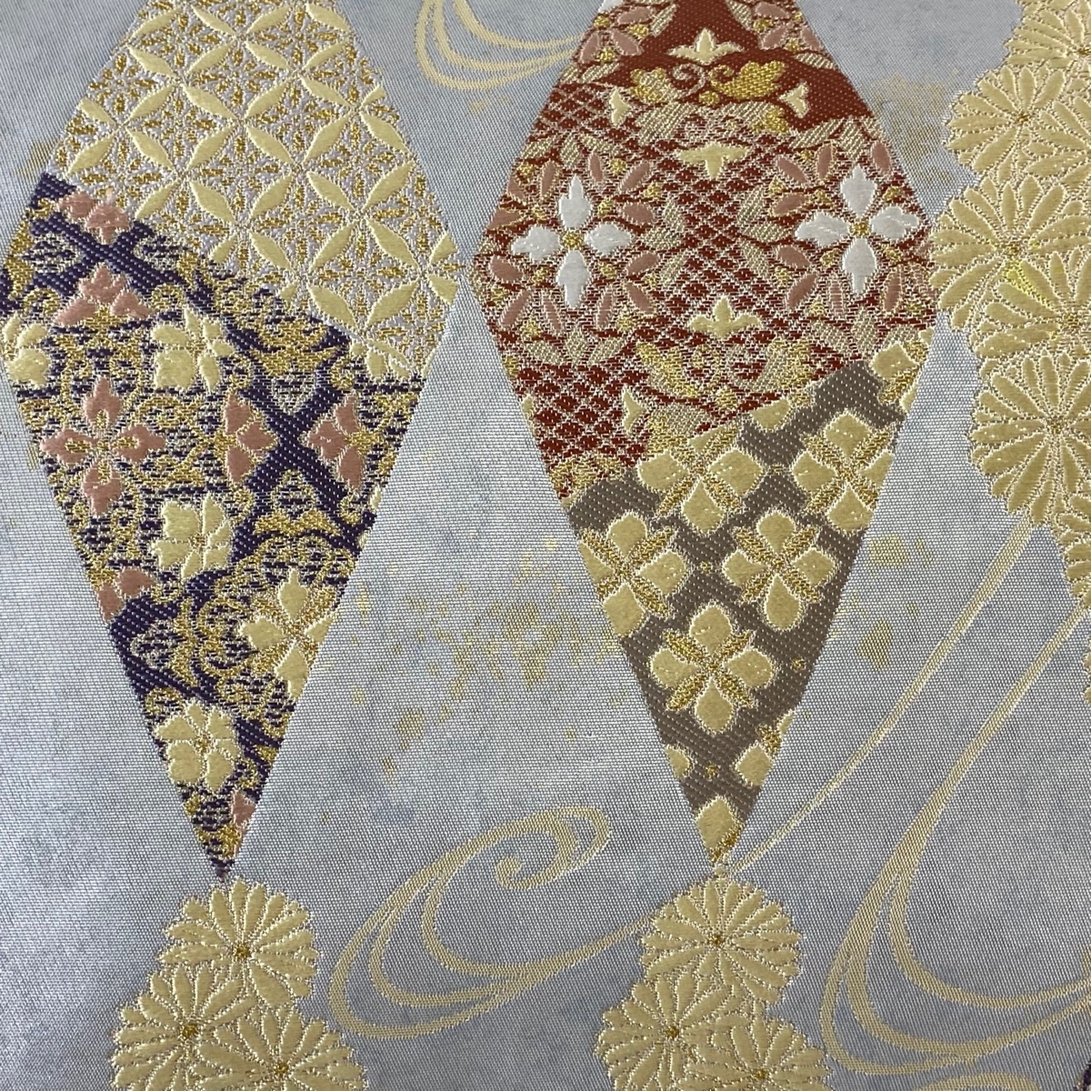 | 袋帯 美品 名品 落款 菱 花 金銀糸 箔 銀色 六通 正絹 【中古】 |