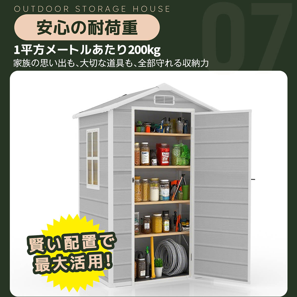 • 【大容量でしっかり収納】コンパクトサイズで 1900Lの容量のモノを収納可能。ガーデン用具や季節ごとのアイテムなど、室内で置きにくいものもスッキリ片付けられます。