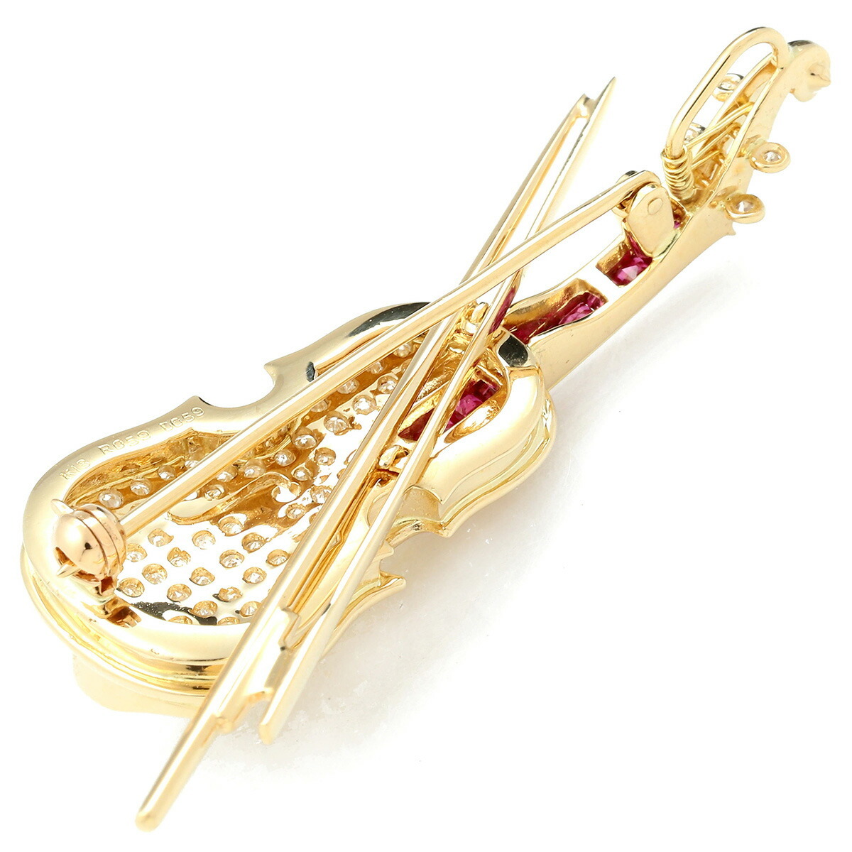 優雅な音色を彷彿とさせる、バイオリンをかたどった繊細なデザインのブローチ。情熱的なルビーと繊細な輝きを放つダイヤモンドをあしらい、洗練された美しさを引き立てます。パーティーやセレモニーといった特別な場にはもちろん、音楽会・演奏会など音にまつわるシーンにもぴったりなジュエリーです。